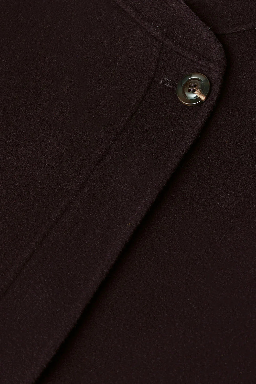 Abric de tall curt i folgat , confeccionat amb llana gruixuda de doble cara que aporta estructura i calidesa. El coll asimètric i l' obertura semioculta amb botons realcen un disseny modern i depurat. Inclou dues butxaques aplicades davanteres i mànigues llargues de línia arrodonida , perfectes per a un look elegant i contemporani.