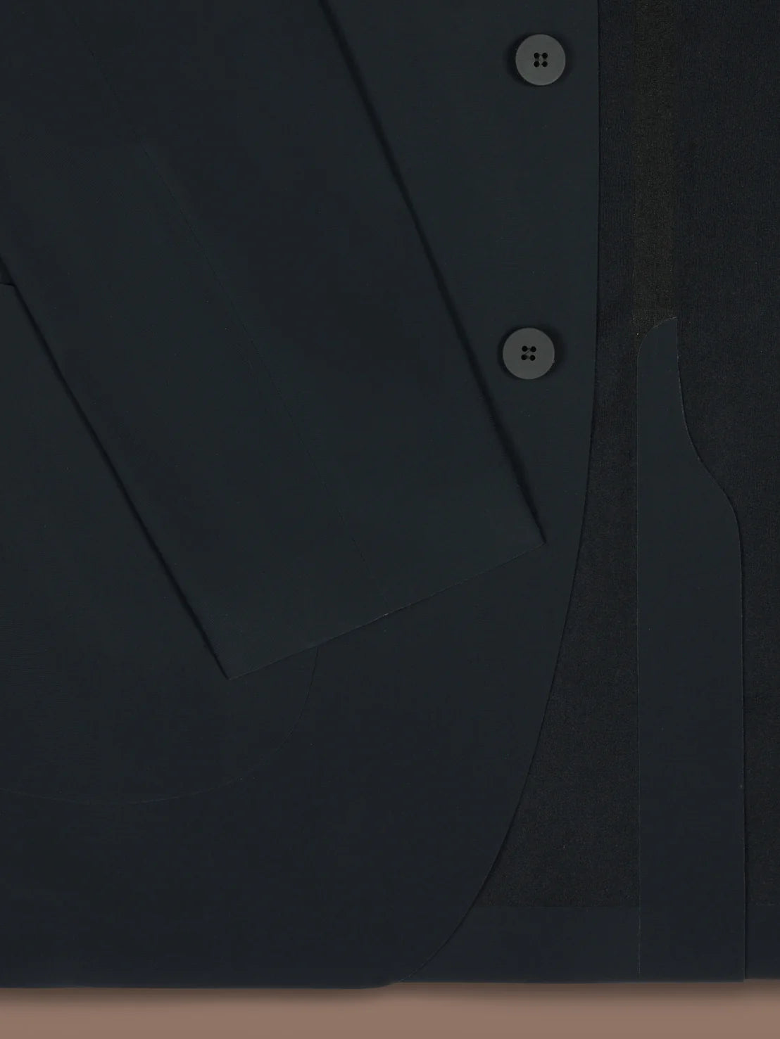 El model s'estilitza gràcies al tancament de dos botons i les solapes estretes, amb un pegat lateral i una butxaca al pit.