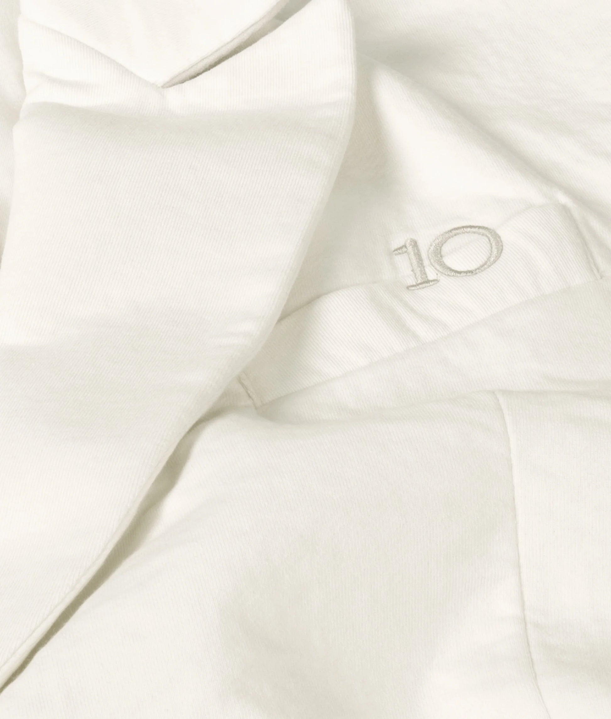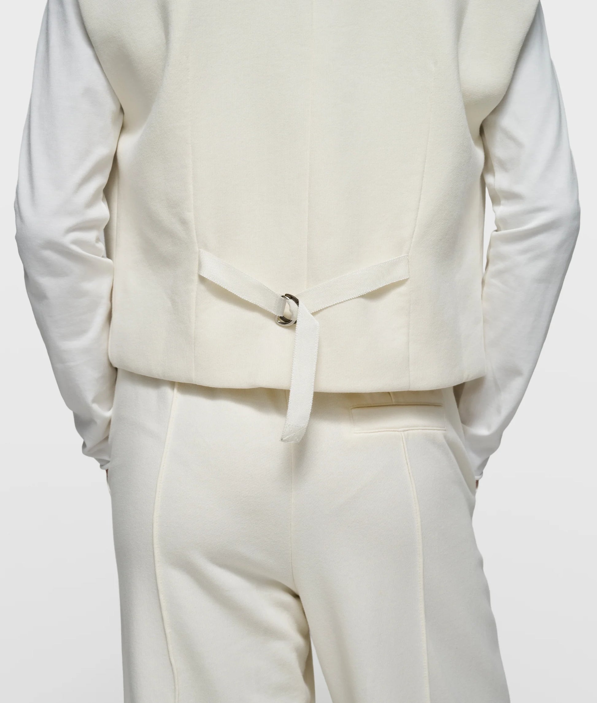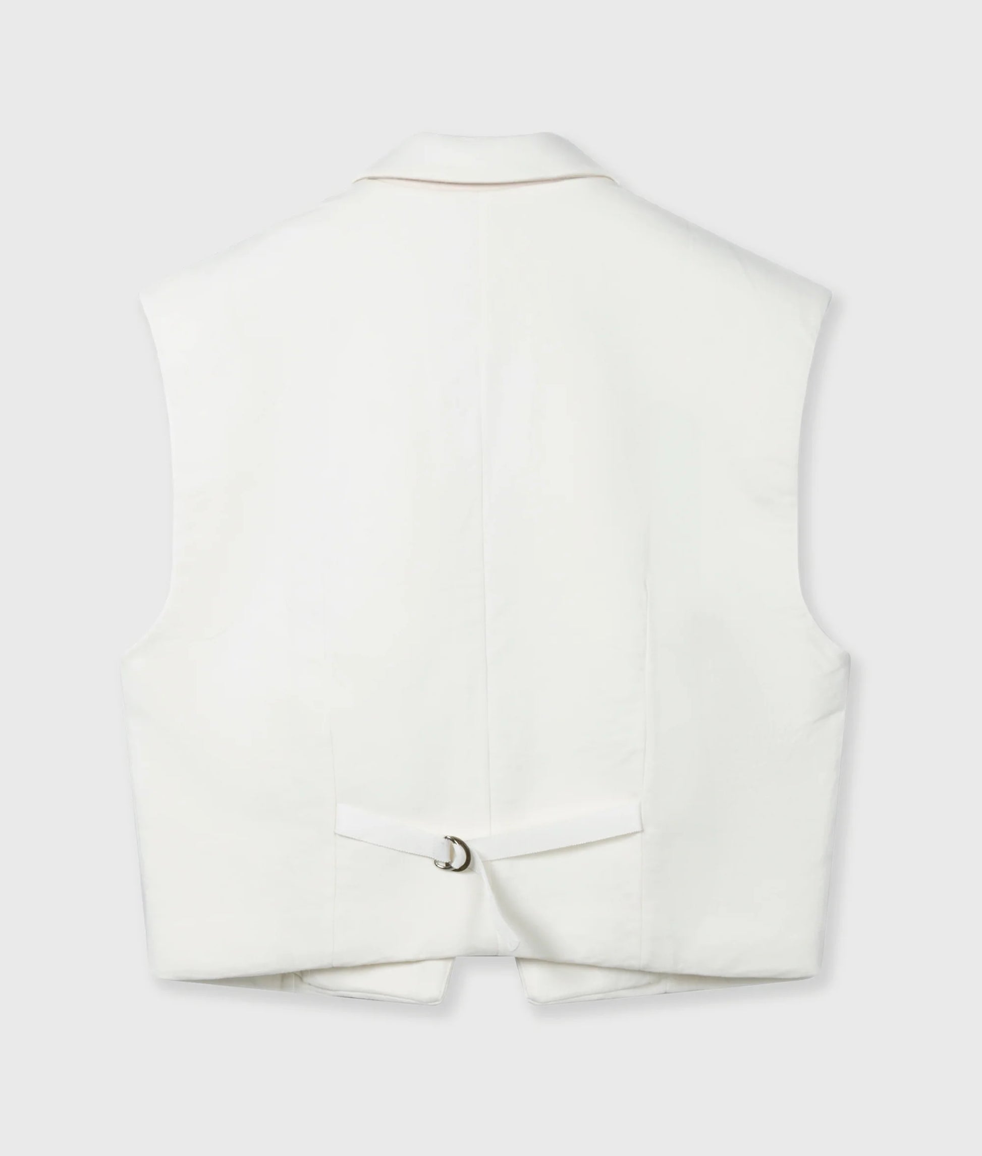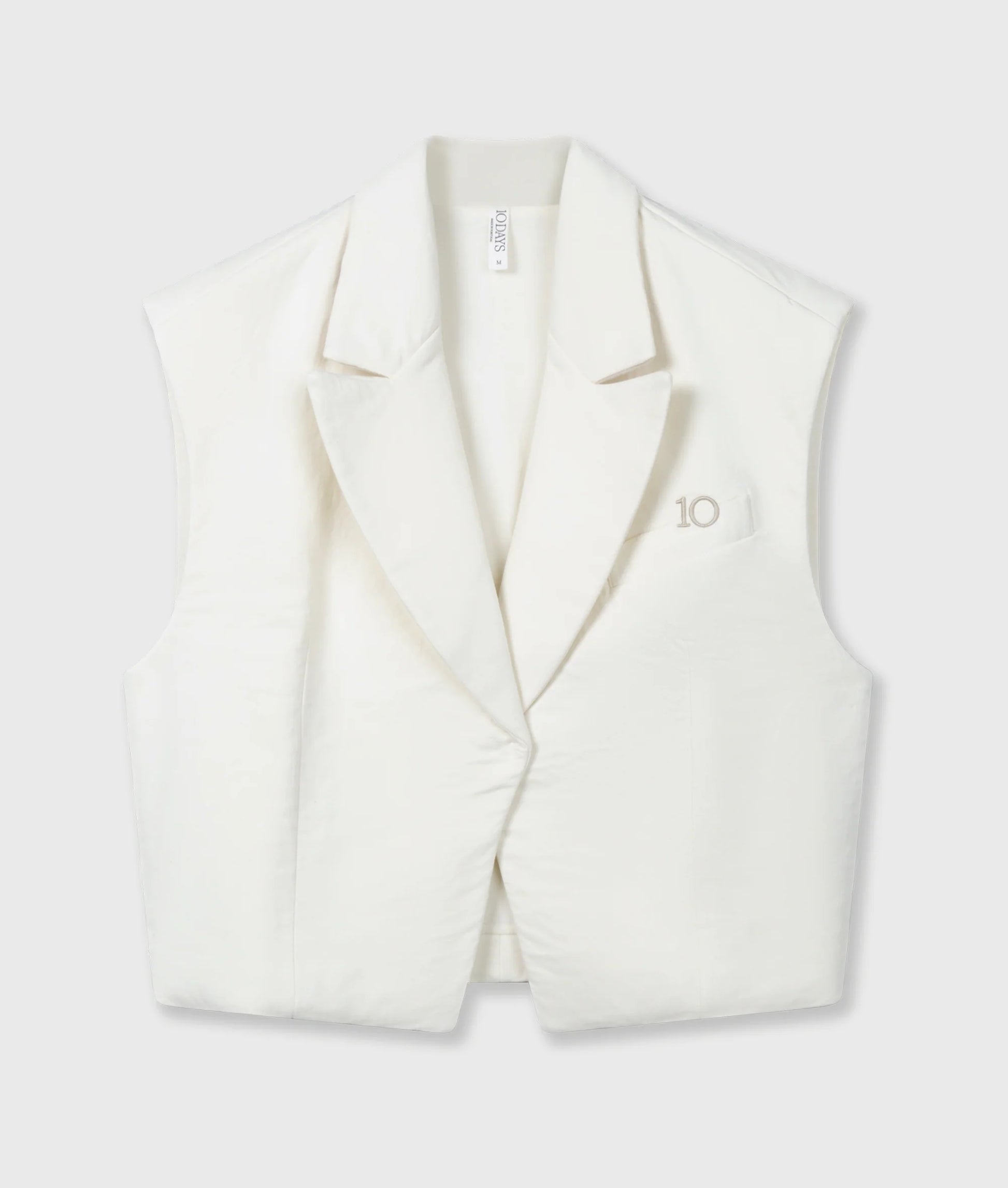 Blazer sin mangas de corte holgado, confeccionado en una suave mezcla de algodón y poliéster. Cuenta con cuello, un falso bolsillo en el pecho con el monograma «10» bordado en relieve y una hebilla ajustable en la espalda.