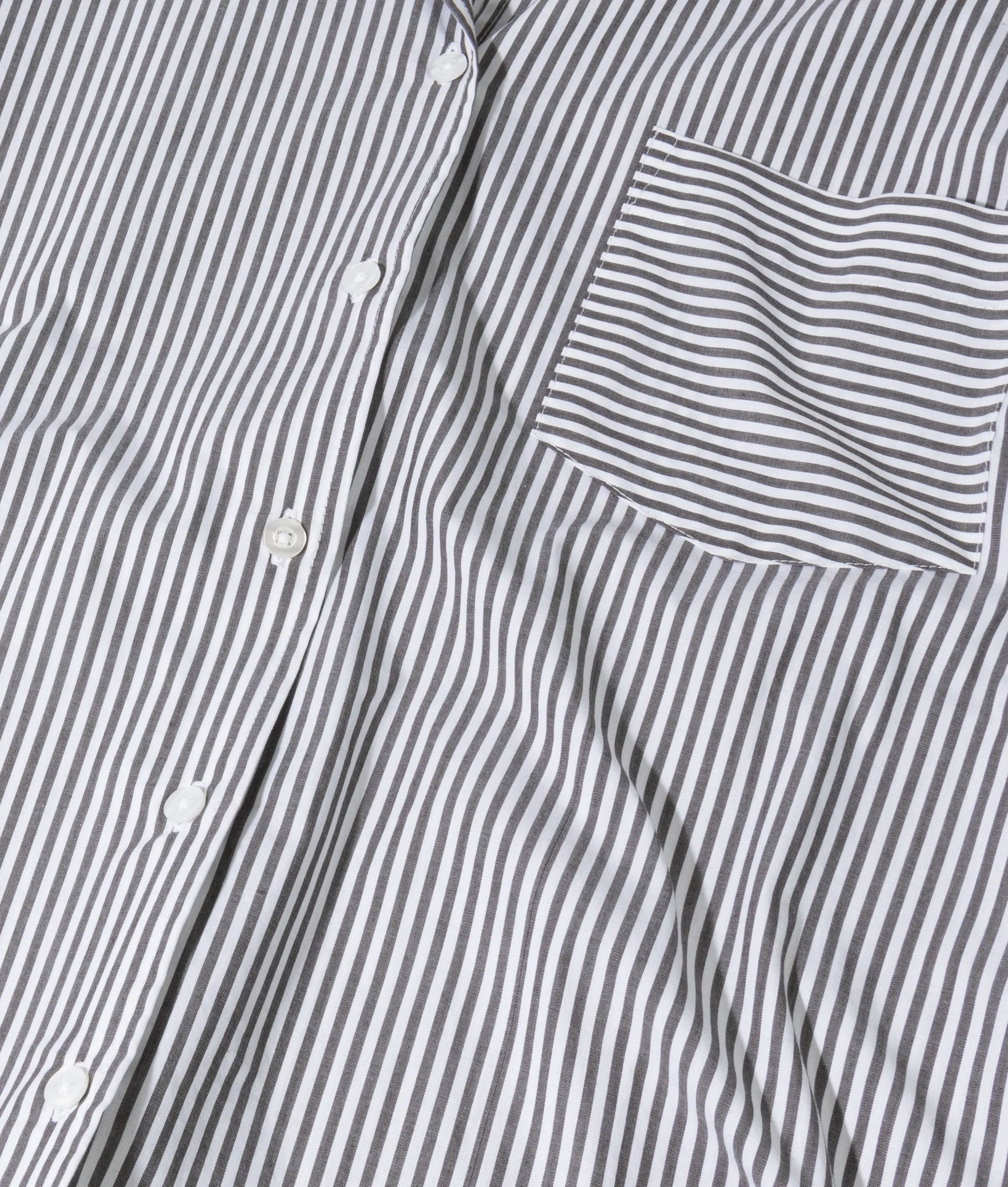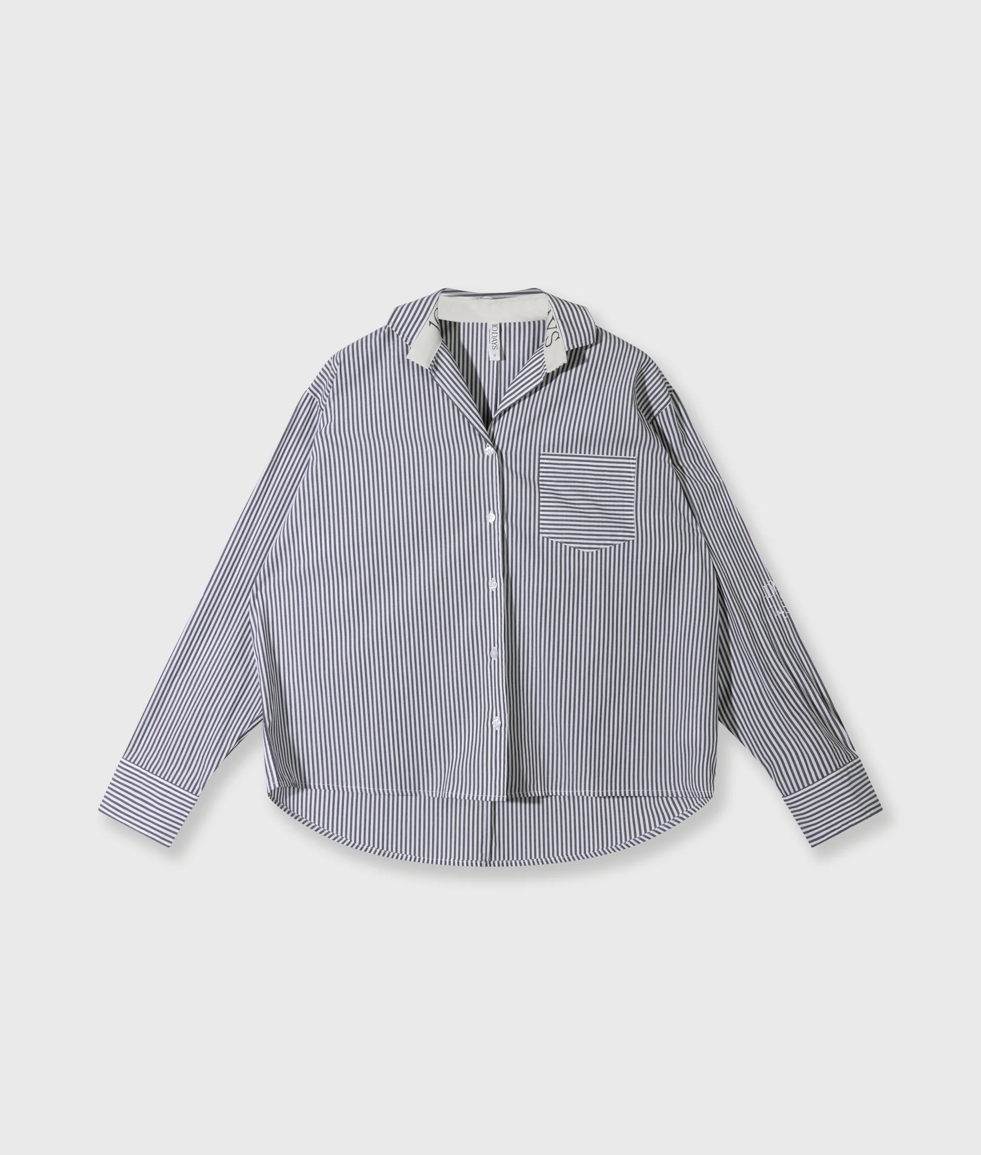 Blusa de corte holgado a rayas, confeccionada en algodón orgánico con certificación GOTS. Cuenta con cierre de botones, bolsillo de parche en el pecho, puños abotonados y estampado «curly 10» en ambas mangas.