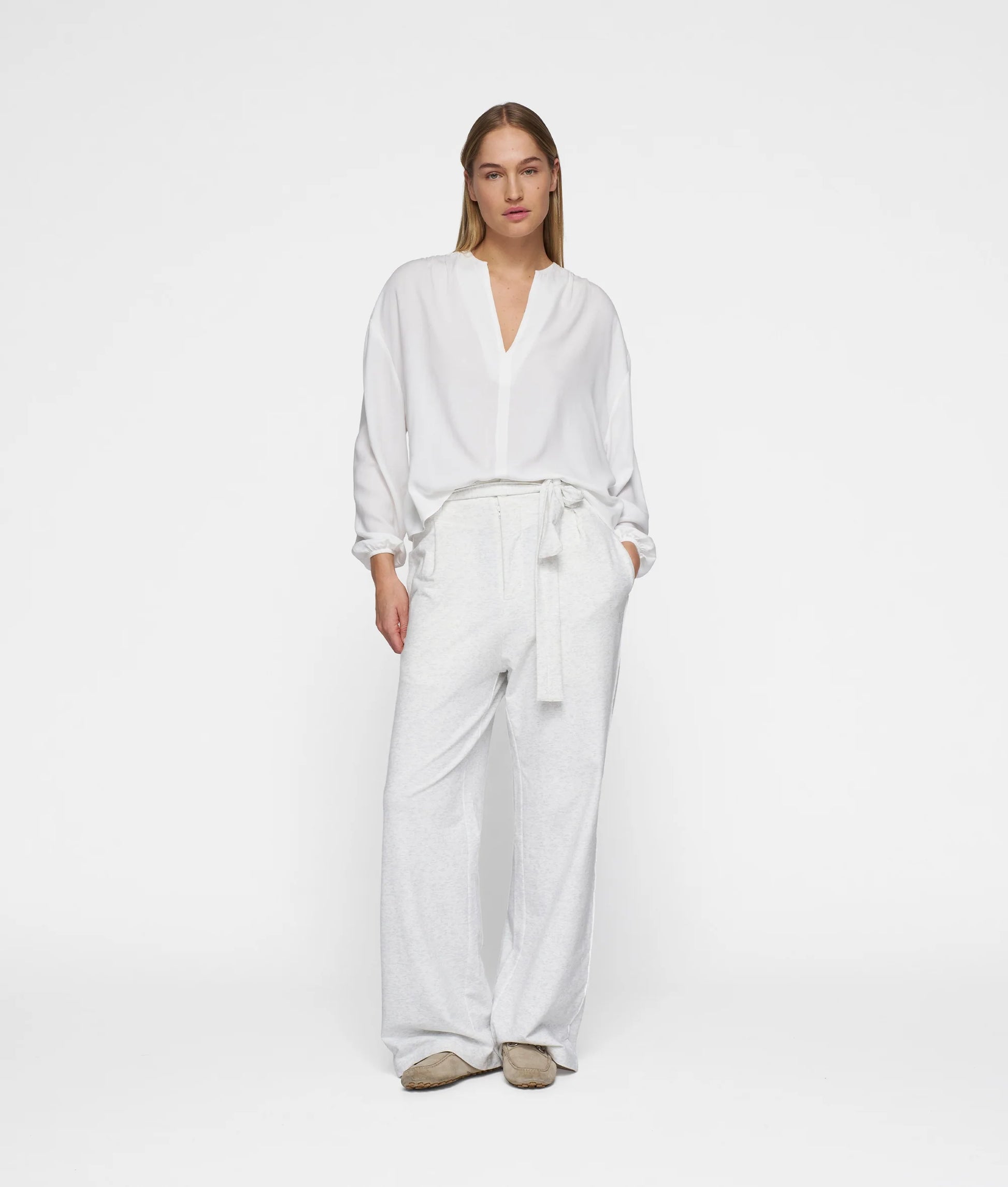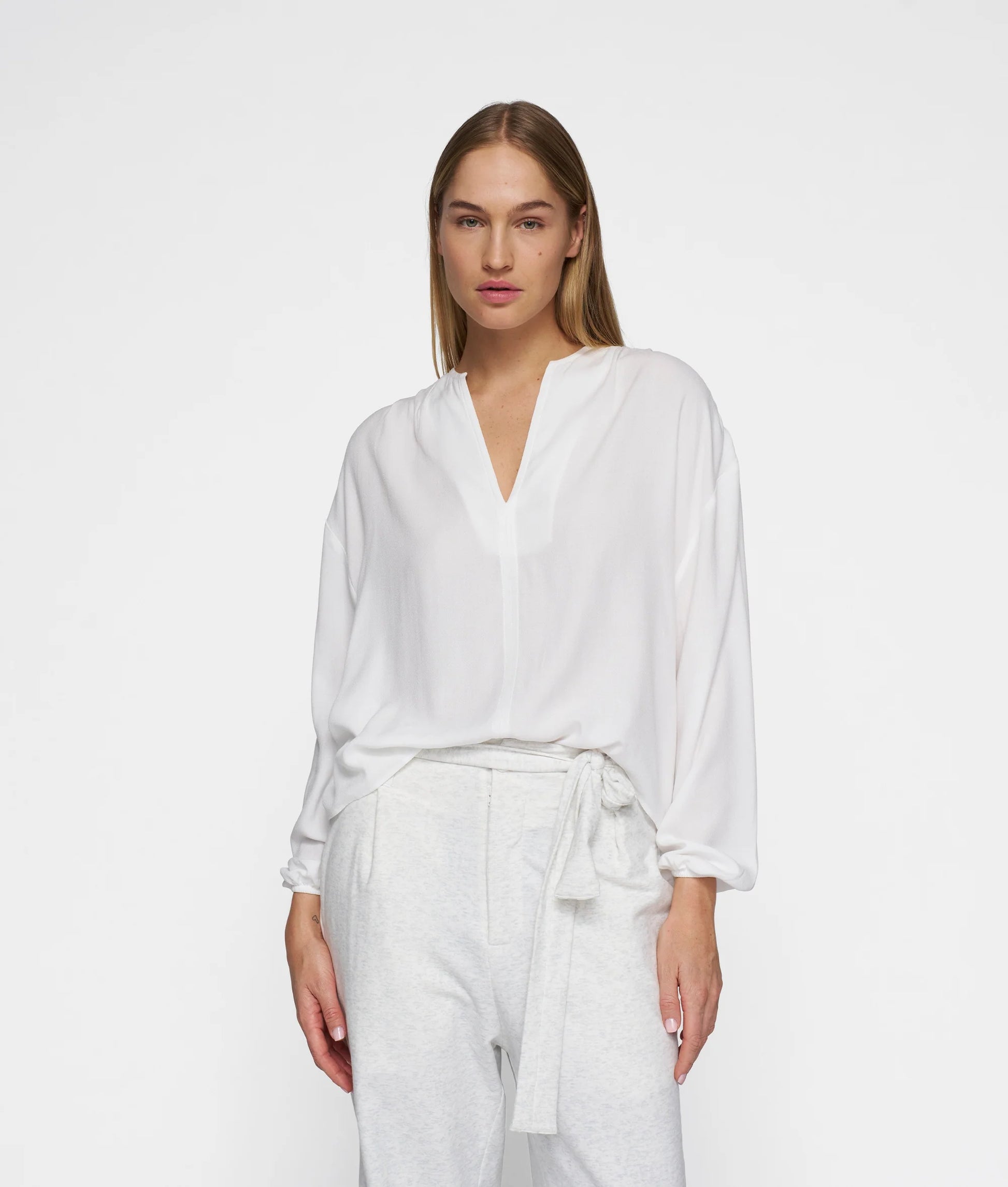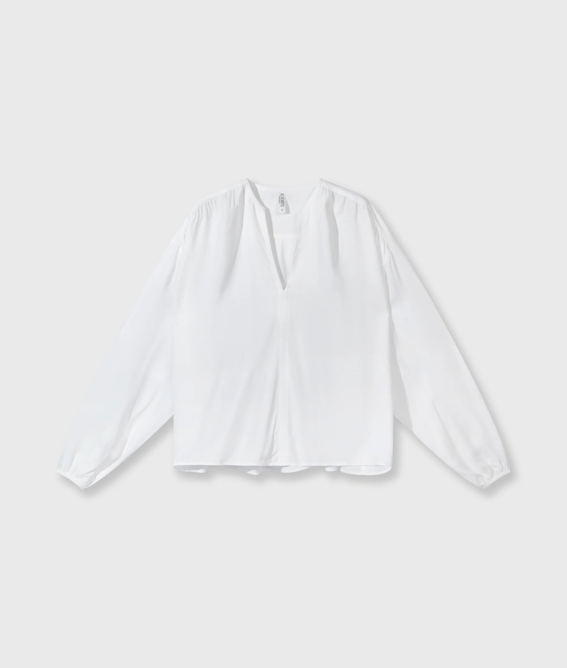 Brusa fluida de tall oversize confeccionada amb viscosa brillant. Amb mànigues acampanades inclinades, coll rodó ample i etiqueta amb el monograma «10» a l'esquena.
