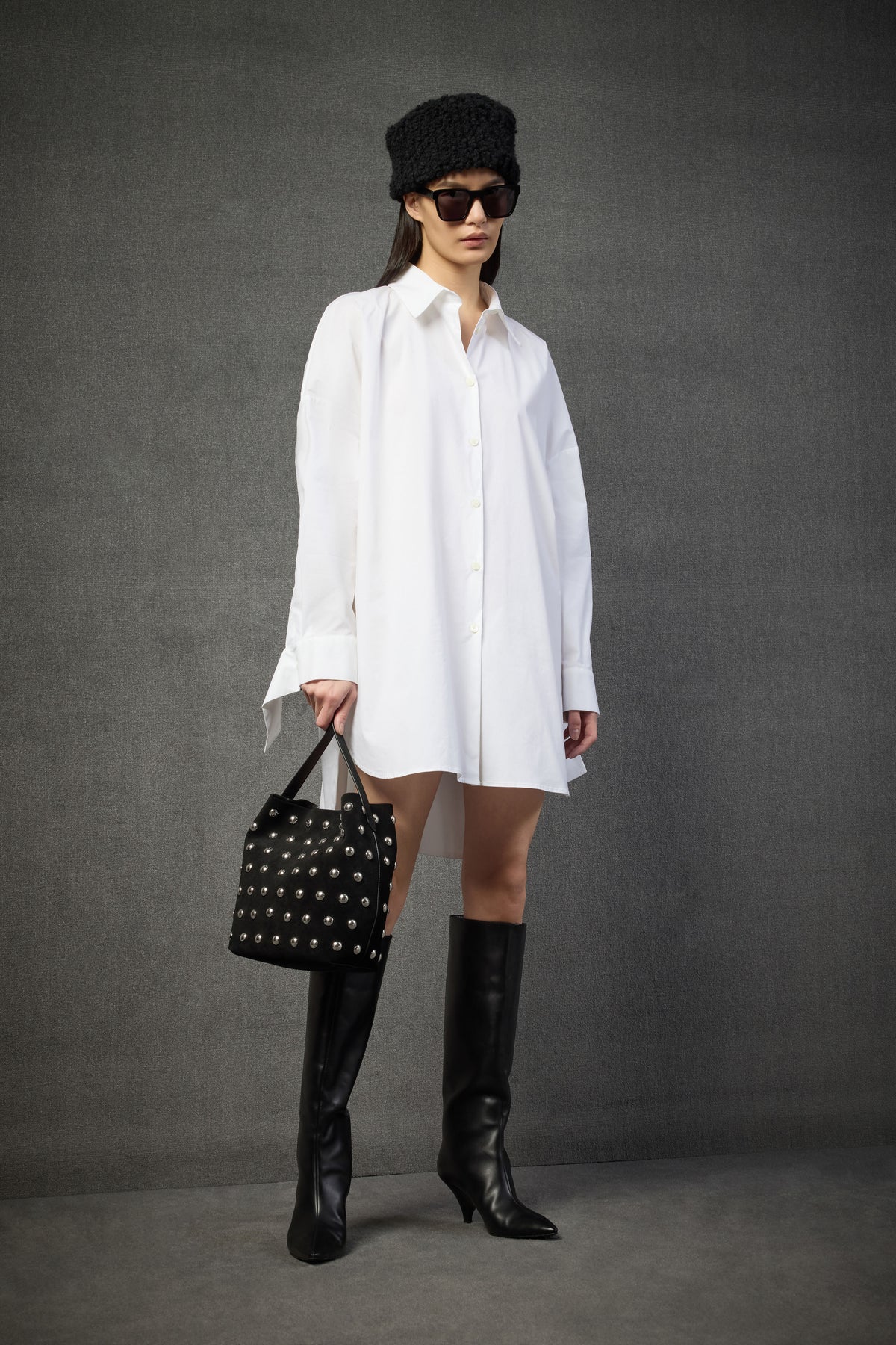 Camisa de cotó oversize amb coll clàssic, màniga llarga i punys amples. Presenta una cara d'escordada asimètrica parcial, una vora arrodonida més curta per davant i més llarga per darrere, i una butxaca aplicada a l'esquena.