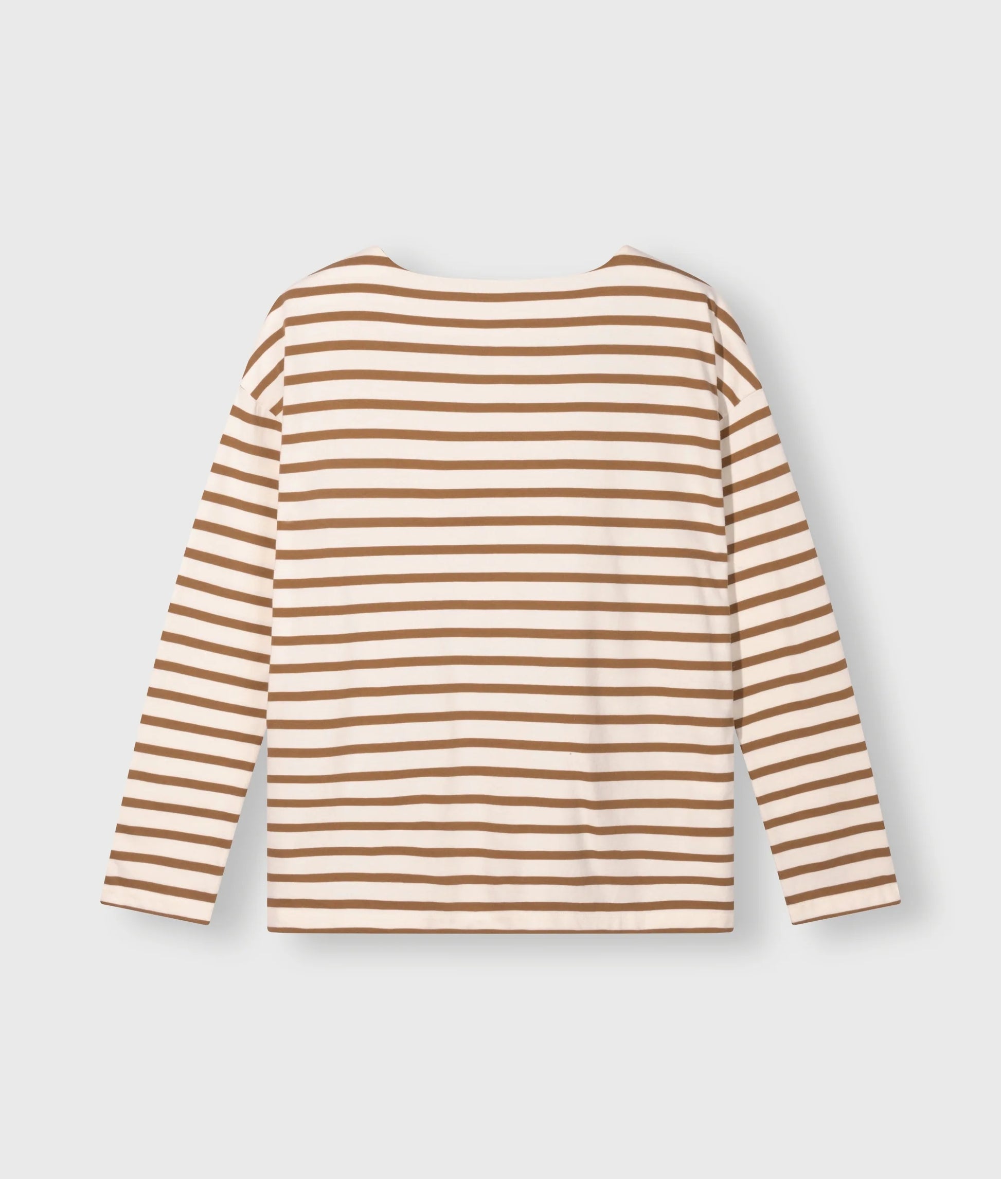 Top oversize a rayas, confeccionado en suave algodón orgánico con certificación GOTS. Presenta un amplio cuello barco, pequeñas aberturas laterales, hombros caídos, un estampado «10DAYS» en el pecho y un monograma «10» bordado en la manga izquierda.