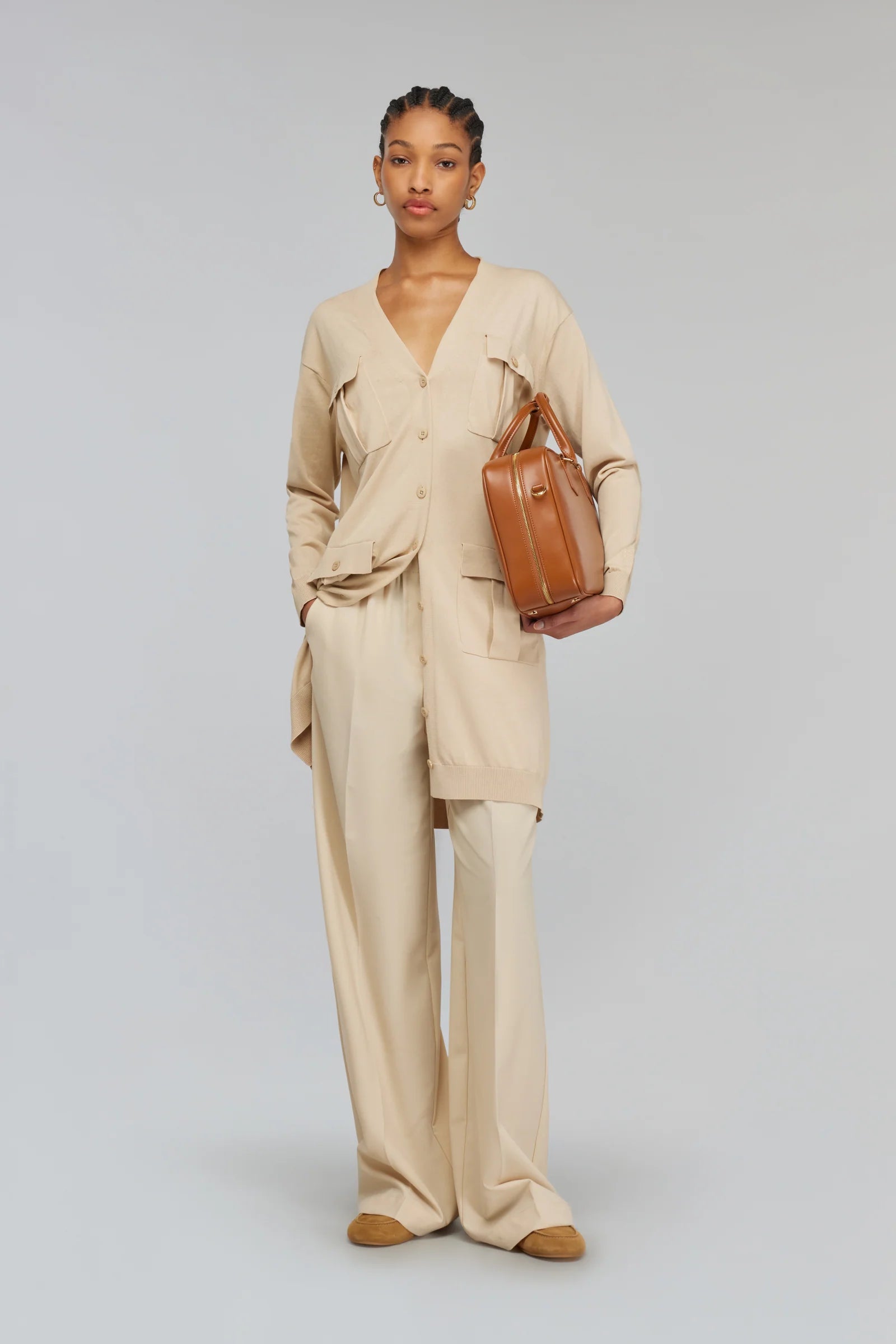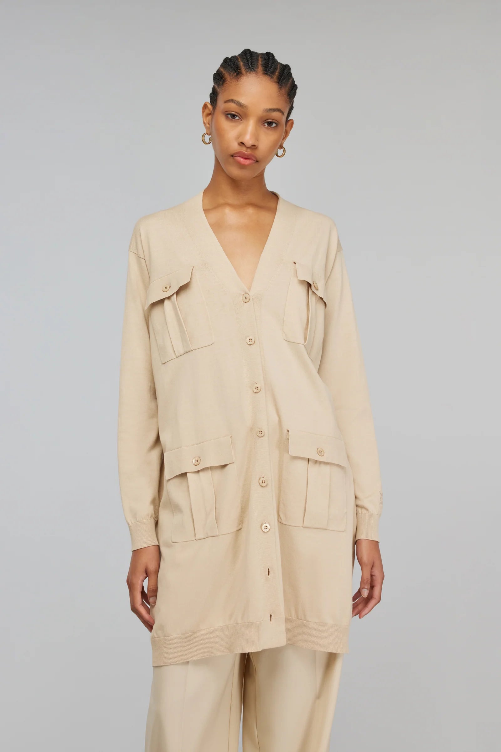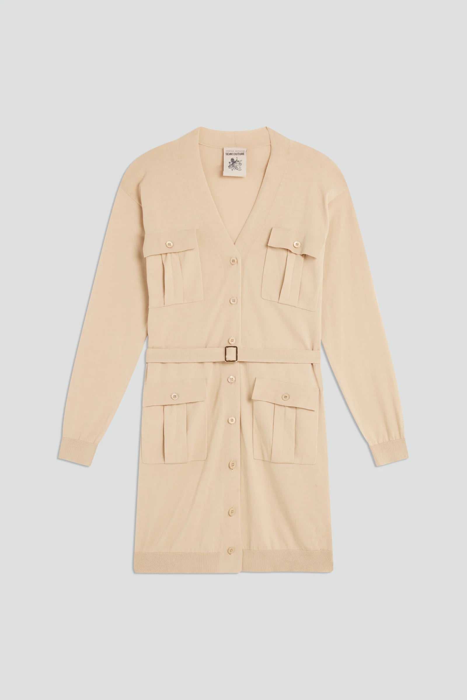 Càrdigan de cotó llis, model amb coll de bec i màniga llarga. Quatre butxaques amb solapa i manxa. Botonat davanter. Logotip brodat to sobre to. Cinturó inclòs a la peça. Tall regular.