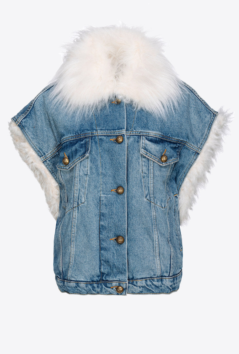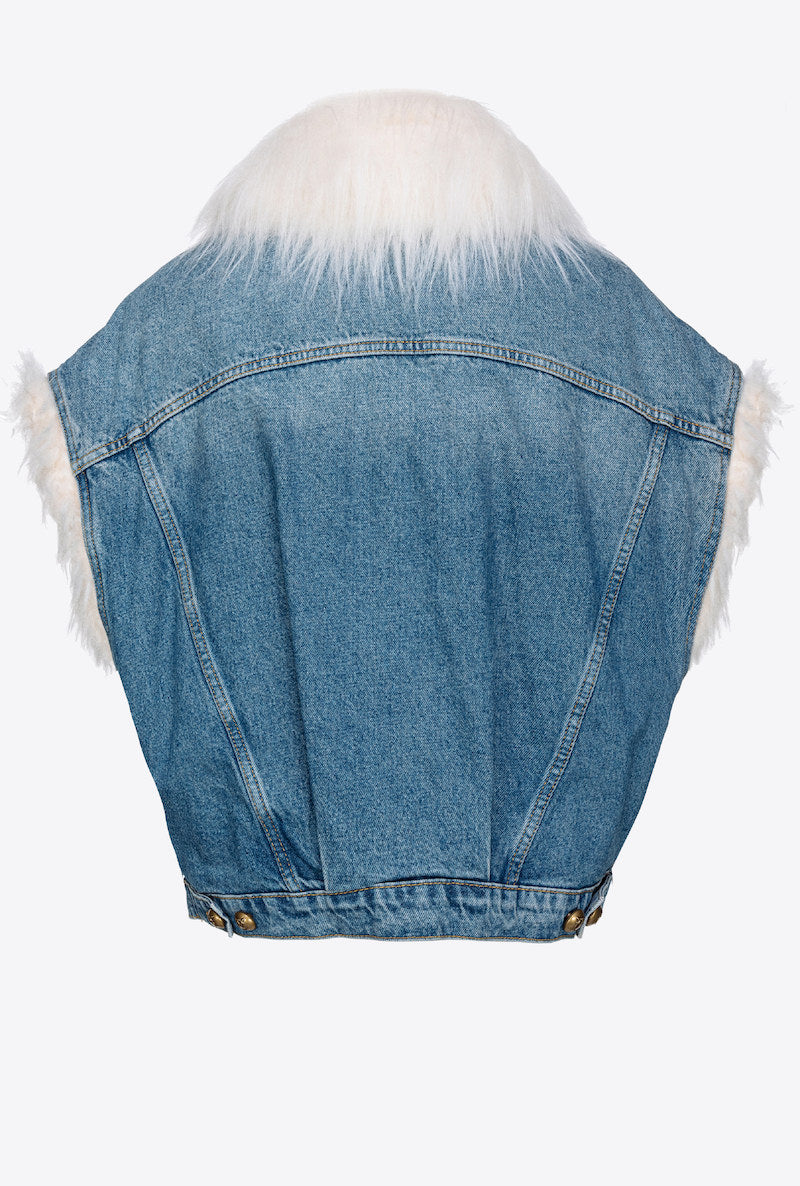 Caçadora sense mànigues de denim efecte desgastat amb detalls de pèl sintètic al coll ia la sisa. Butxaques amb solapa de punta i tanca amb botons metàl·lics personalitzats amb el logotip Love Birds.
