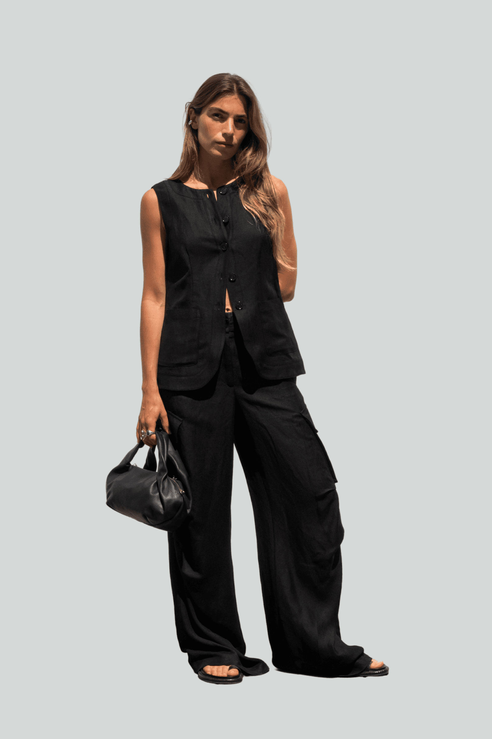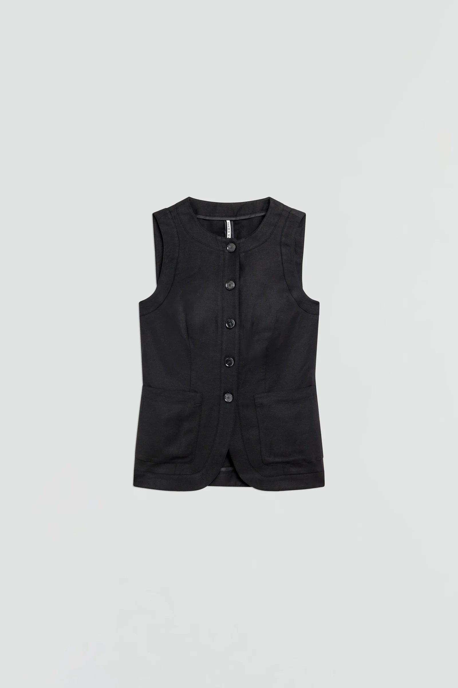 Armilla de lli-viscosa, coll rodó, cises, tancament davanter amb botons, butxaques aplicades davanteres, sota arrodonida.