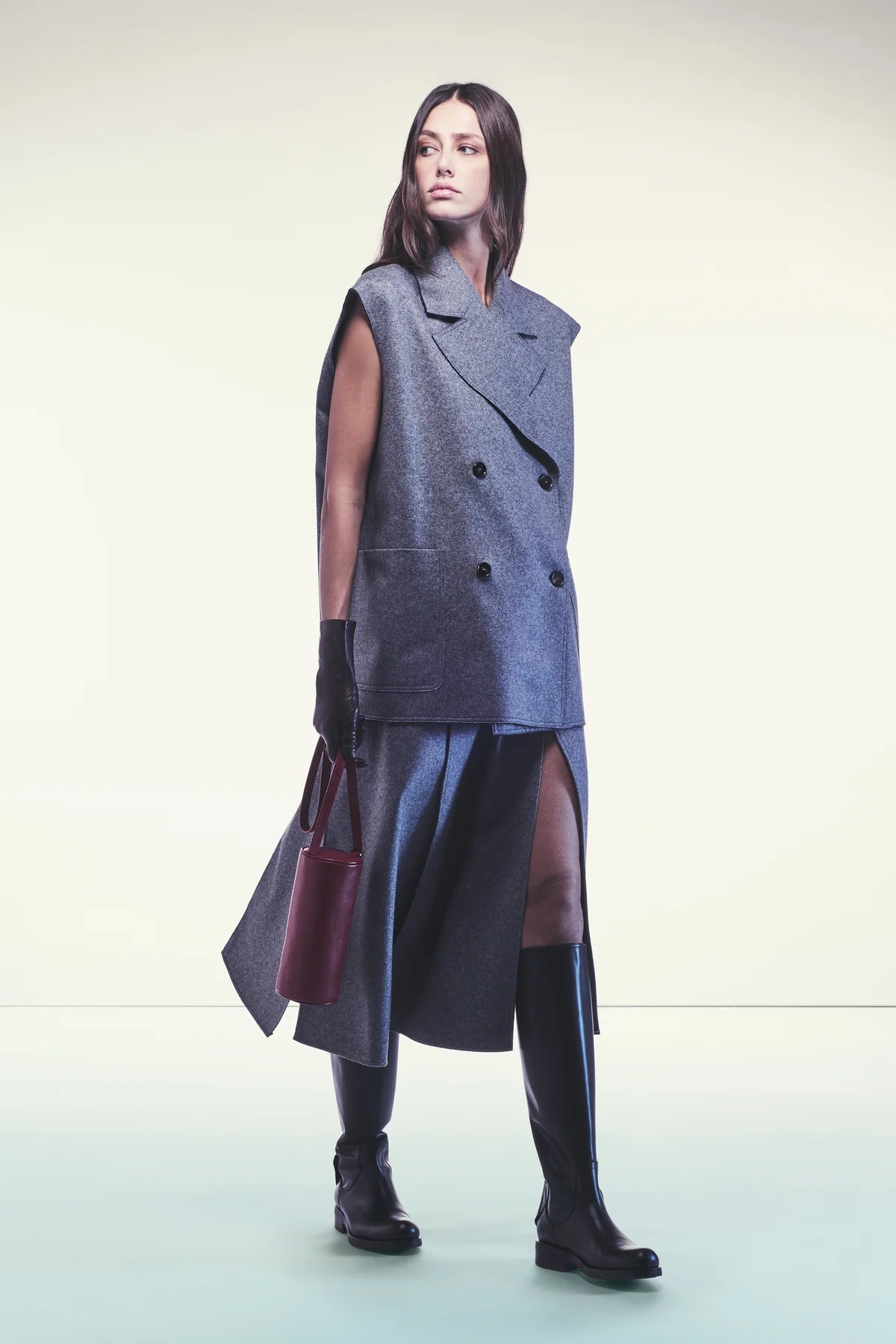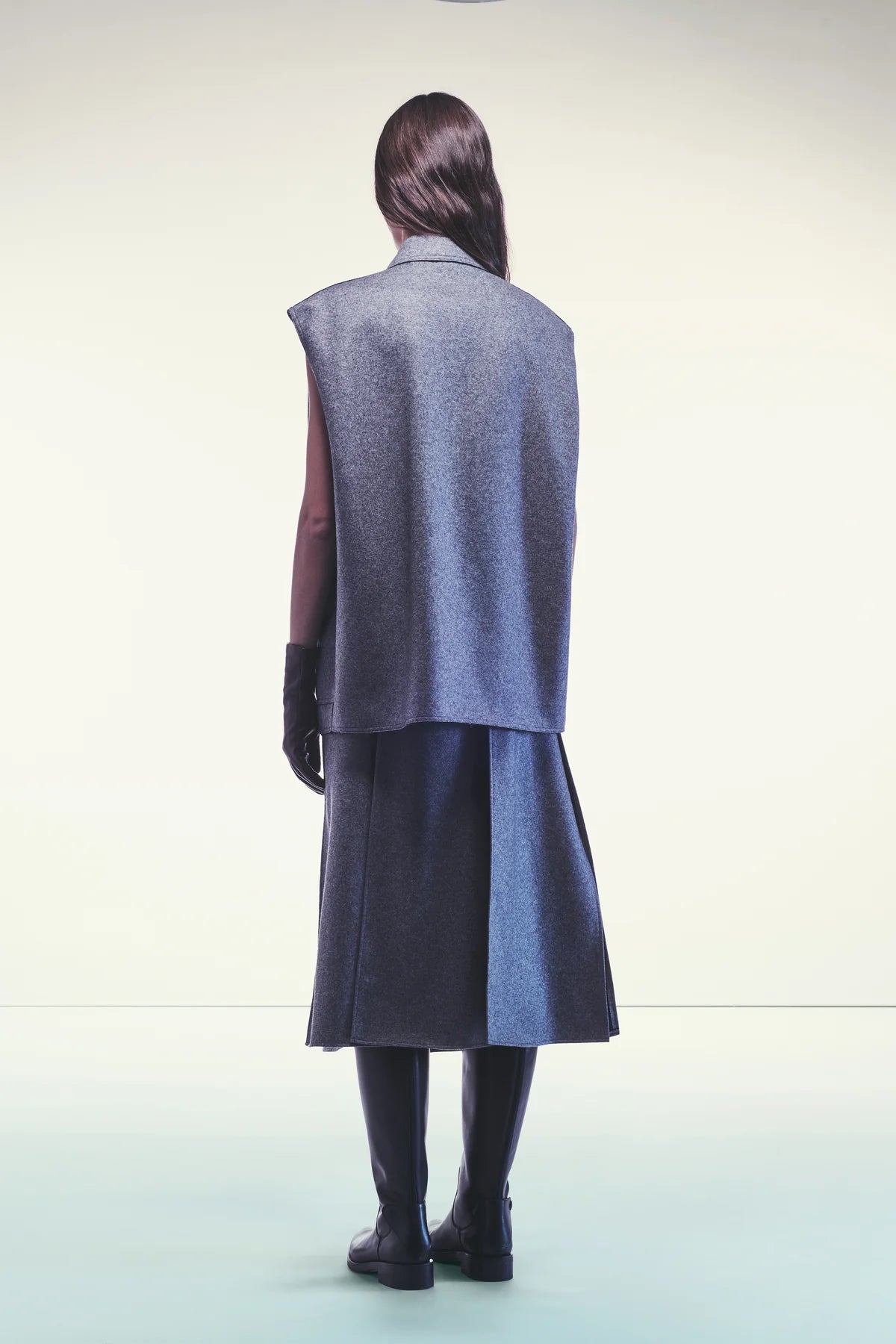 Armilla encaixada de doble cara en teixit de caixmir lleugera, amb coll de solapa i butxaques inclinades. Tall recte, longitud mitjana. Tancament amb botons to sobre to.