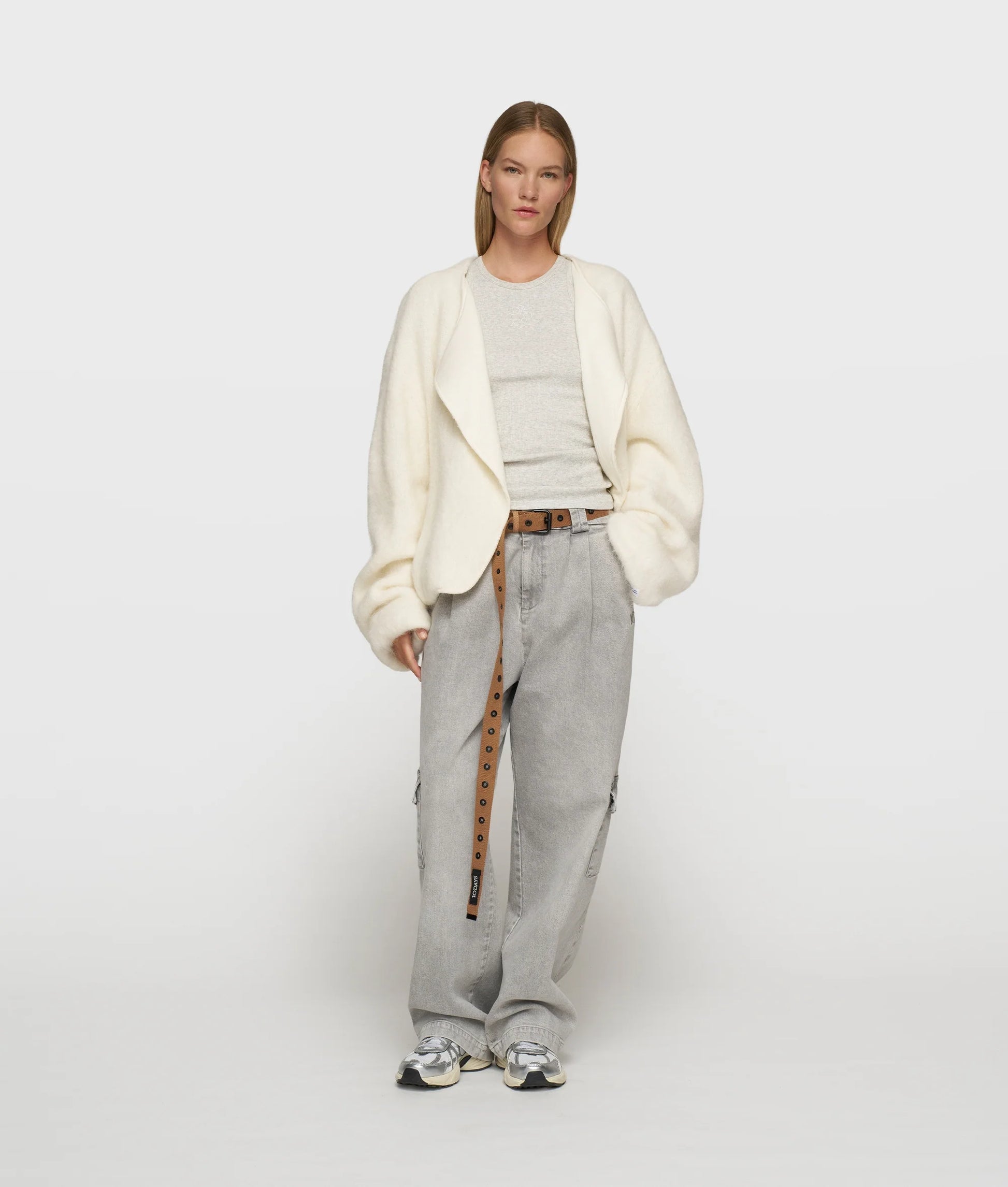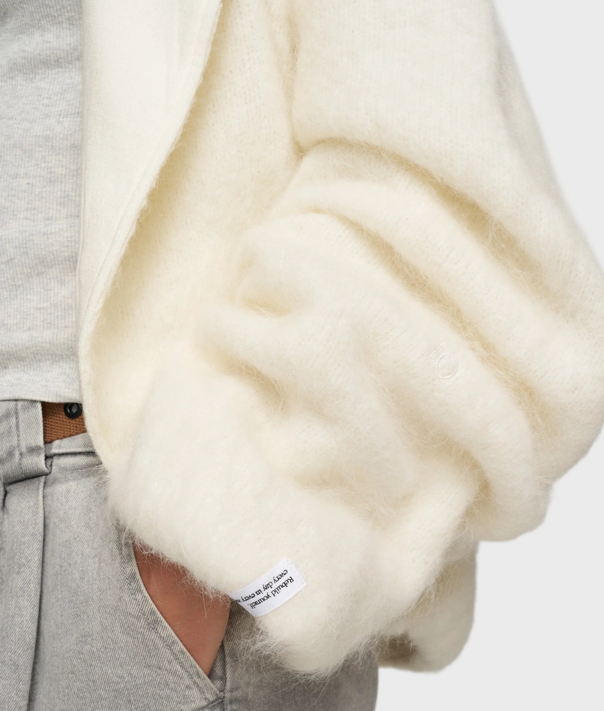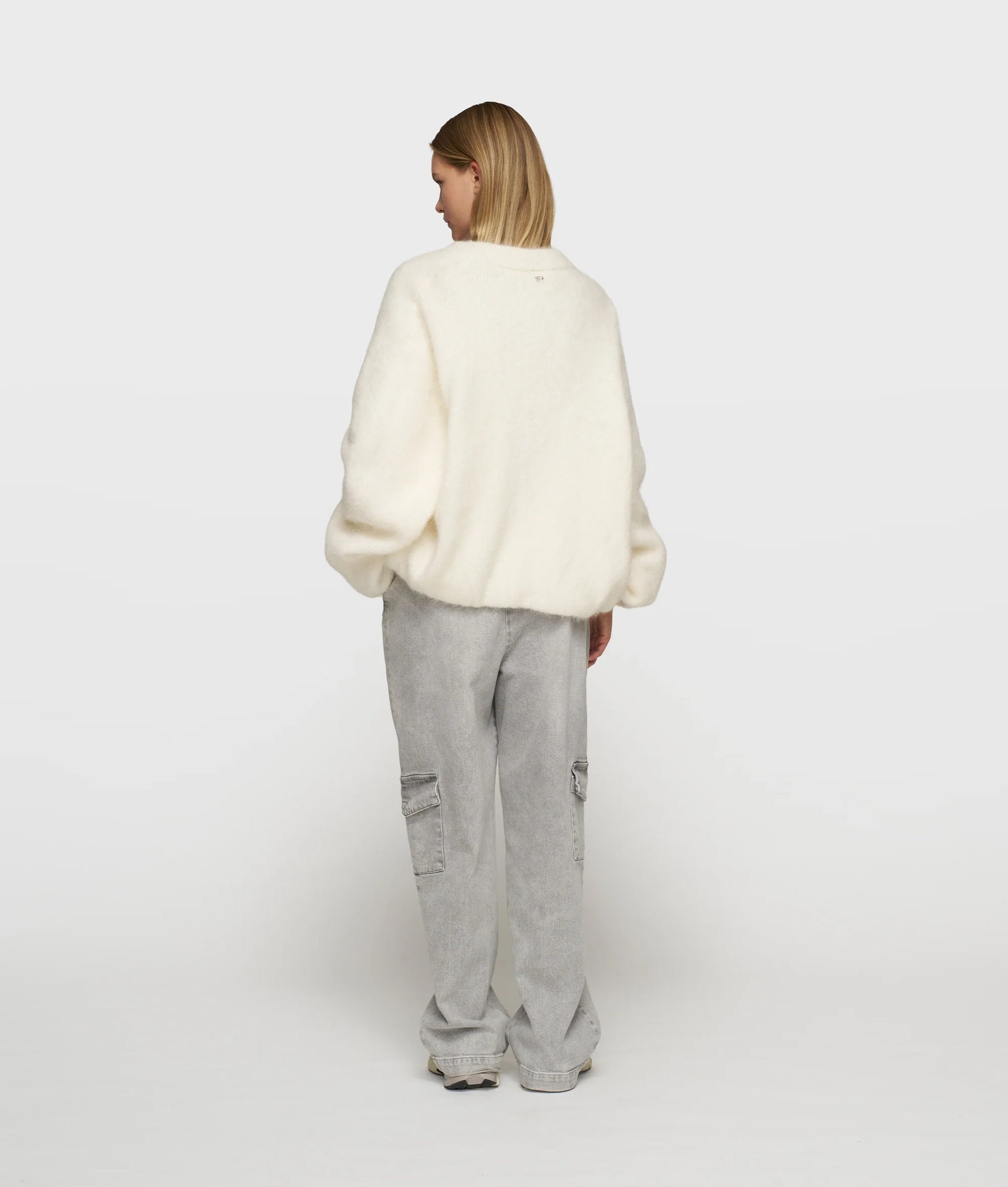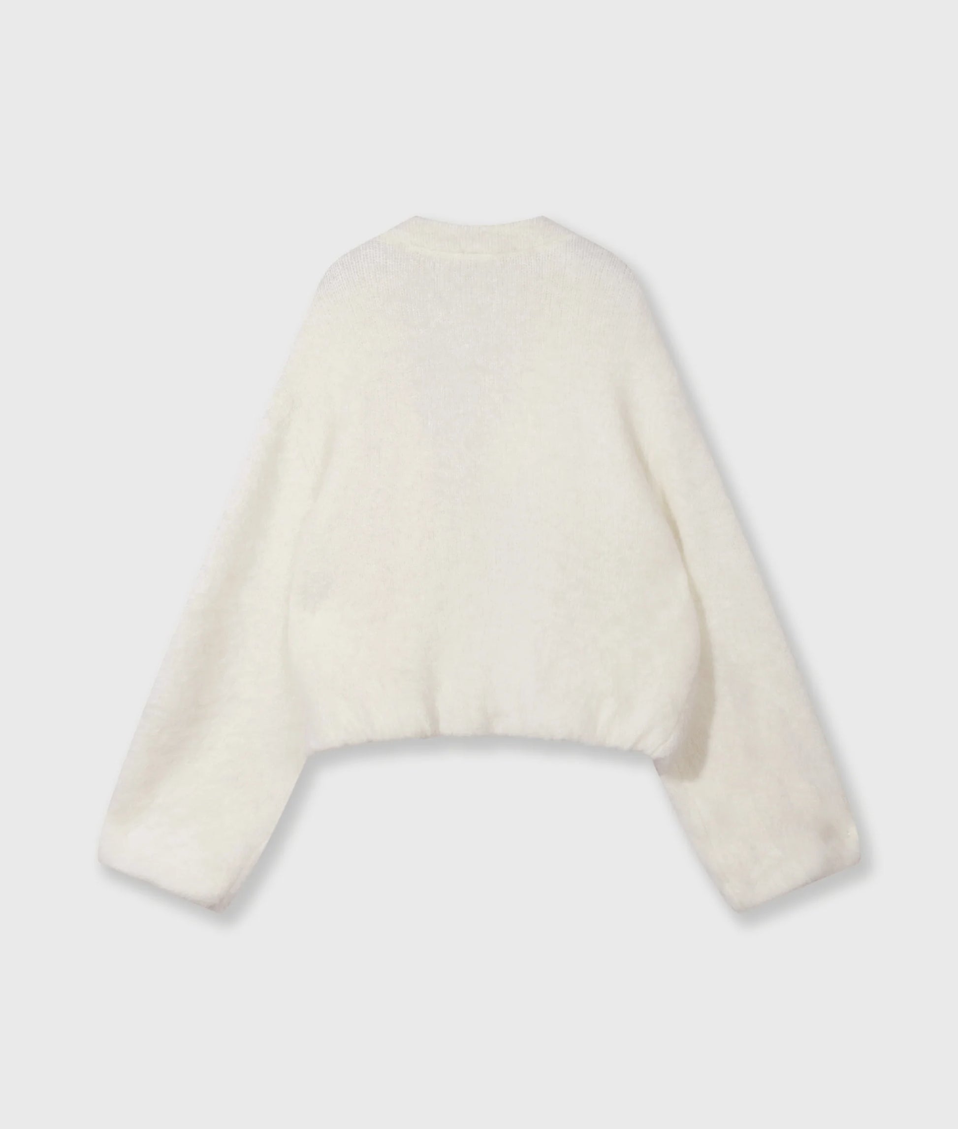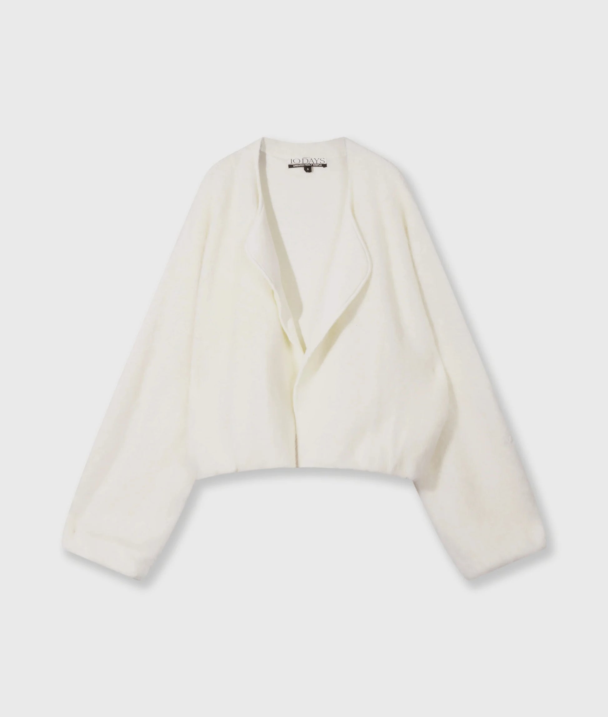 Chaqueta oversize con forma de globo, confeccionada en una suave mezcla de lana de alpaca con un forro de algodón suave. Cuenta con mangas y dobladillo plisados y elásticos, un monograma «10» bordado en la manga izquierda y un monograma «10» con cuentas en la espalda.