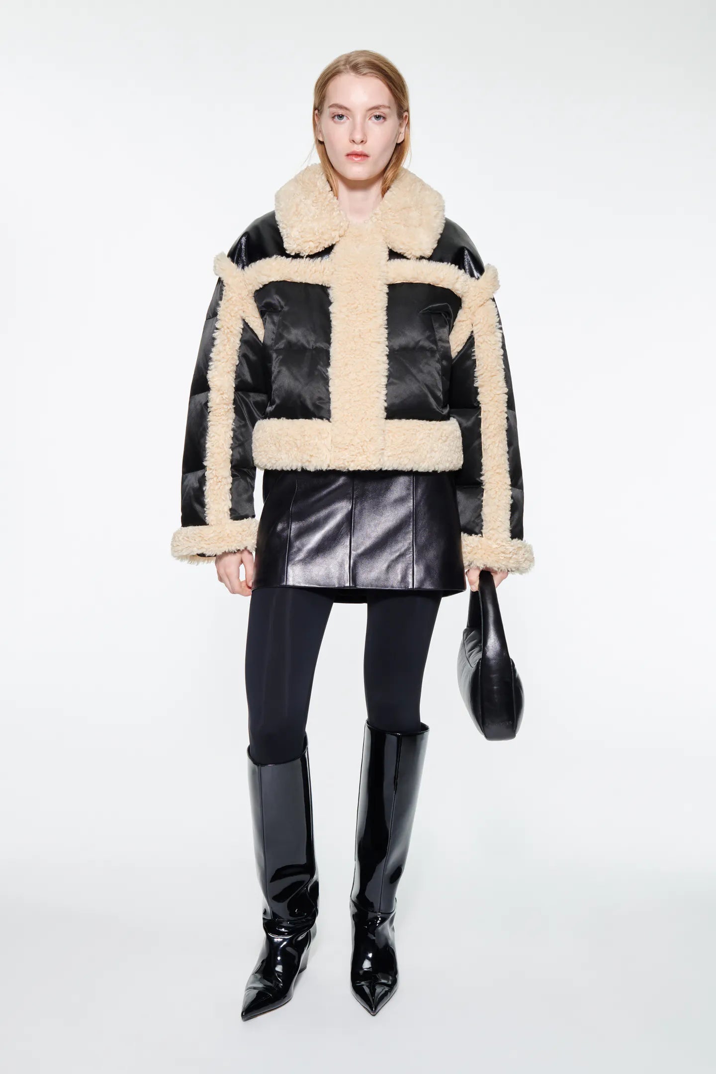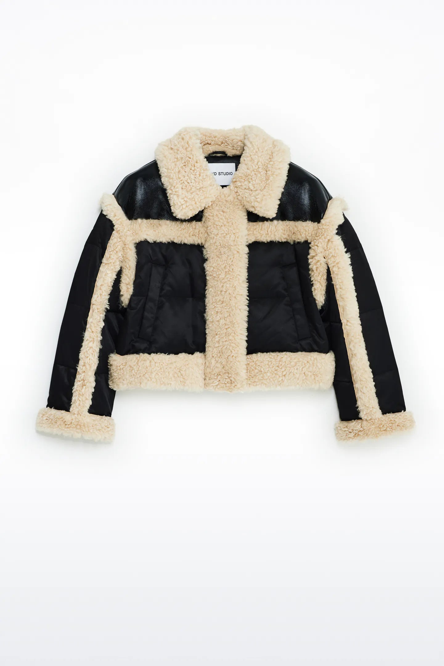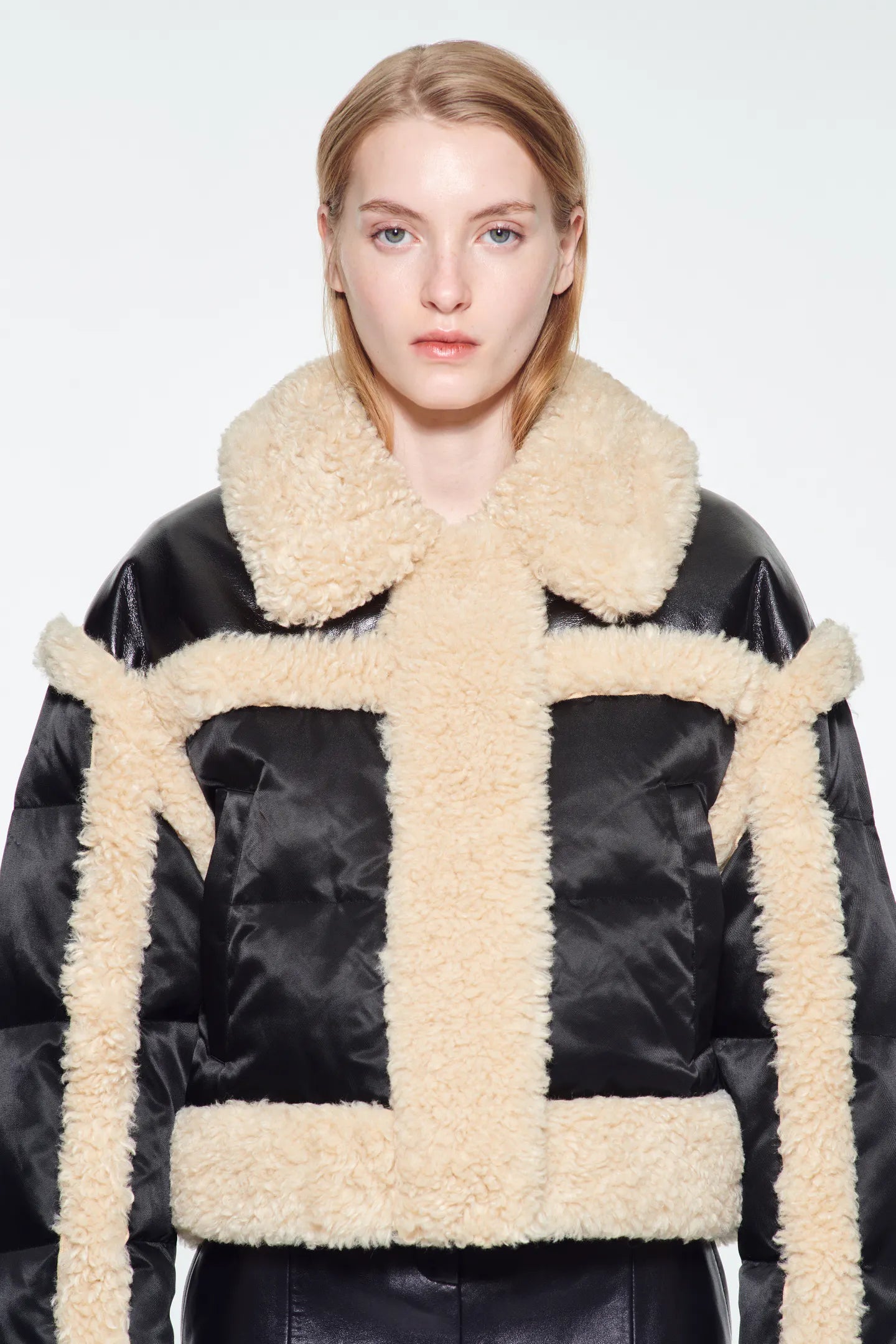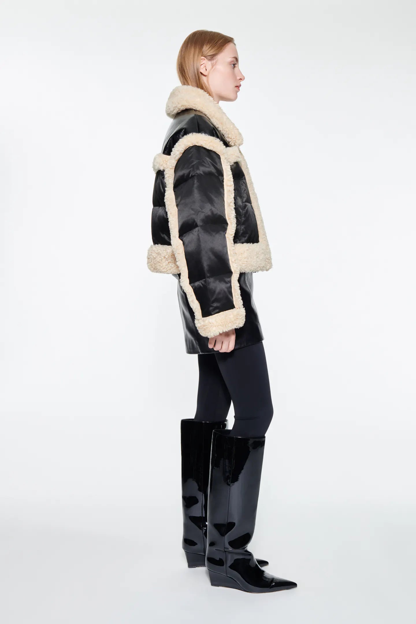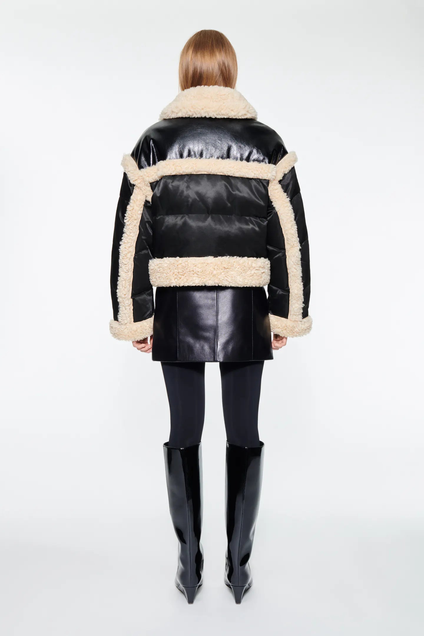 Mary és una jaqueta curta i extragran confeccionada en niló mat amb farcit de plomissol reciclat. Els detalls inclouen rivets de pell sintètica peluix, coll en punta i canesú de pell sintètica.