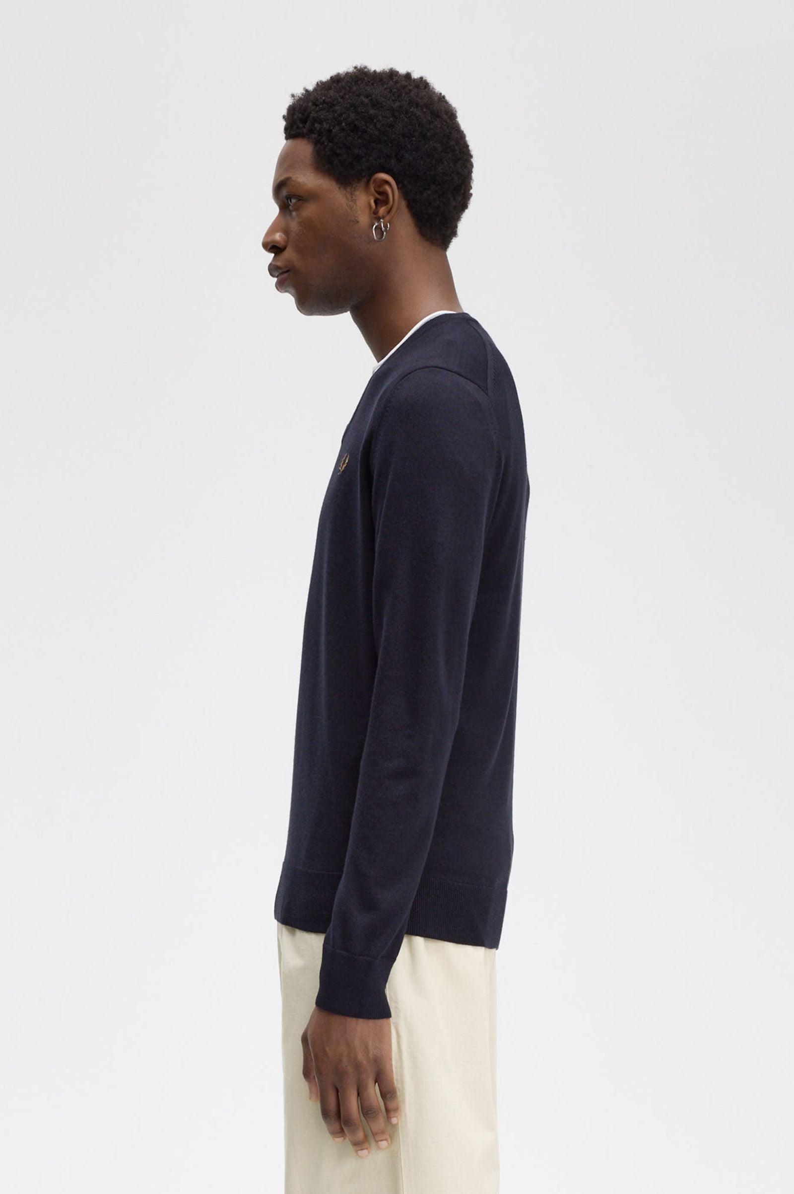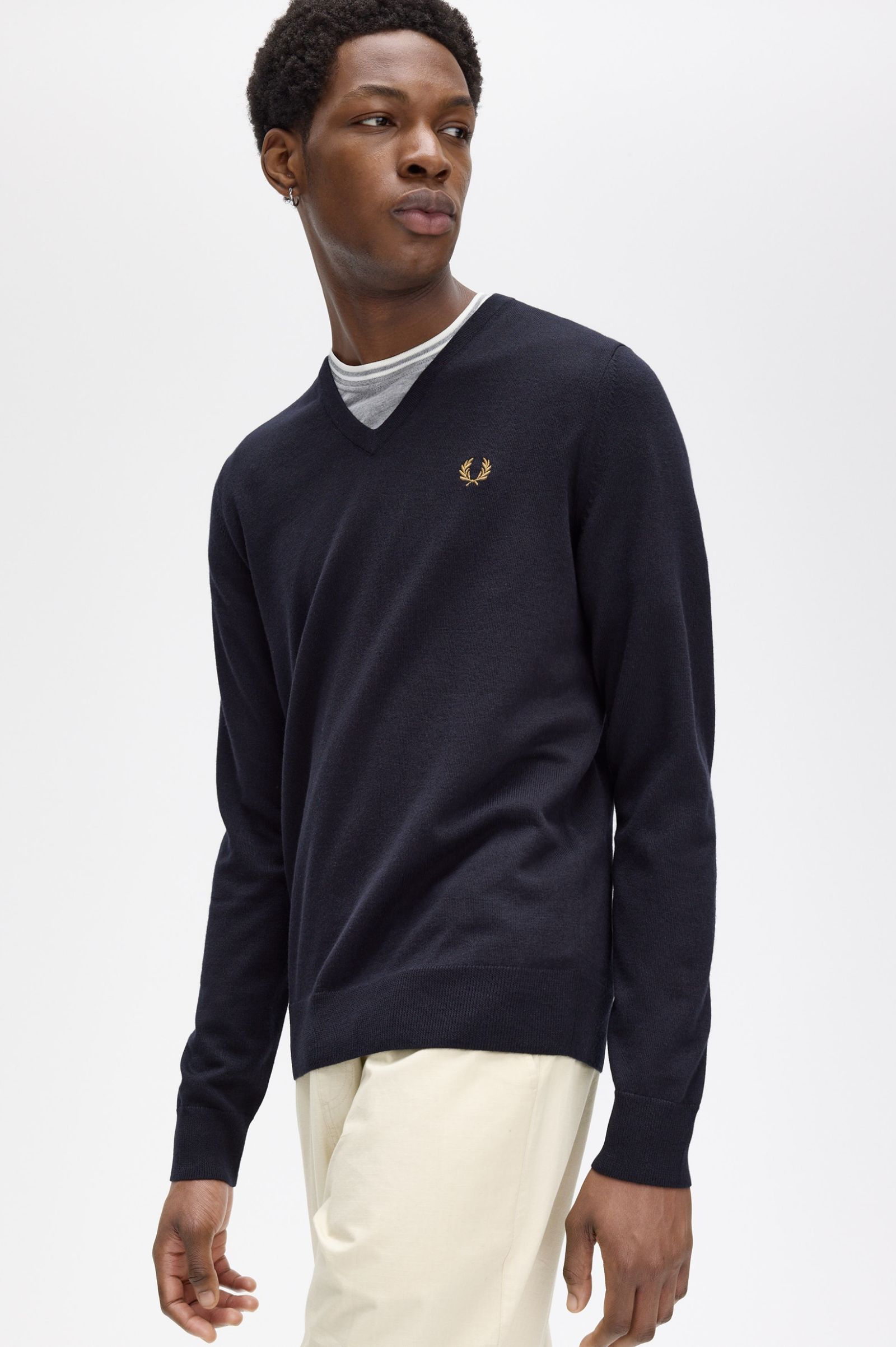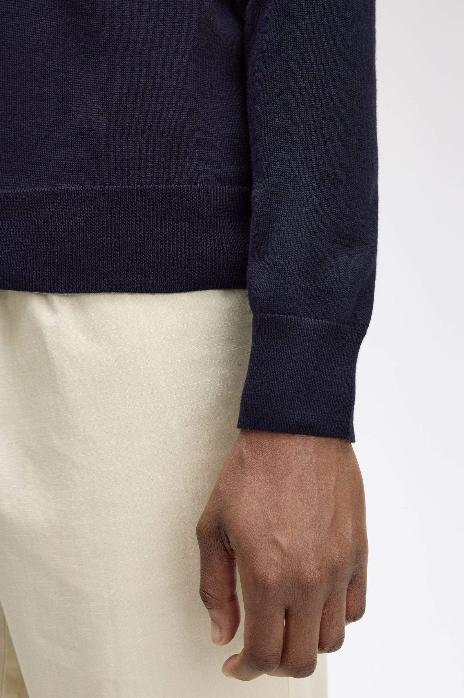 Un jersei de coll de bec en barreja de llana merina amb el nostre característic rivet amb dues franges al coll.