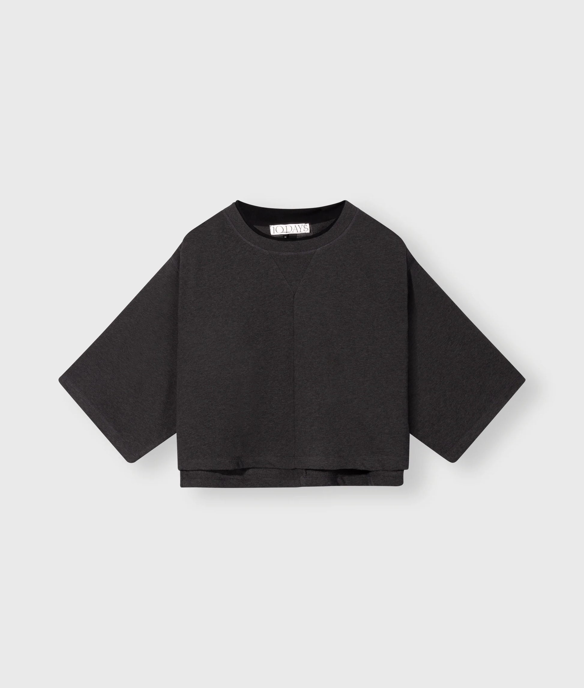 Jersey corto de corte holgado, confeccionado en ligero tejido de algodón tipo felpa de estilo clásico. Cuenta con cuello acanalado, hombros caídos con detalles plisados, pequeñas aberturas laterales en el bajo, etiqueta transparente «10DAYS» en la espalda y monograma «10» bordado en la manga izquierda.