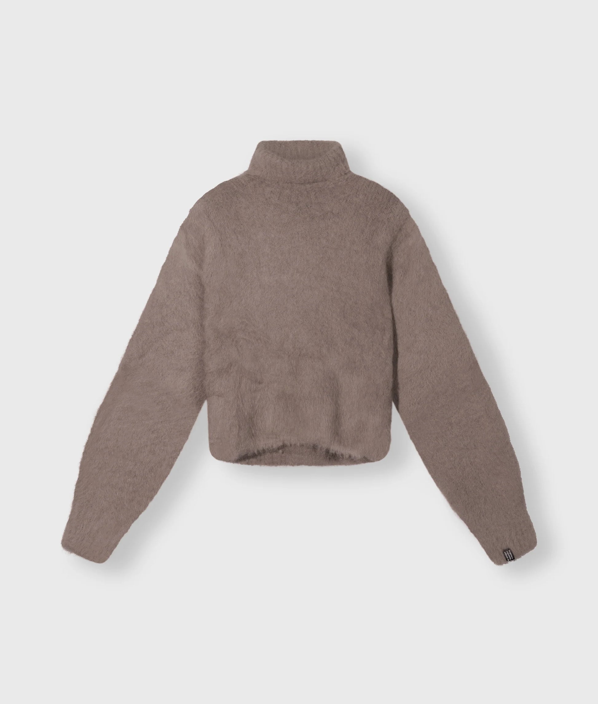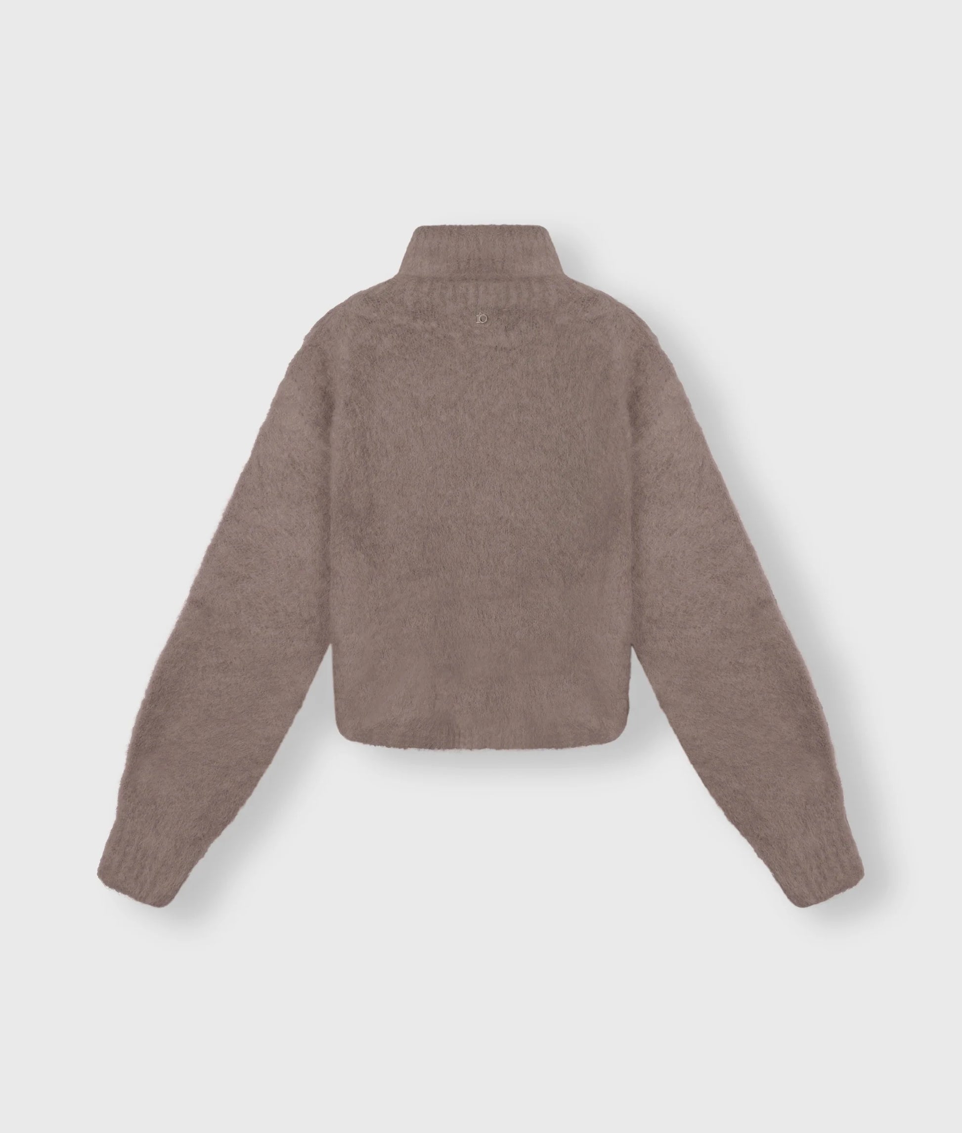 Jersey de cuello alto corto de punto con corte recto, confeccionado en una suave mezcla de lana de alpaca. Presenta ribetes acanalados, mangas abullonadas y un monograma «10» con abalorios en la parte superior de la espalda.