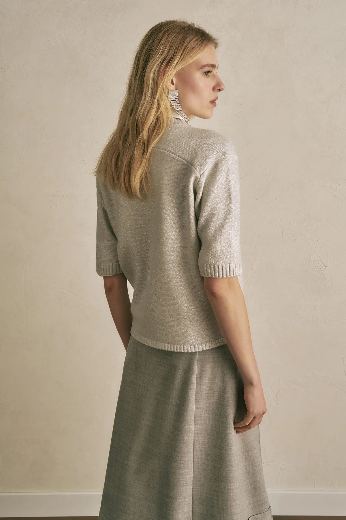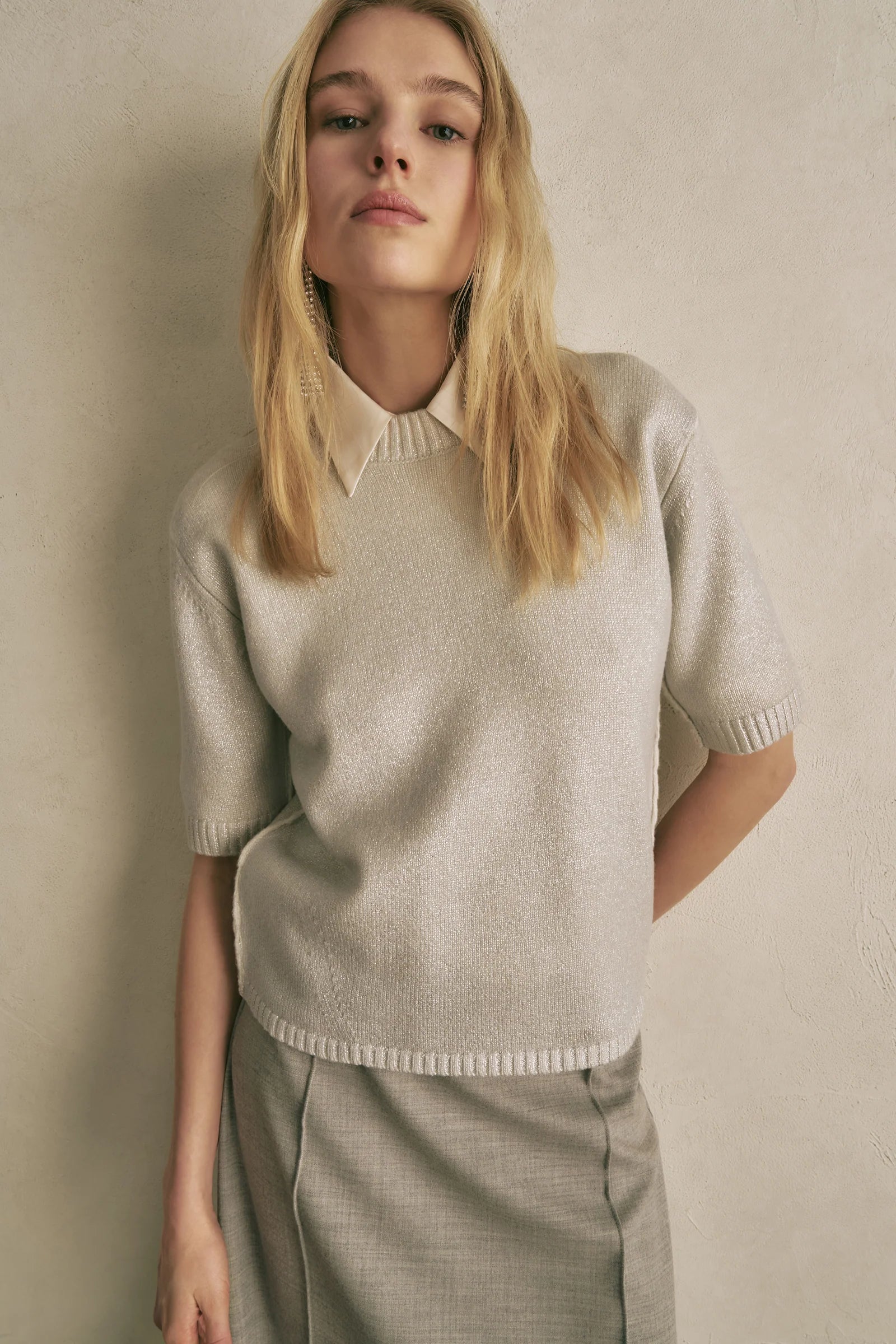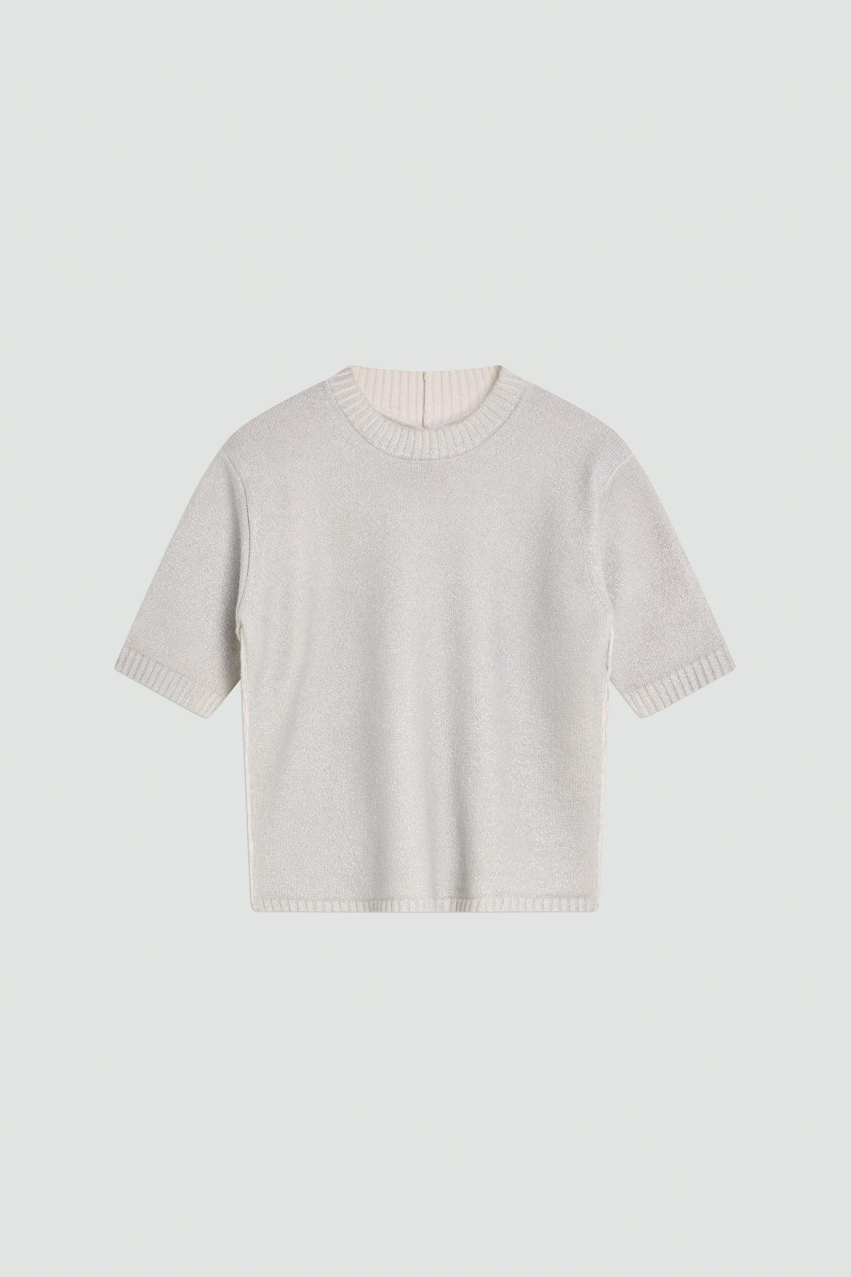 Jersei de llana amb estampat laminat. Model boxy-fit, màniga curta. Llarg fins a la cintura, tall regular.