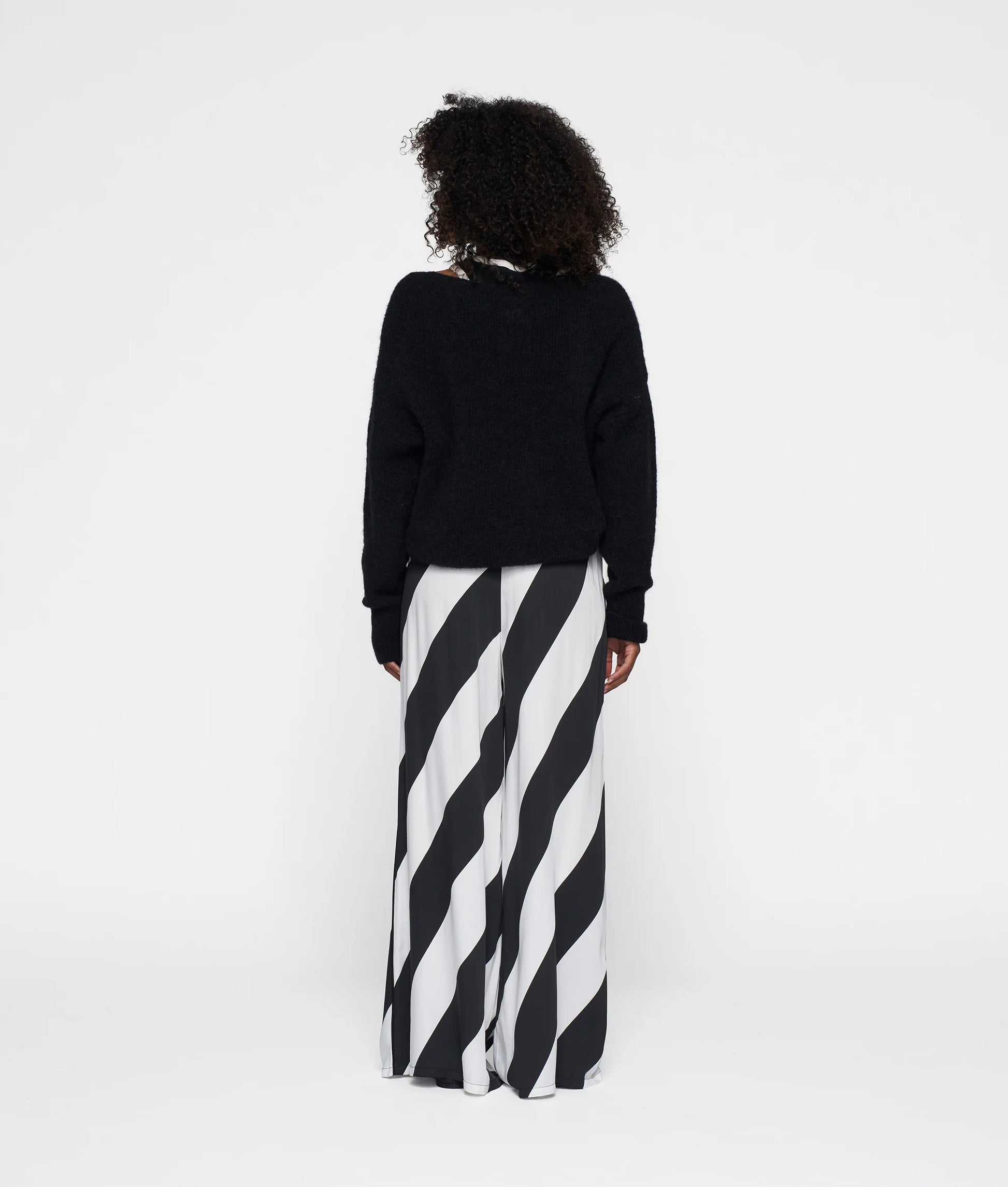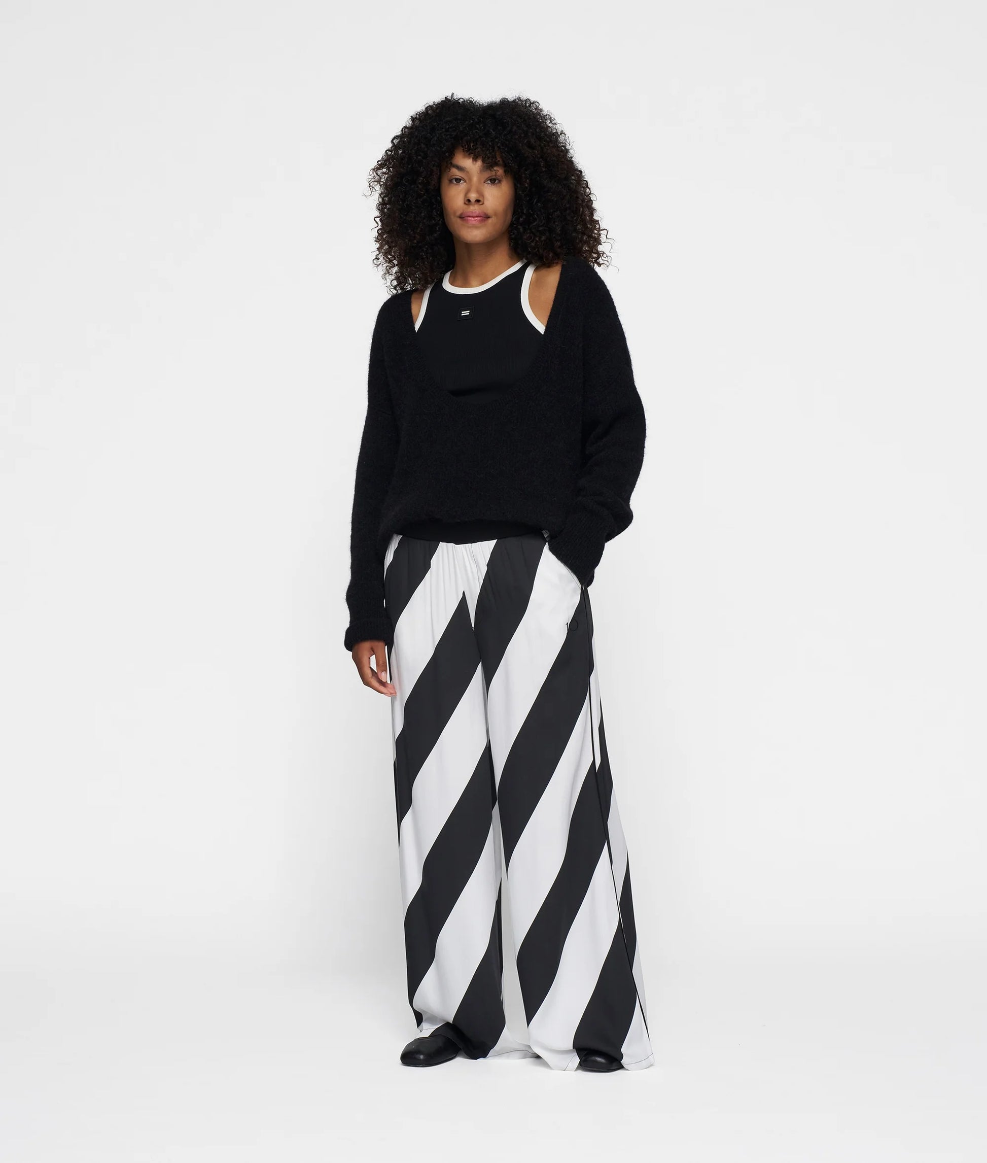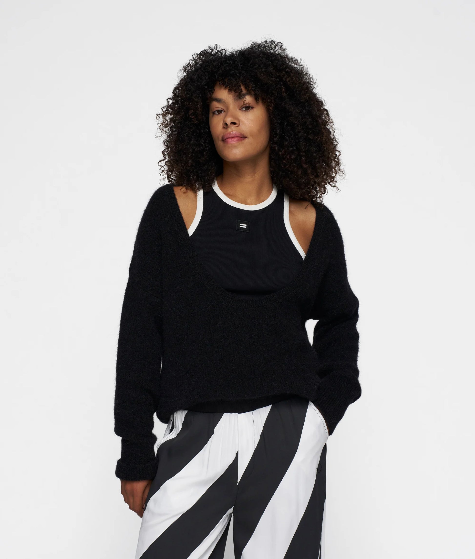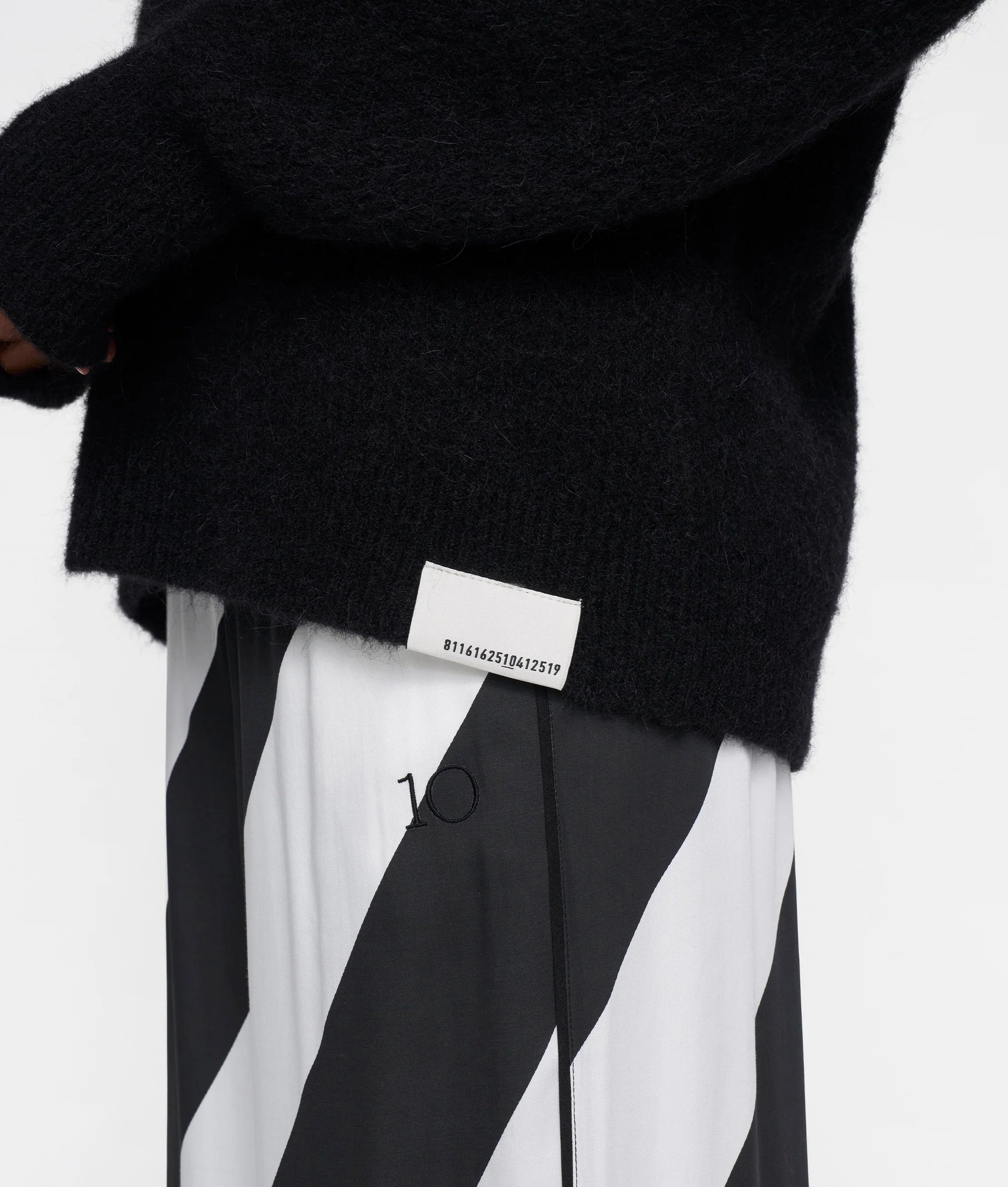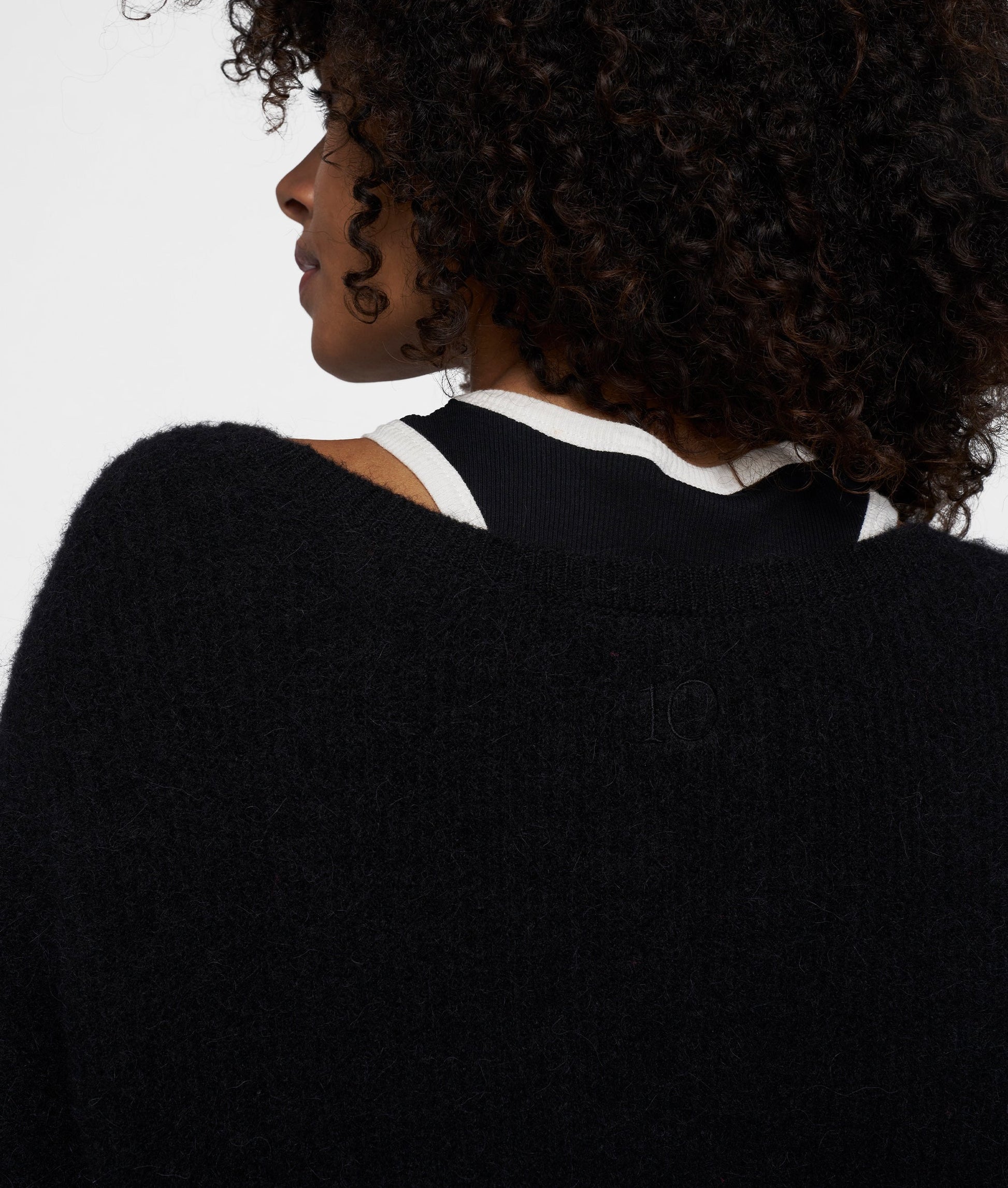 Jersei de tall folgat i coll profund, confeccionat en una barreja suau de llana d'alpaca. Presenta un profund escot rodó, el logotip del monograma «10» brodat a l'esquena i una petita etiqueta «CODE» a la vora esquerra. Perfecte per combinar amb la samarreta de tirants de canalé.