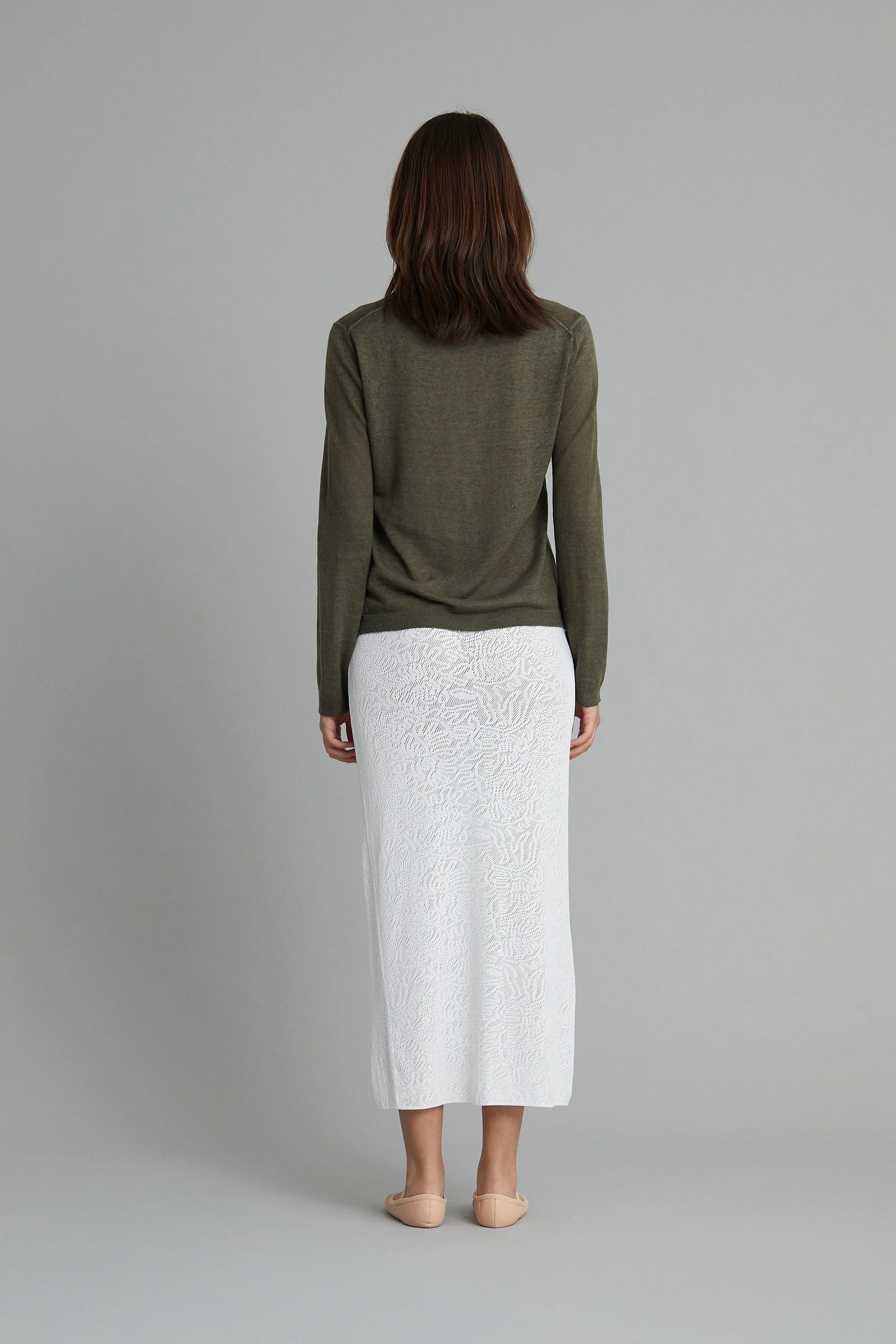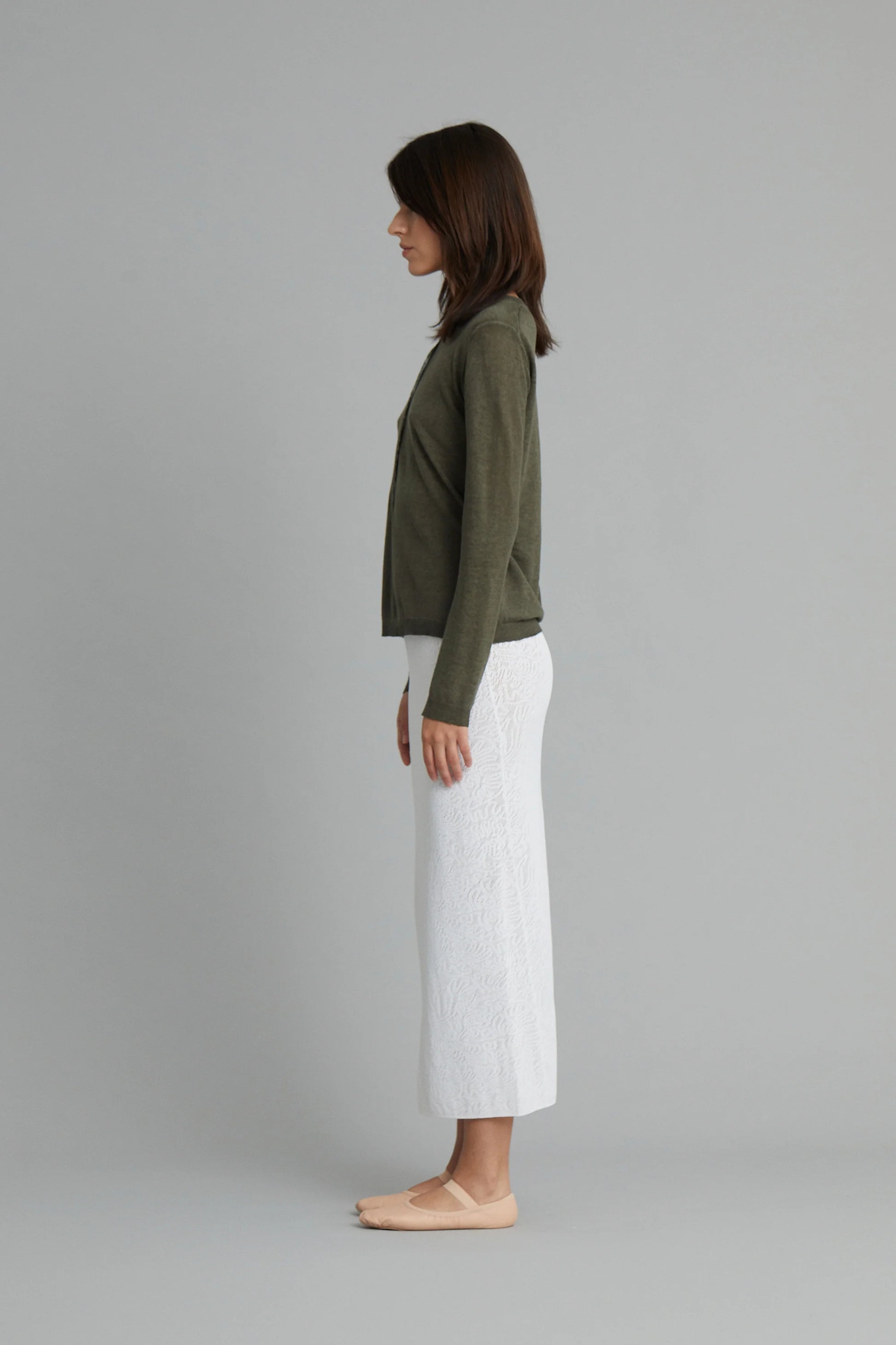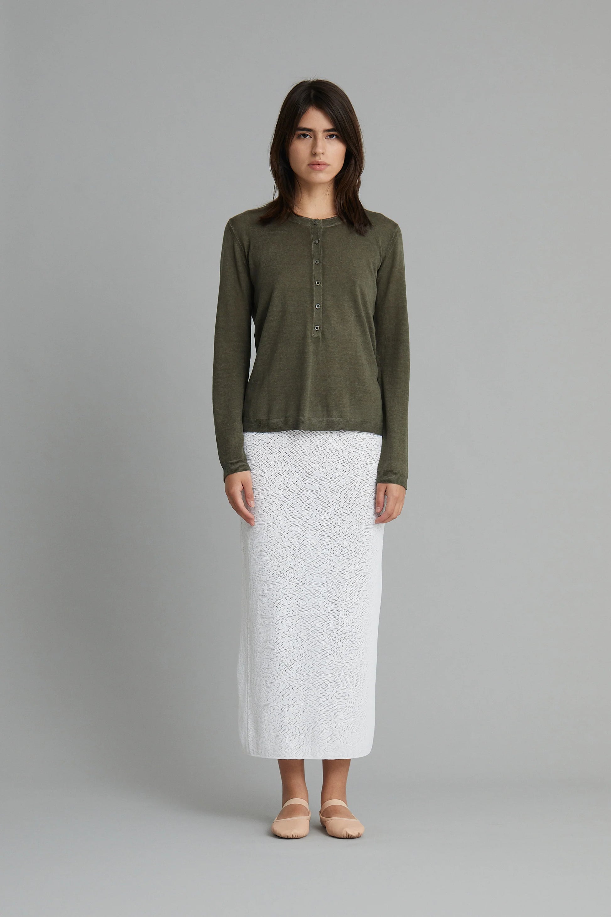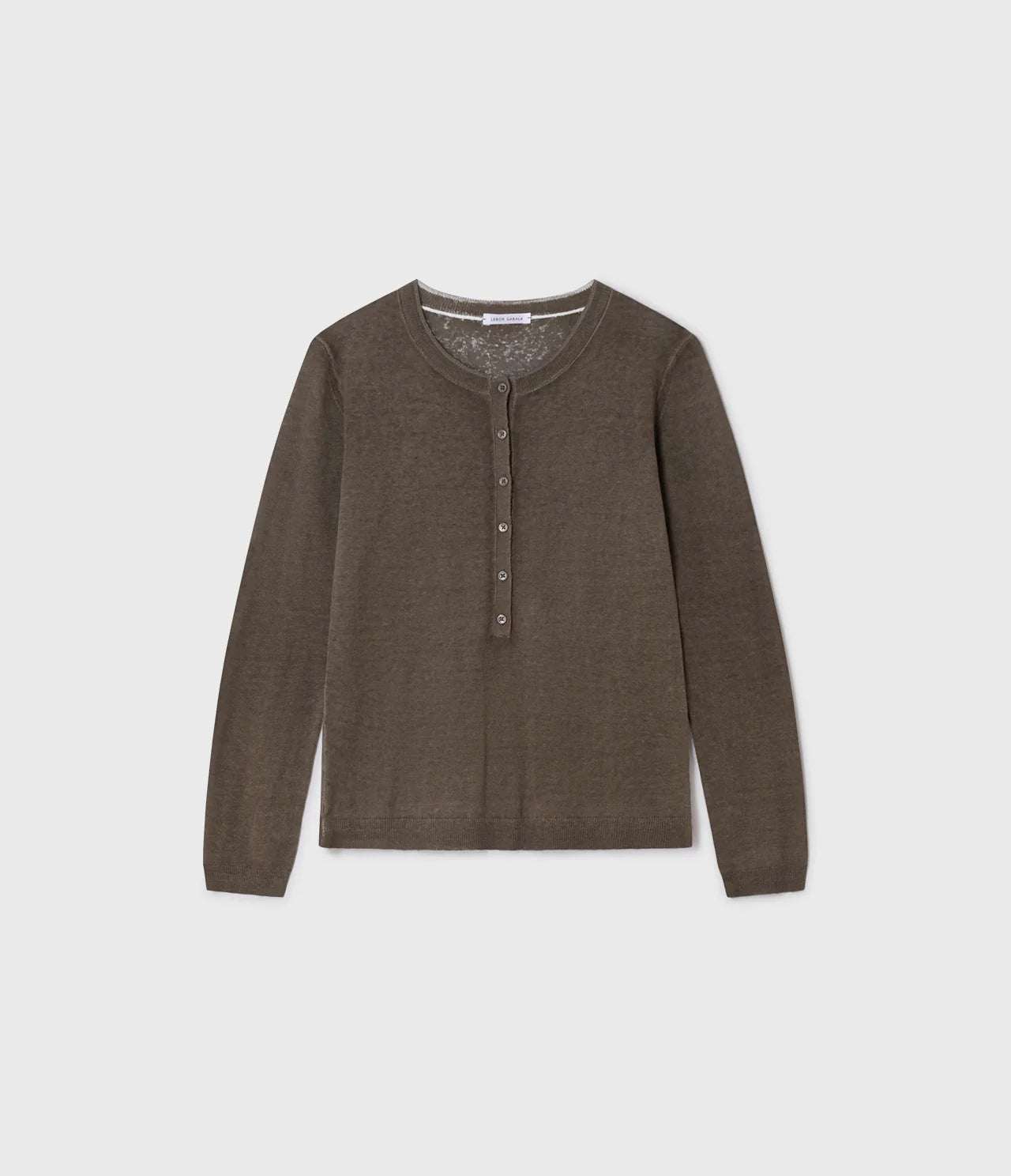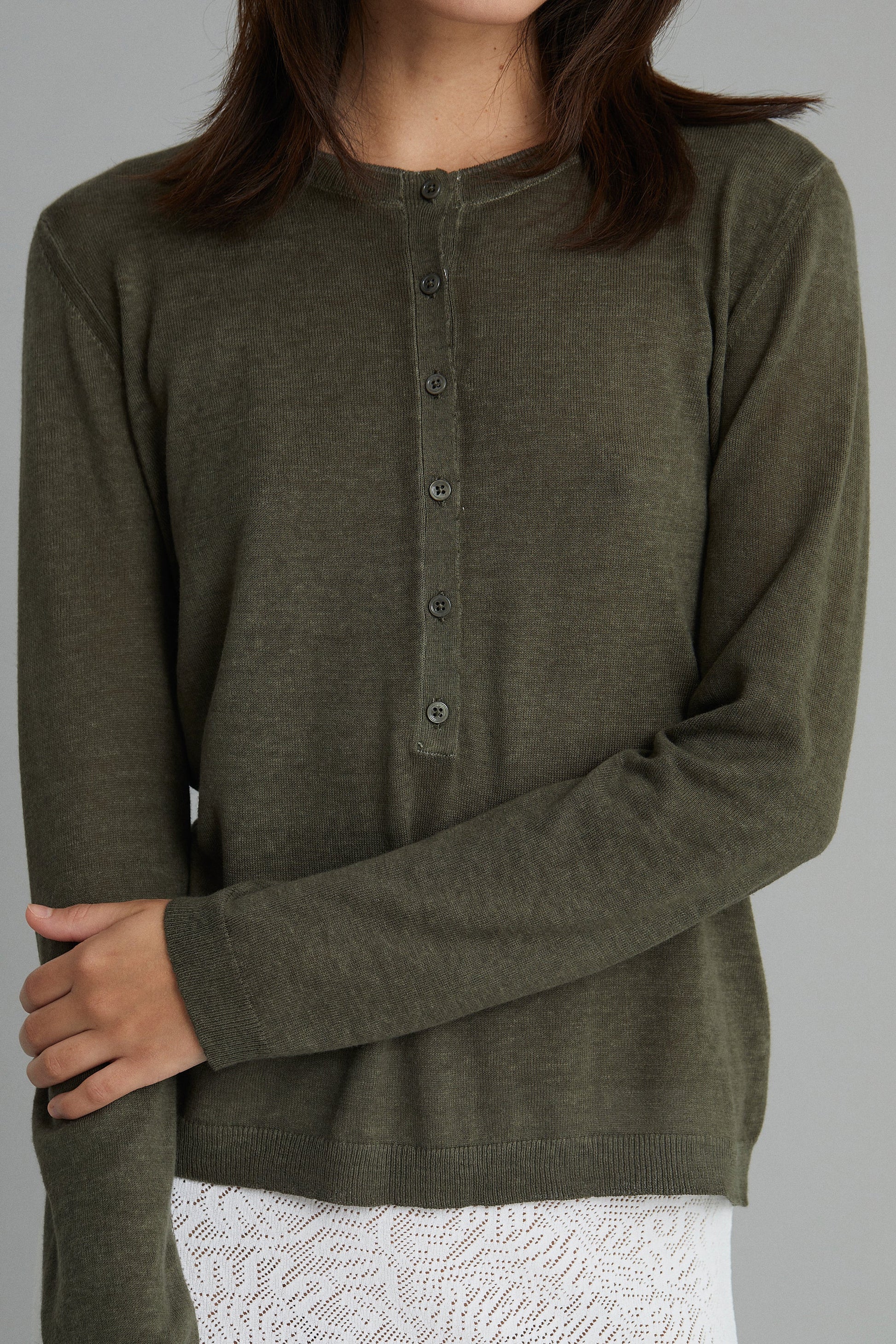 Jersei de punt amb escot rodó i màniga llarga. Obertura amb botons. Acabat acanalat a l'escot, les mànigues i el baix.