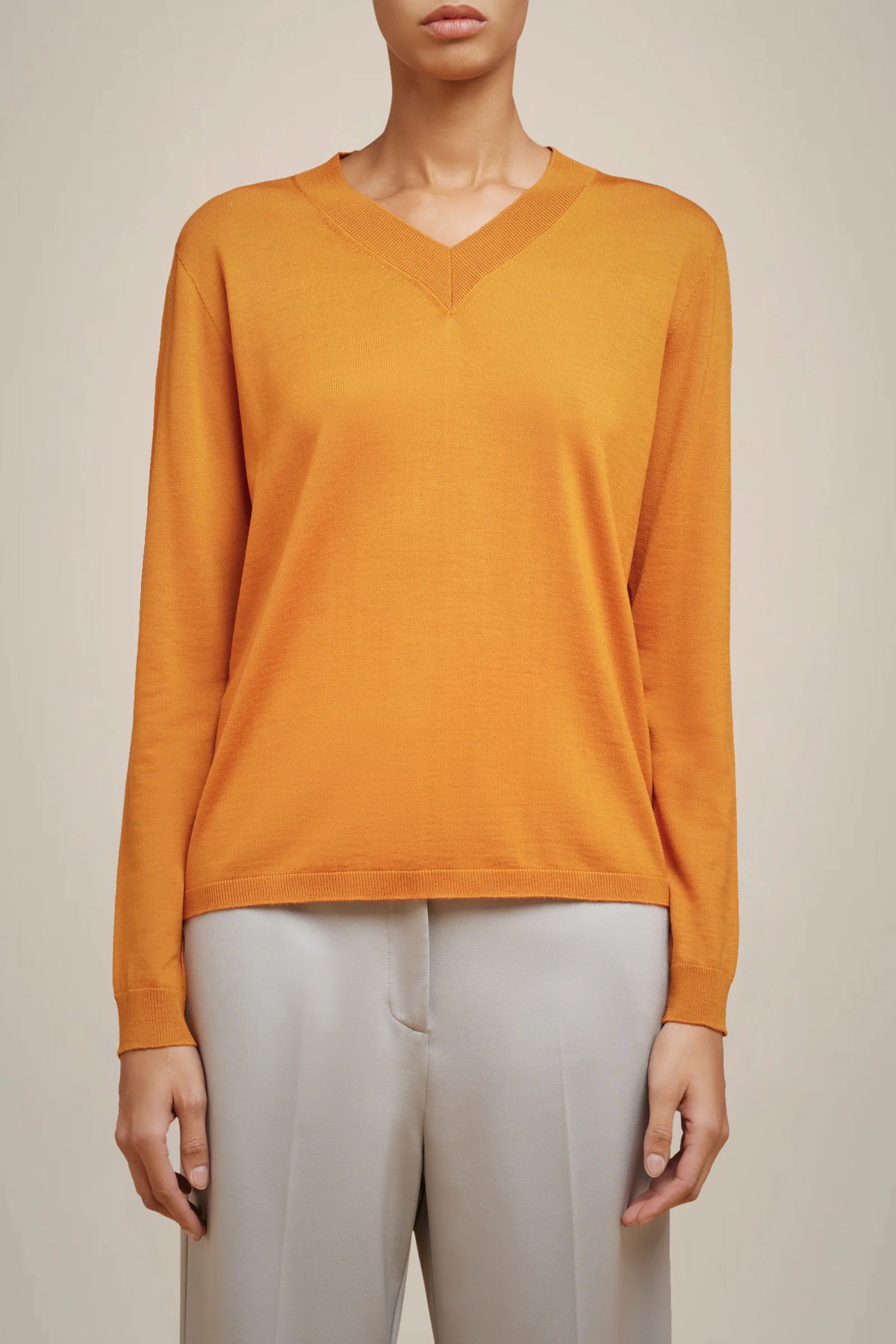Jersei de llana merino extrafina, coll en V, mànigues llargues amb punys a la part inferior. Detall de costures de contrast al centre de l'esquena.