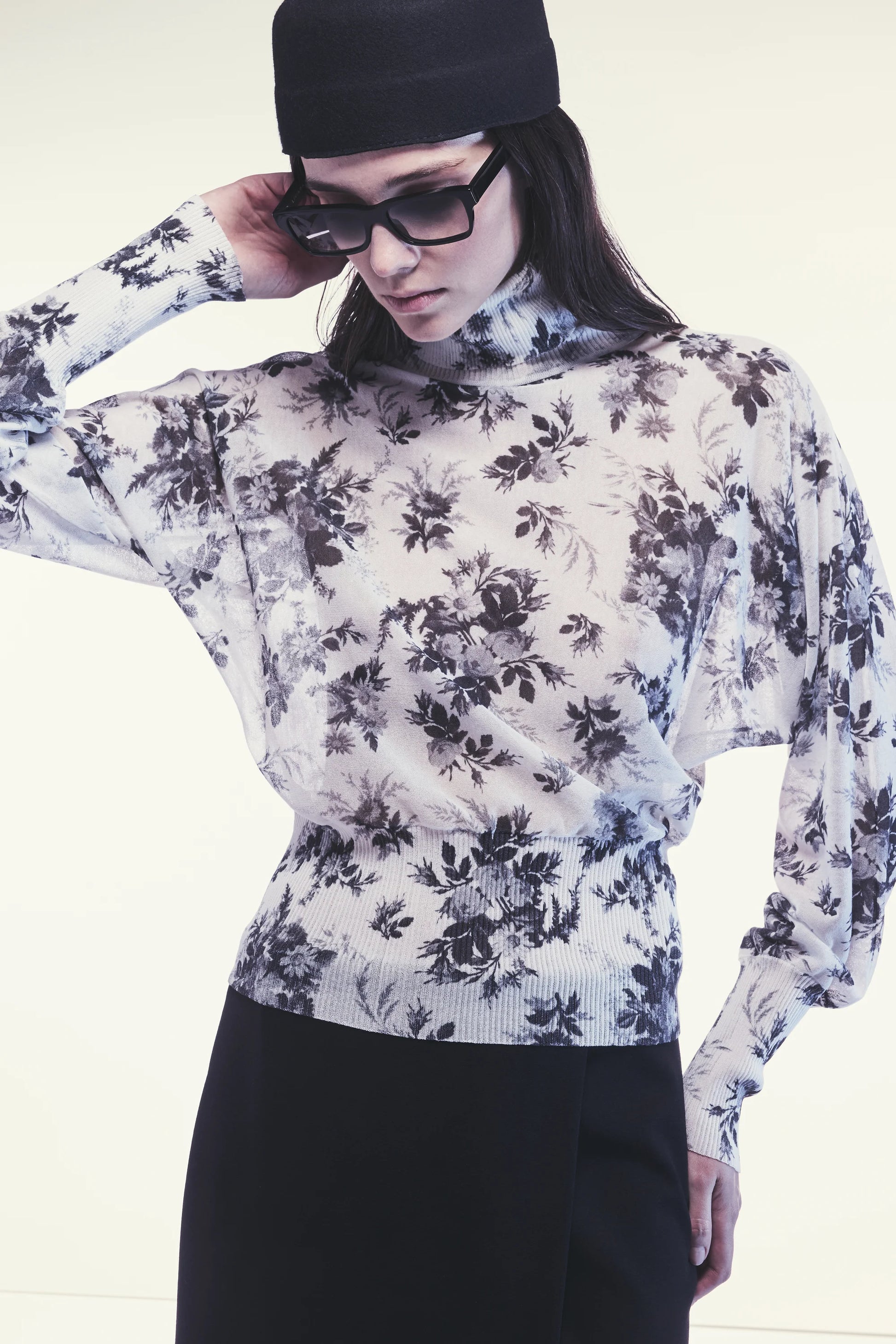 Jersei tècnic de cotó estampat amb tall ampli, coll alt i mànigues llargues de cigarreta amb punys ajustats.