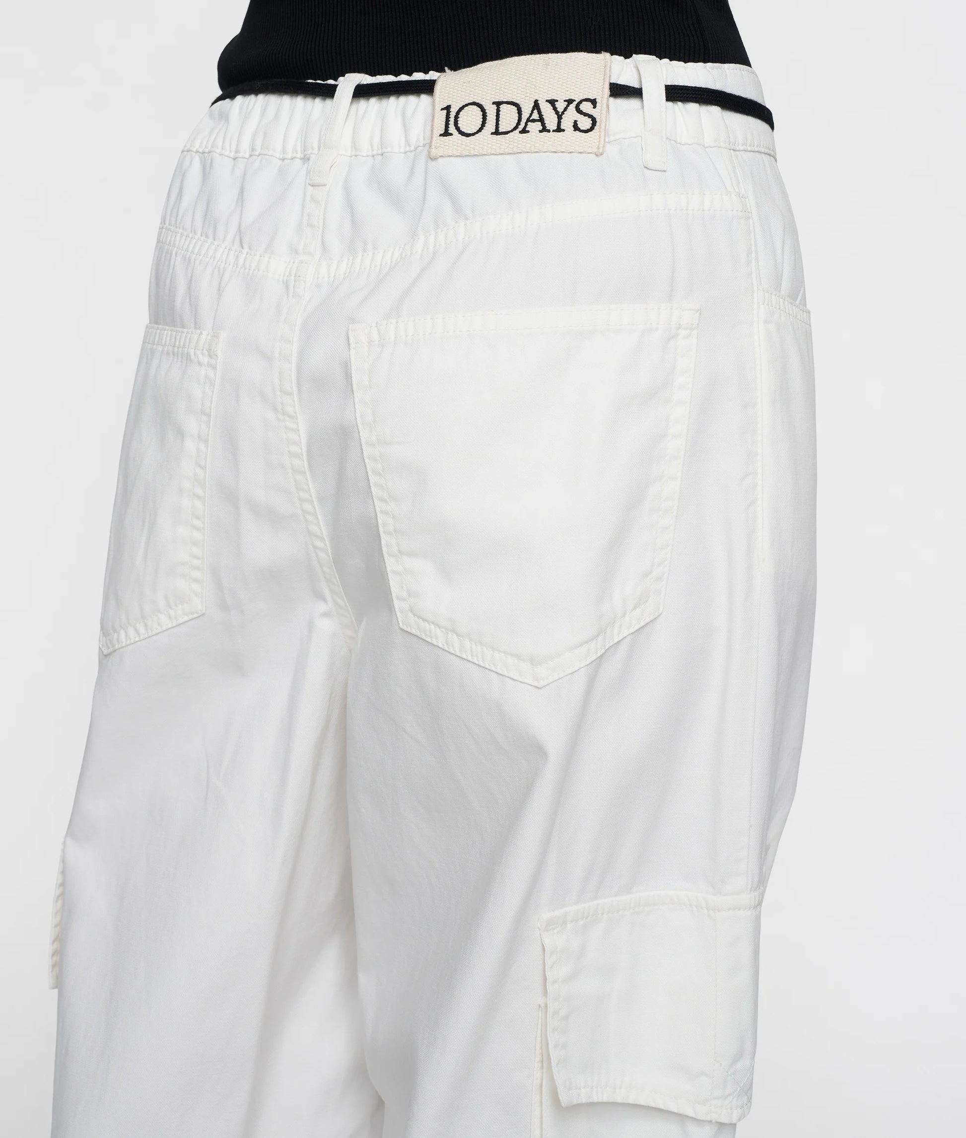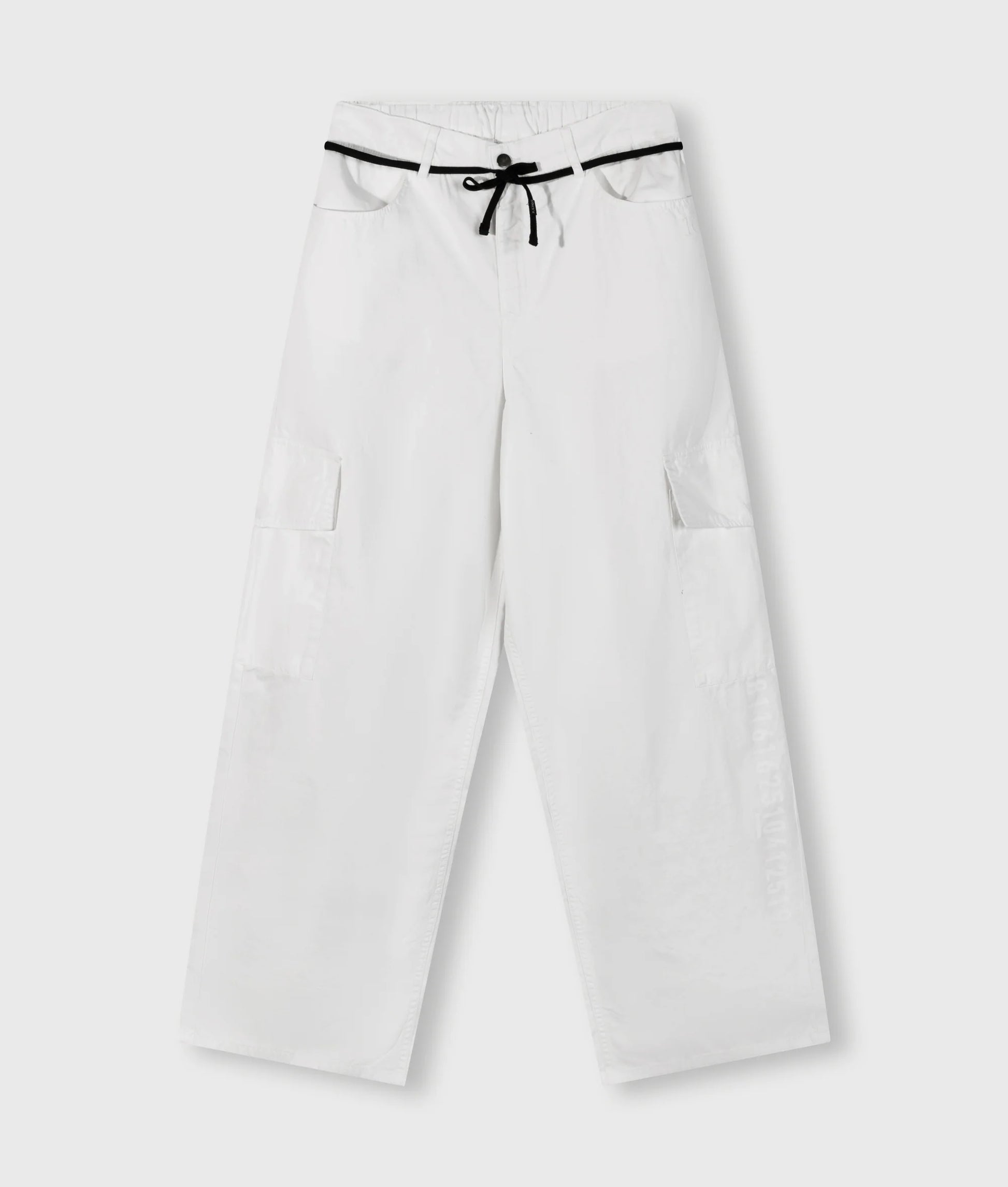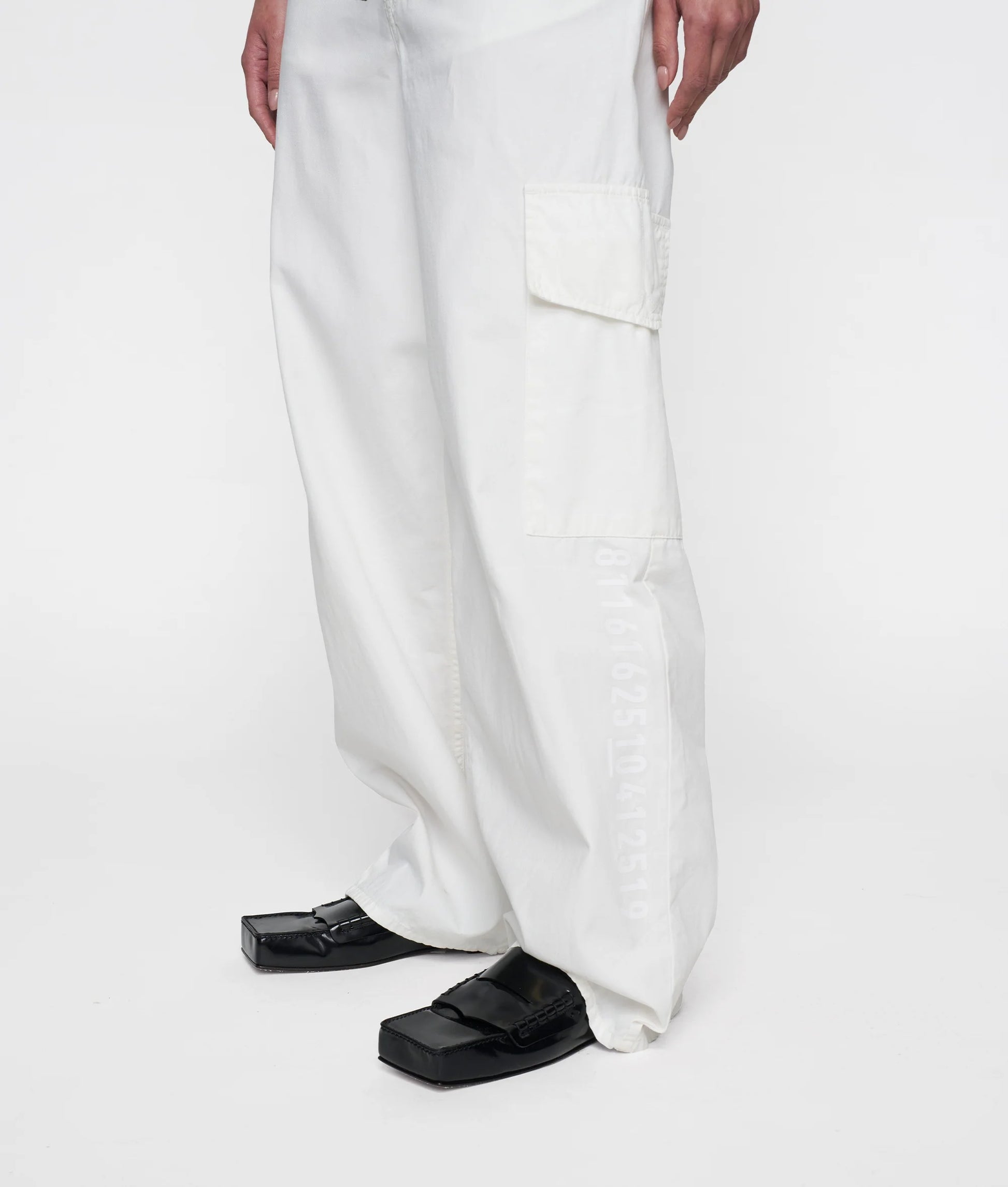 Pantalons de tall relaxat confeccionat en una suau barreja de cotó i lli. Presenta cintura elàstica, tancament amb cremallera i botó, cinturó amb cordó, butxaques amb obertures, butxaques del darrere, butxaques amb solapa a les dues camals ia la cama esquerra amb tancament a pressió, monograma «10» brodat sota la butxaca esquerra i estampat «numbers» al camal esquerra.
