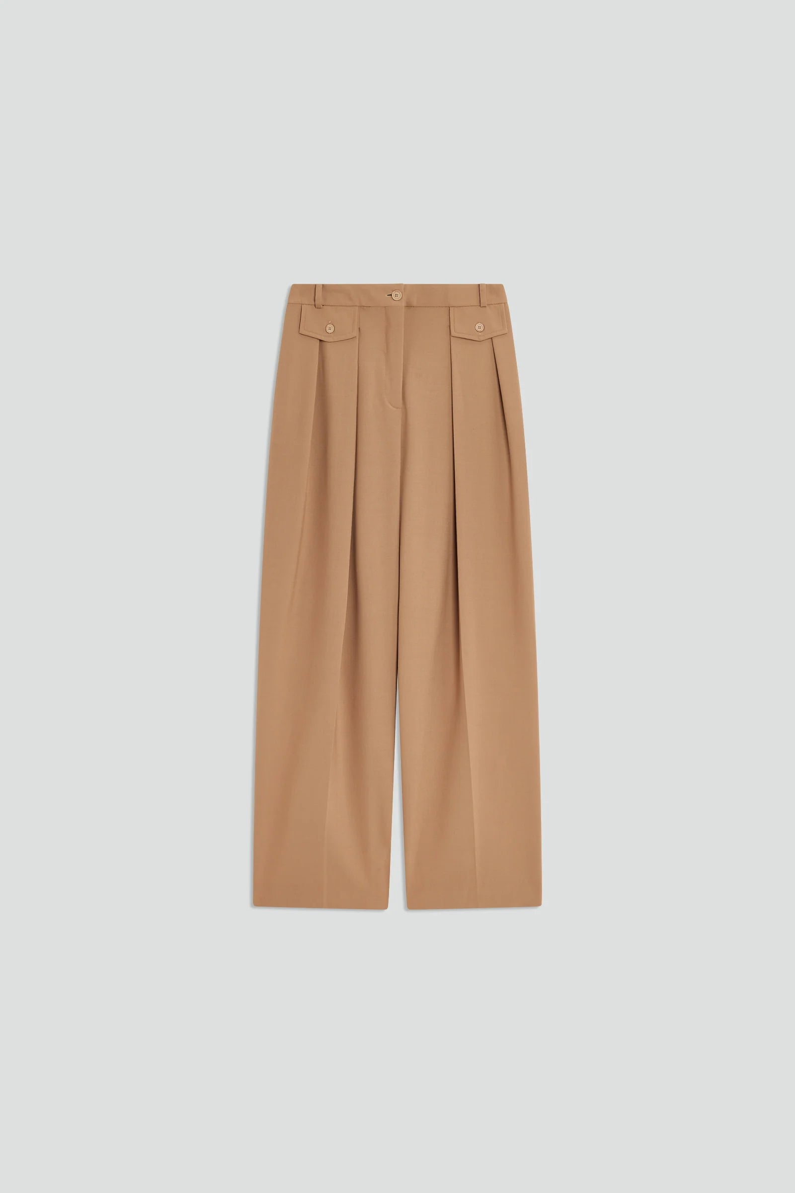 Pantalons de llana fresca. Àmplia cintura amb travetes, tanca amb botó i cremallera. Disseny de cama ampla amb plec planxat.