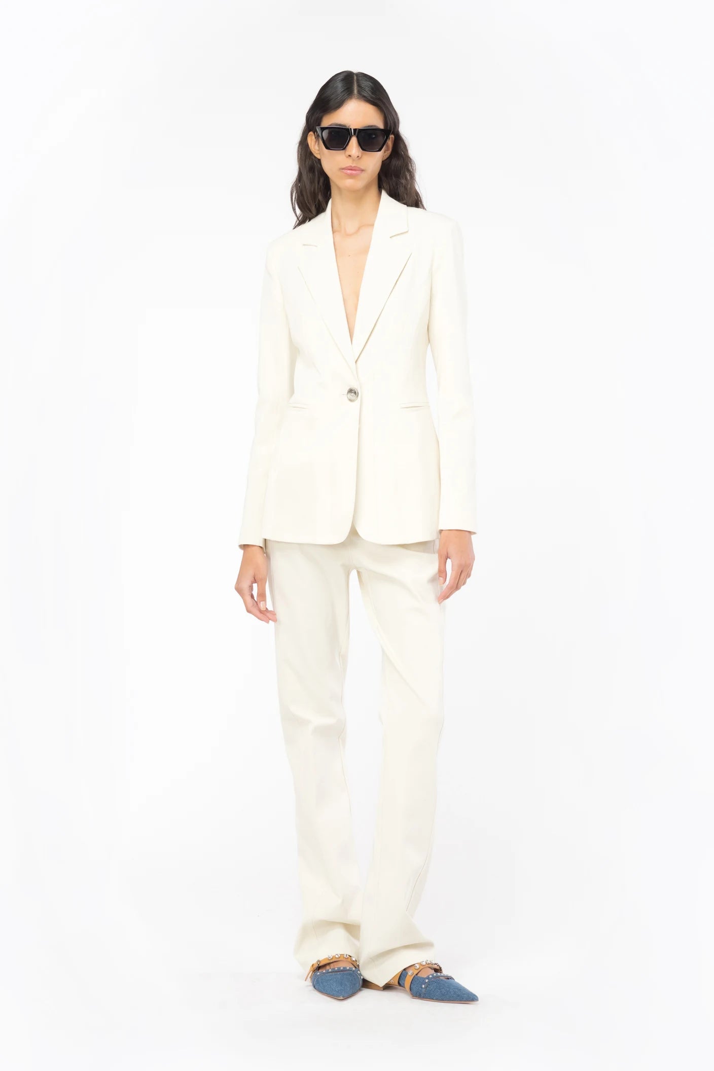 Pantalons acampanats de tricotina de cotó elàstic, un teixit especial amb una textura similar al punt. Talla regular amb travetes per al cinturó, butxaques franceses als costats i camal de línia cenyida, lleugerament acampanada al baix. Tancament amb cremallera i botó. Color rosa fum blanc.