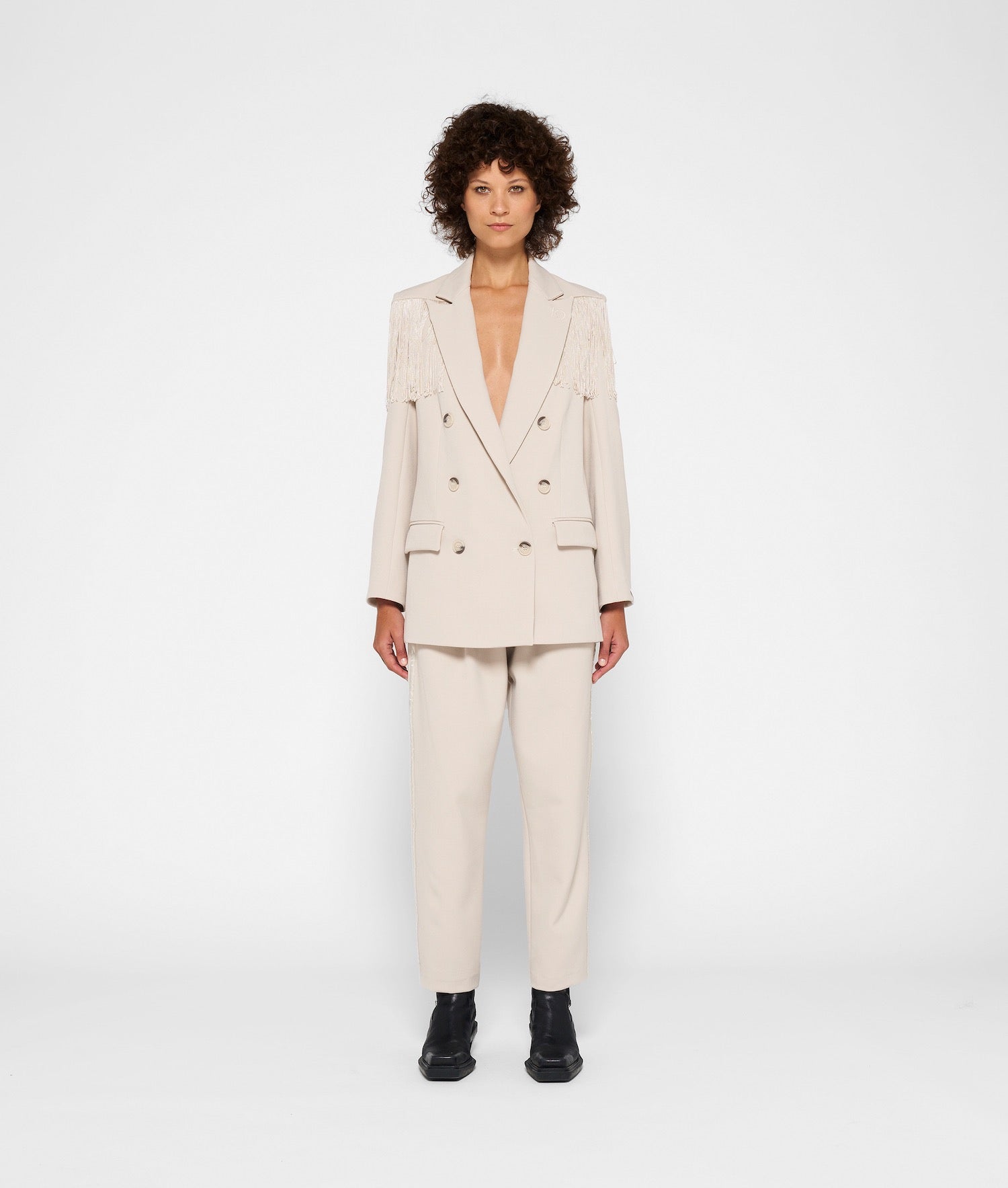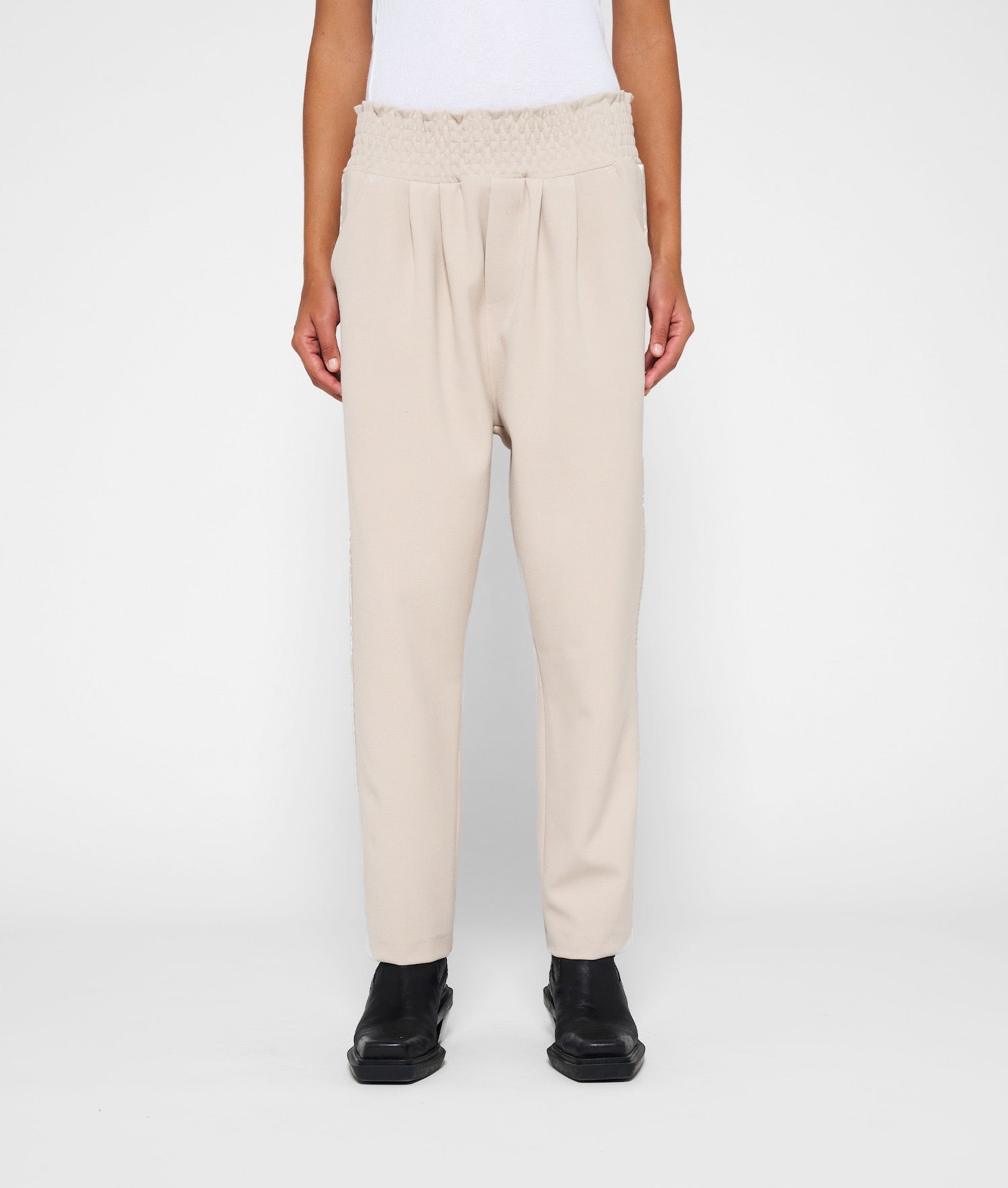 Pantalons prisats de tall relaxat, confeccionat en resistent crepé. Presenta cintura ampla frunzida, butxaques laterals inclinades, falses butxaques del darrere cecs, rivets de ras al llarg de les costures laterals i camals enrotllats.