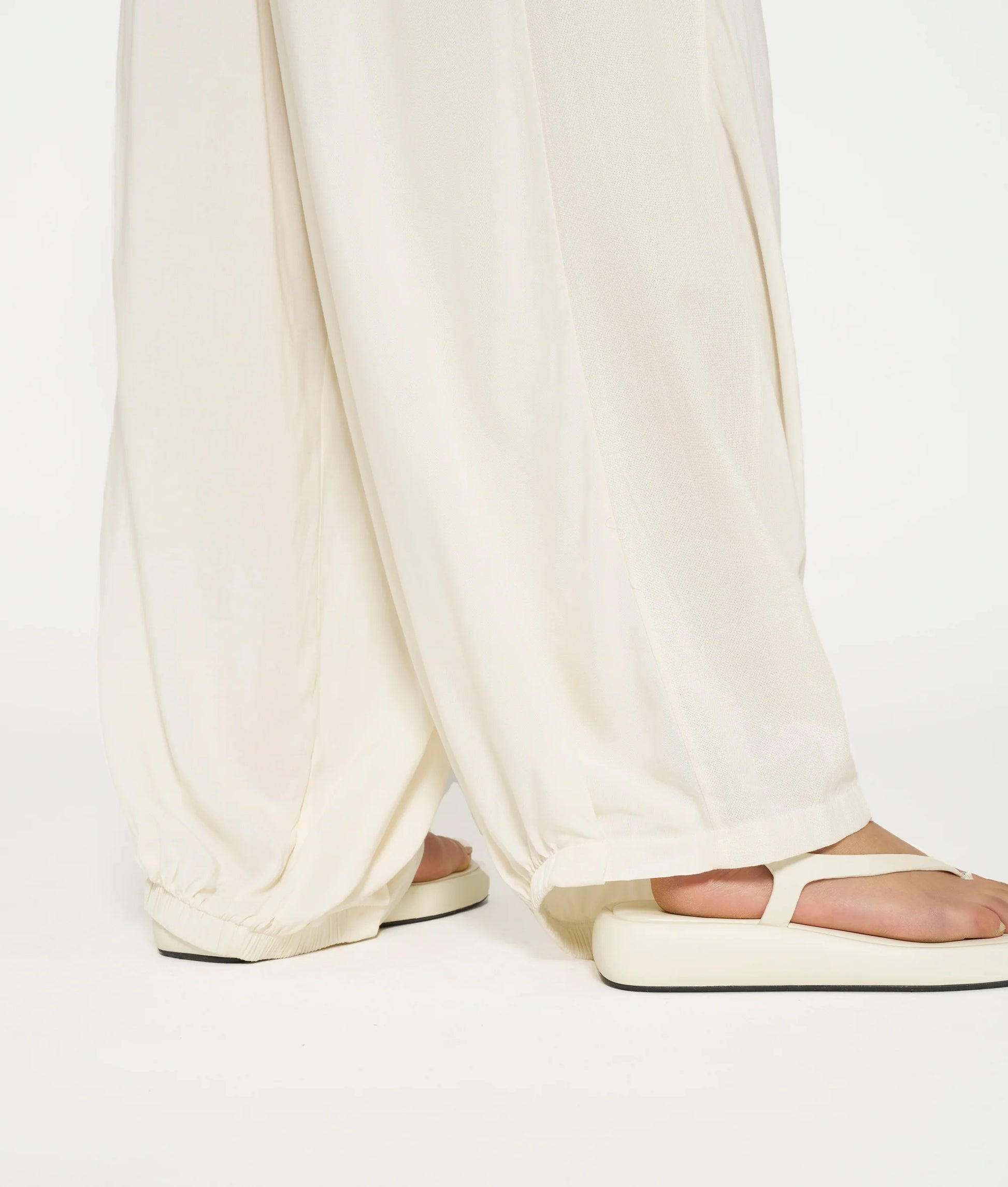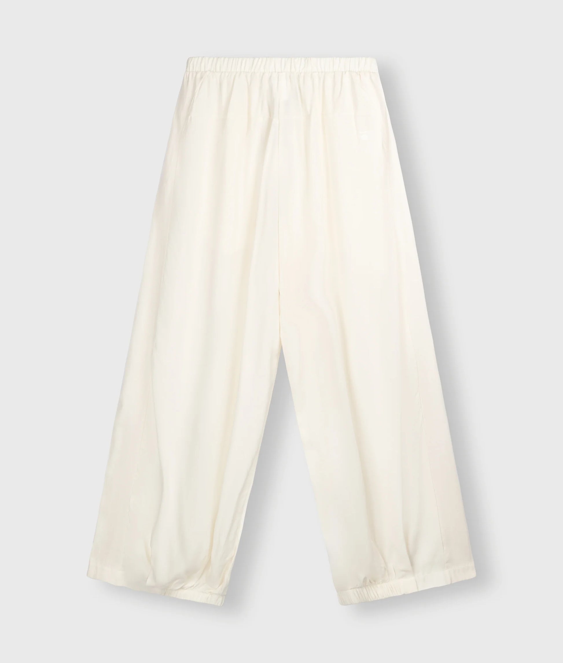 Pantalons fluids de tall relaxats, confeccionats en viscosa. Presenta una cintura elàstica, costures laterals teixides en piqué, punys elàstics al voltant dels turmells, butxaques invisibles i una medalla brodada a l'esquena.