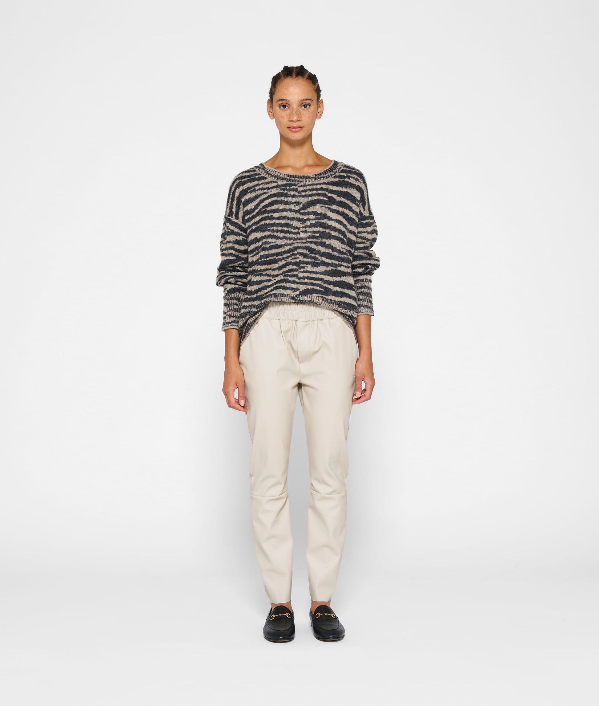 Pantalons jogger cropped de tall regular amb aspecte de pell. Presenta cintura elàstica, butxaques laterals, una butxaca del darrere fals, camals amb vora sense rematar i un logo de mini ratlles brodat sota la butxaca davantera esquerra.