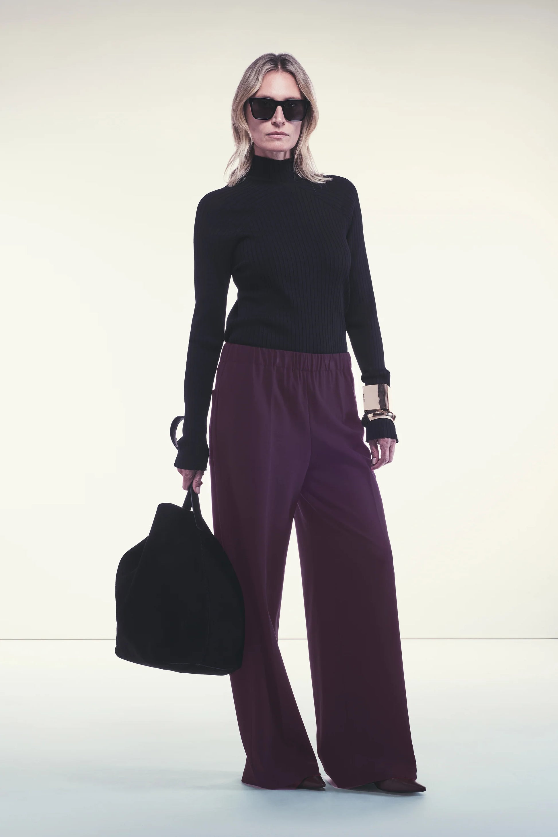 Pantalons palazzo amb costura milanesa, amples i fluids. Cintura alta amb banda elàstica. Llarg total amb butxaques aplicades a la part posterior.