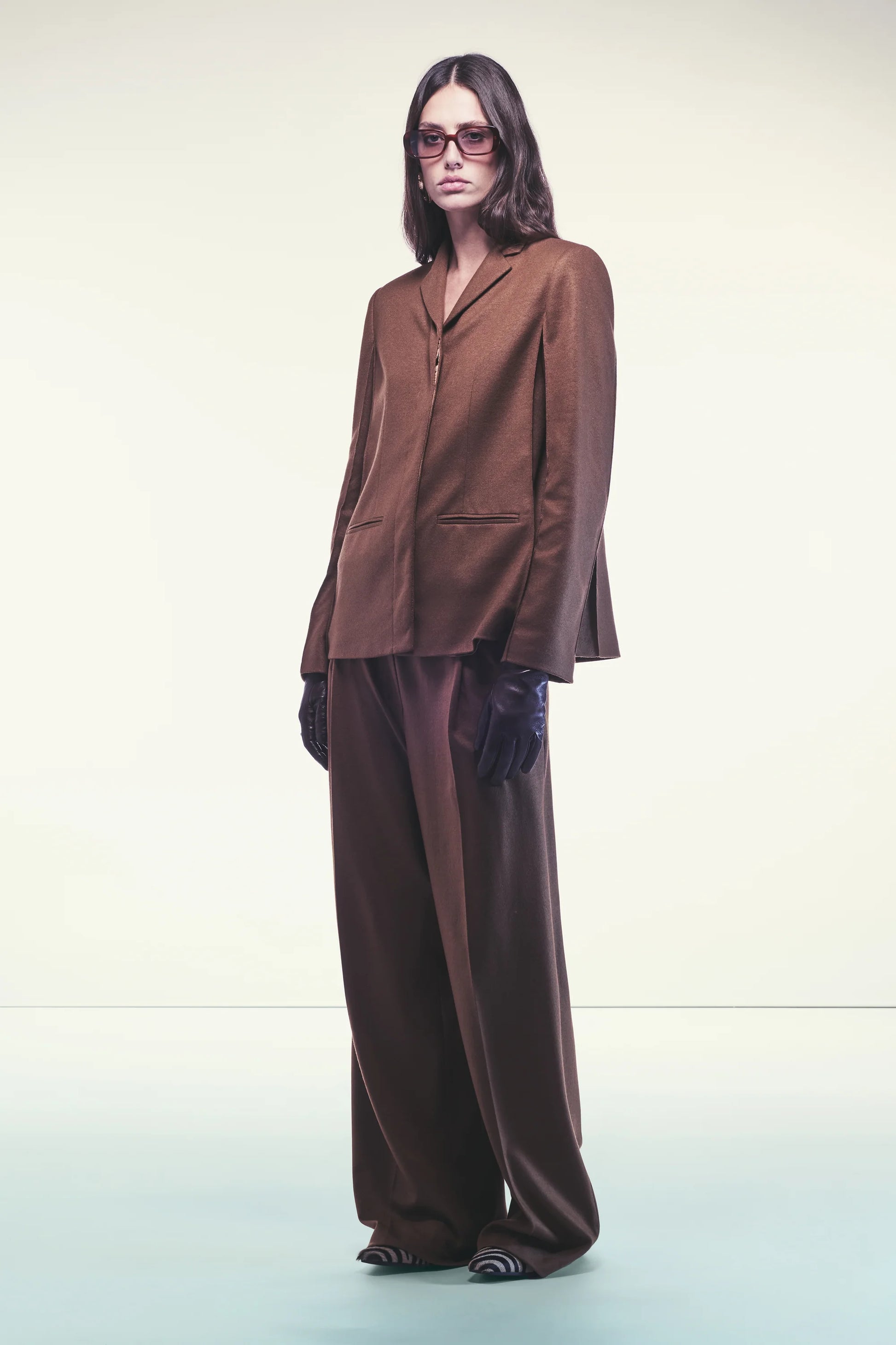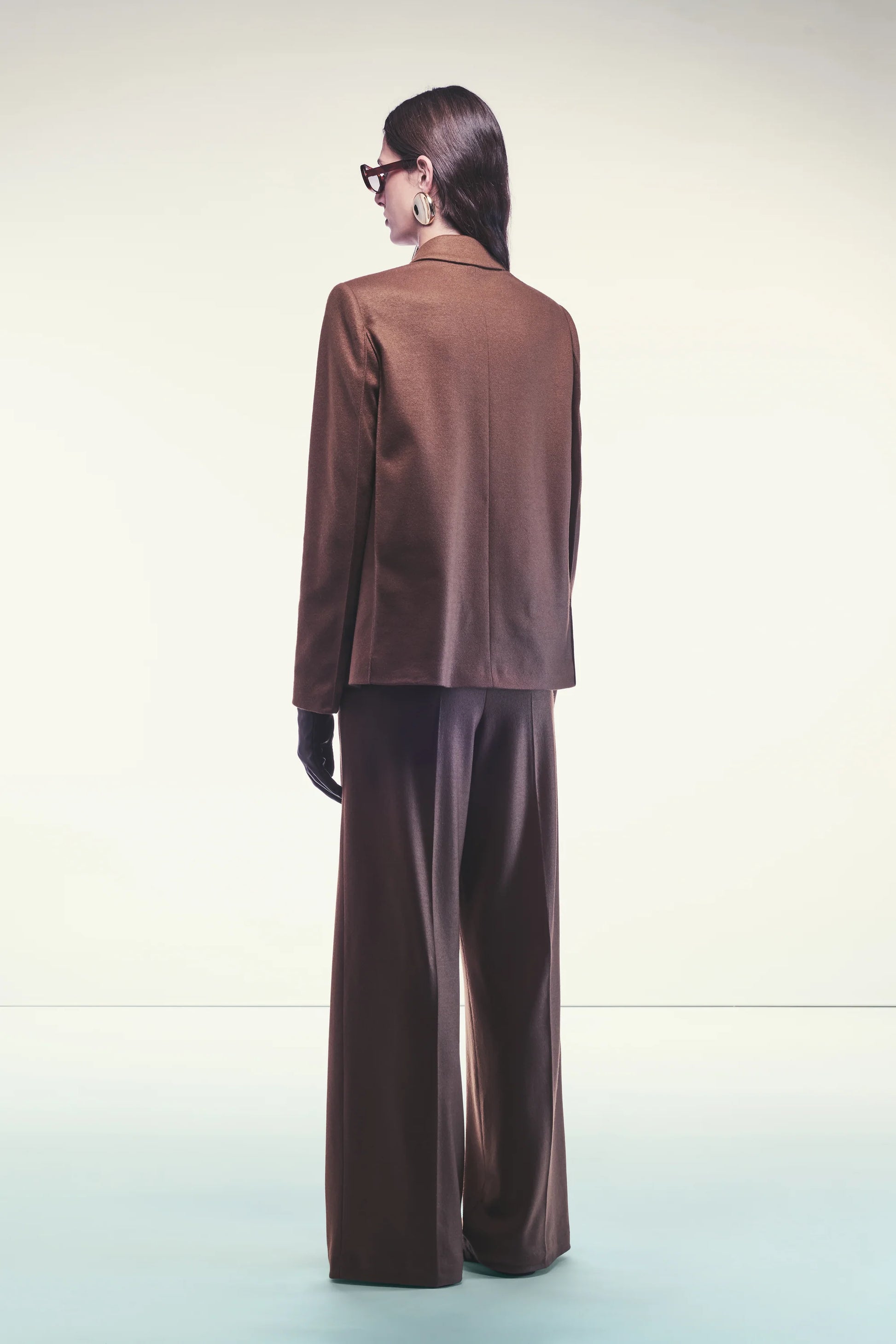Pantalons palazzo de caixmir marró clar. Cintura alta, tanca de cremallera i botó. Cama ampla amb plec premsat. Longitud extrallarga.