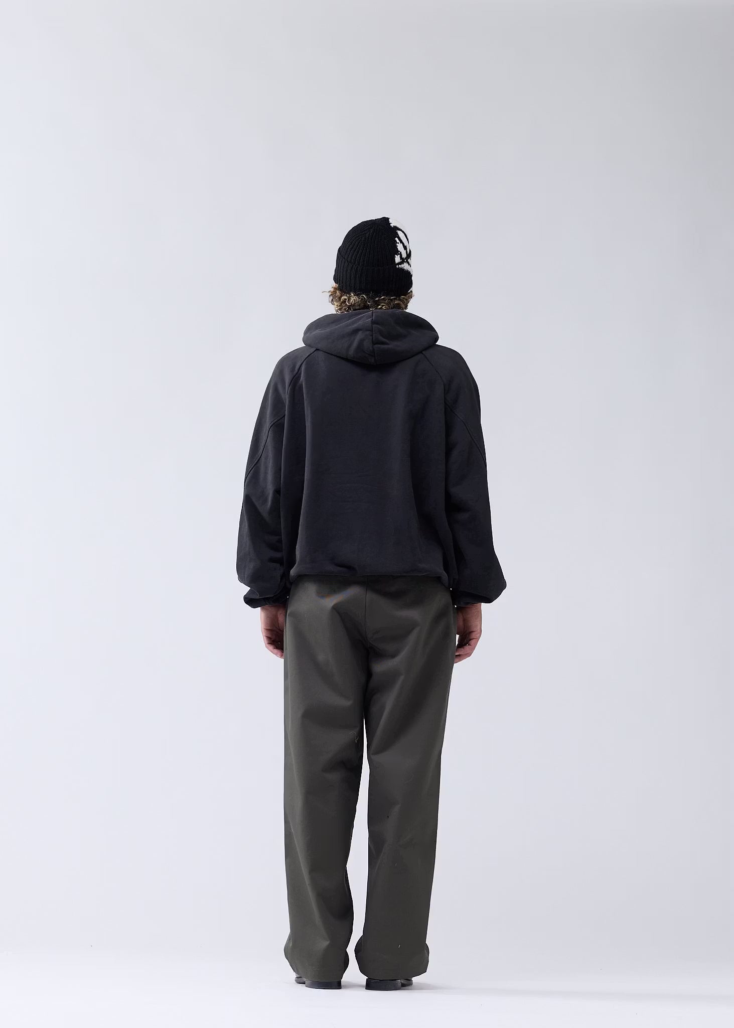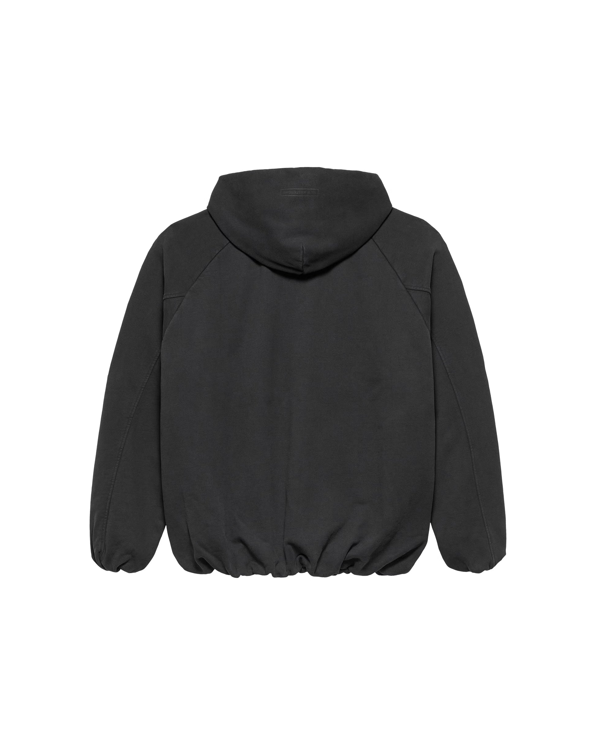 Aquesta dessuadora està confeccionada en pelfa de cotó tenyida en peça de 455 g/m² i tractada amb esprai PP. La silueta inflada s'aconsegueix gràcies als punys i la vora elàstica a l'interior, i la peça està totalment folrada amb suau jersei de cotó.