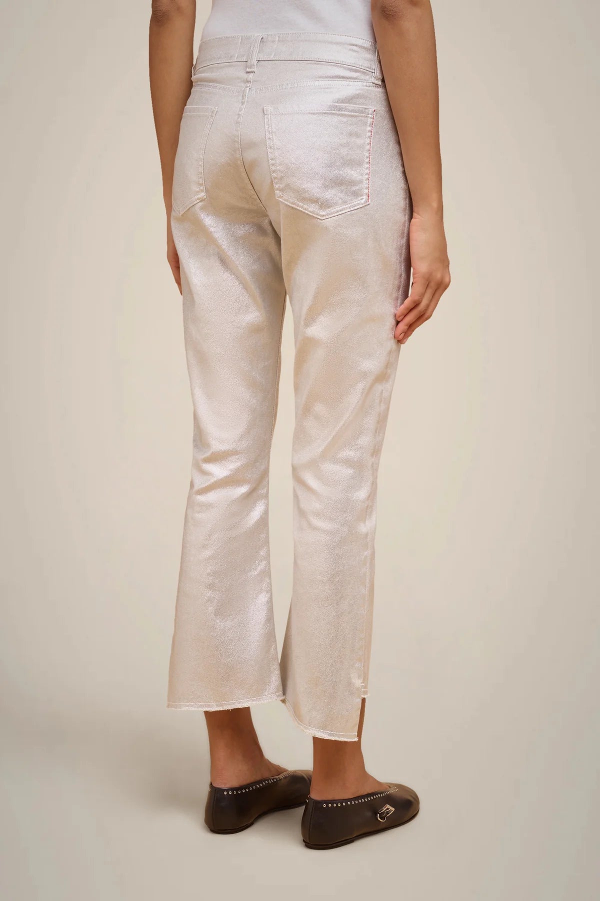Texans acampanats de cinc butxaques de denim laminat, cintura regular, cintura amb travetes, tancament davanter amb cremallera i botó, sota asimètric amb serrells, canesú del darrere amb butxaques de pegat.