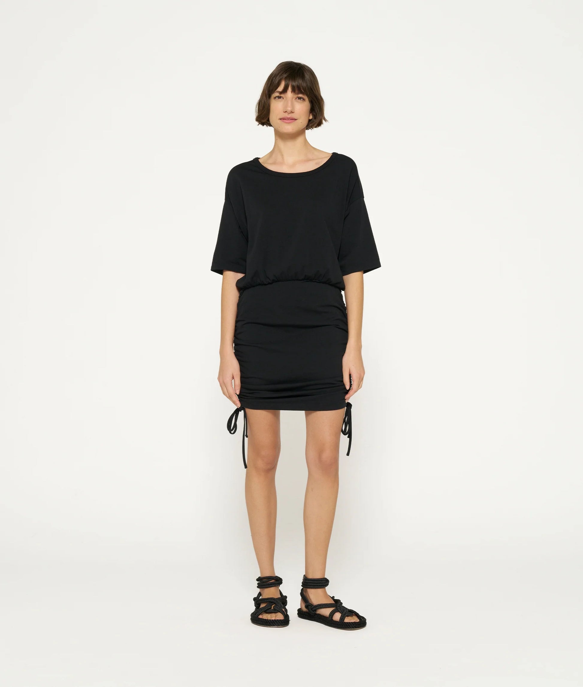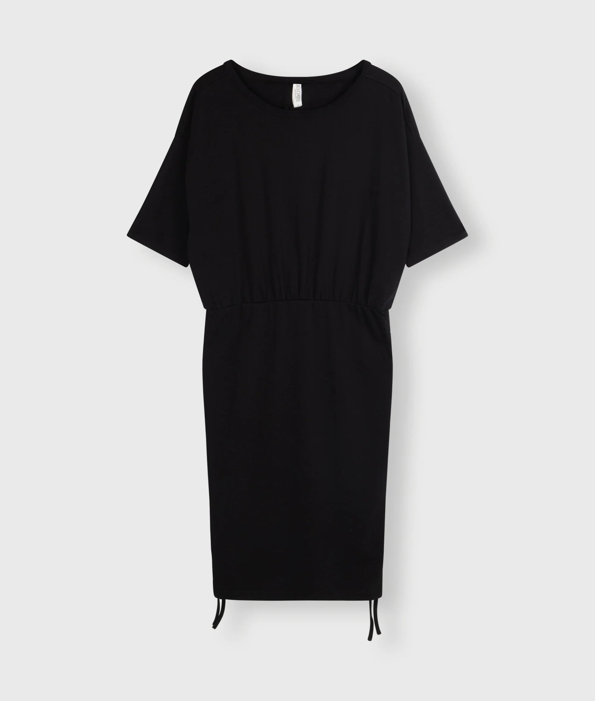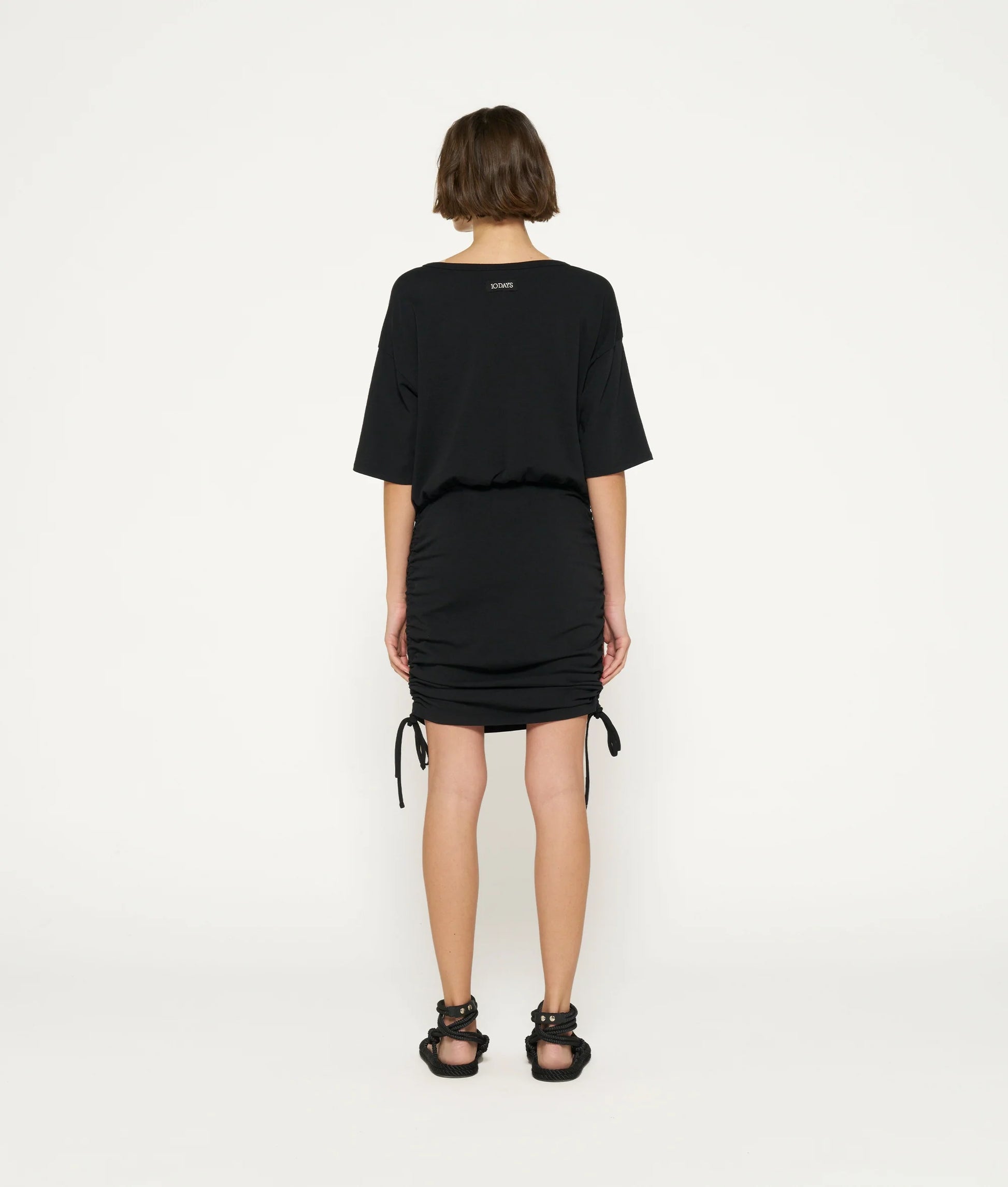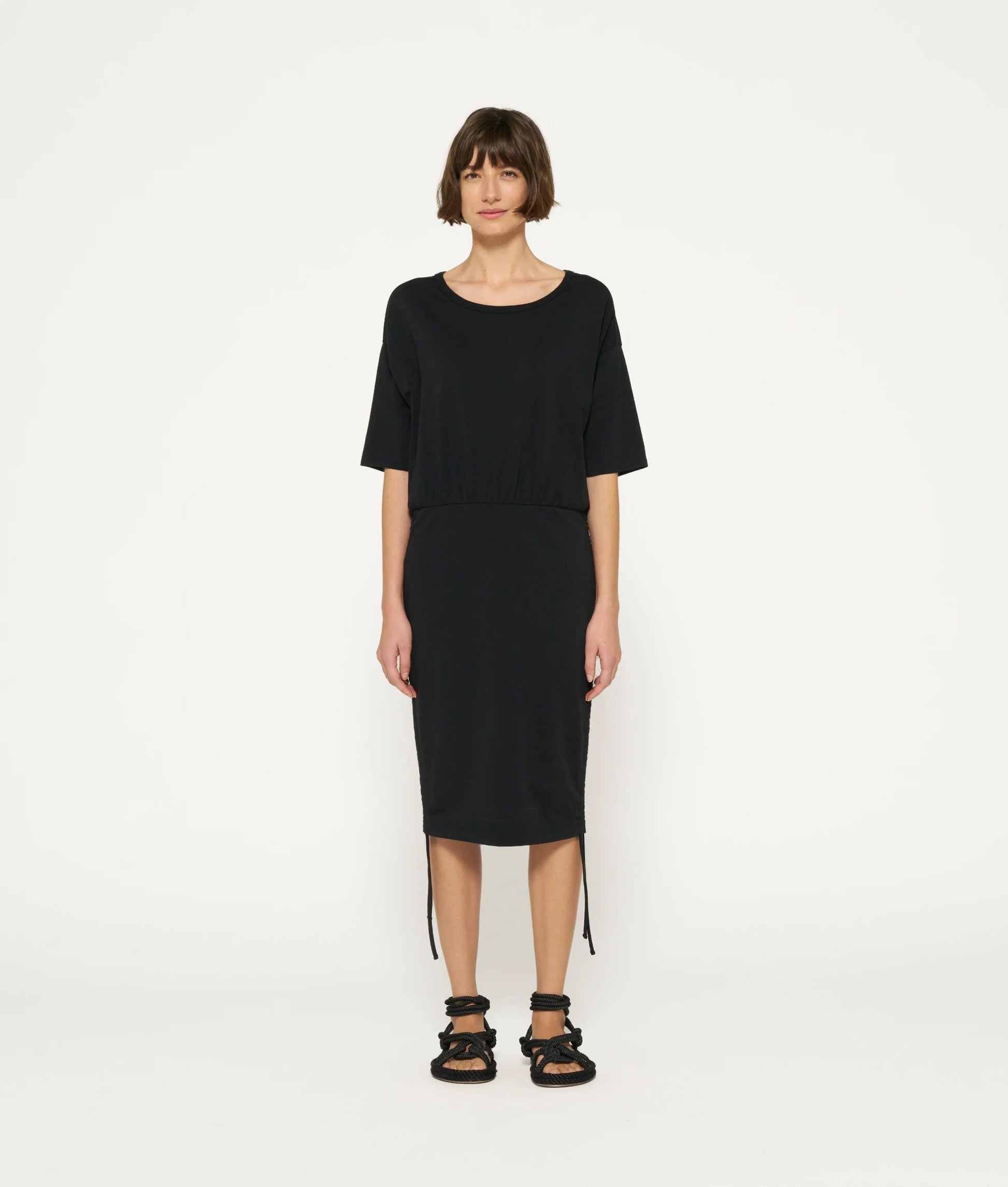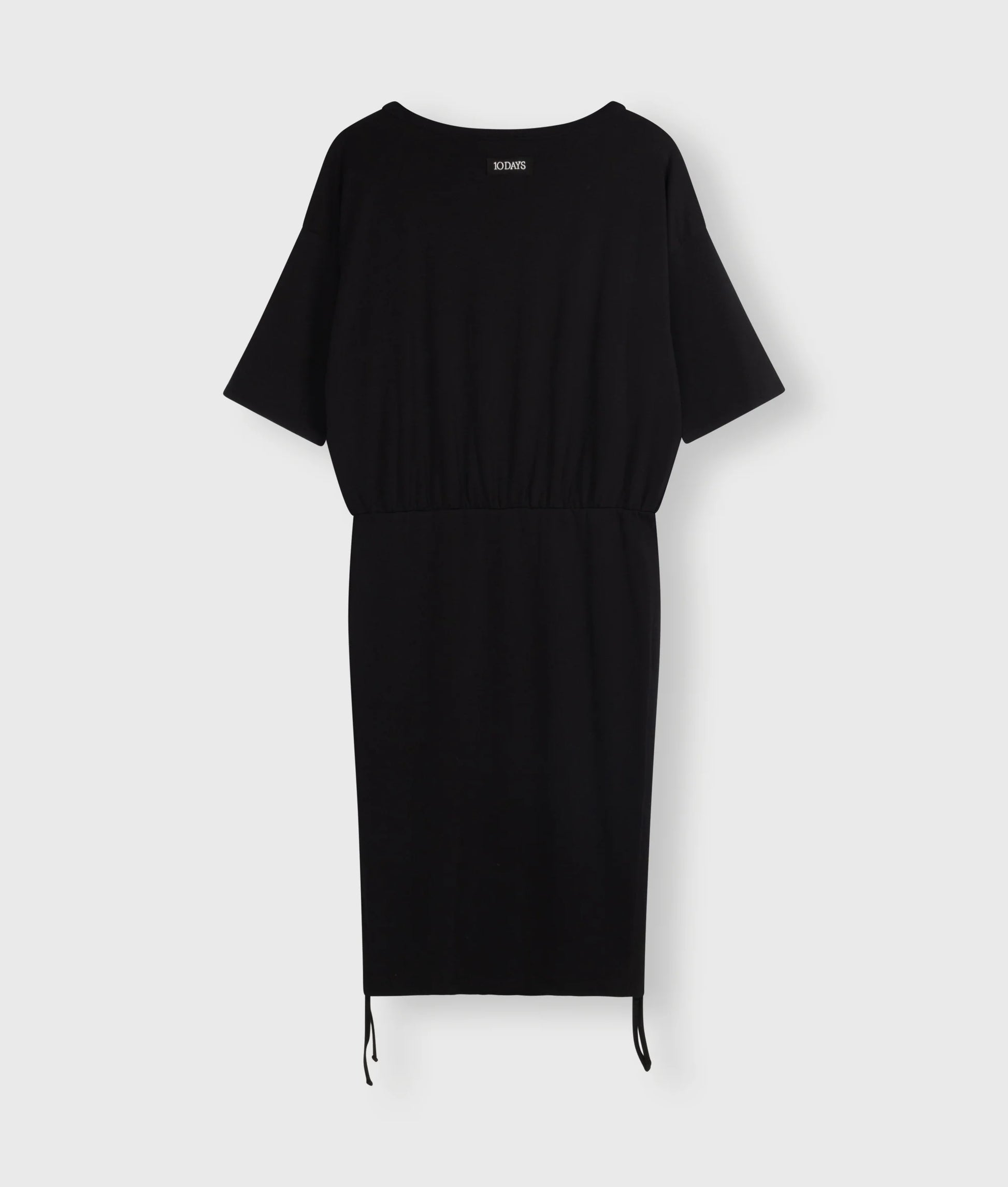 Presenta cordons al llarg de les costures laterals per donar al vestit la longitud desitjada, el coll rodó de punt elàstic i l'etiqueta a l'esquena.