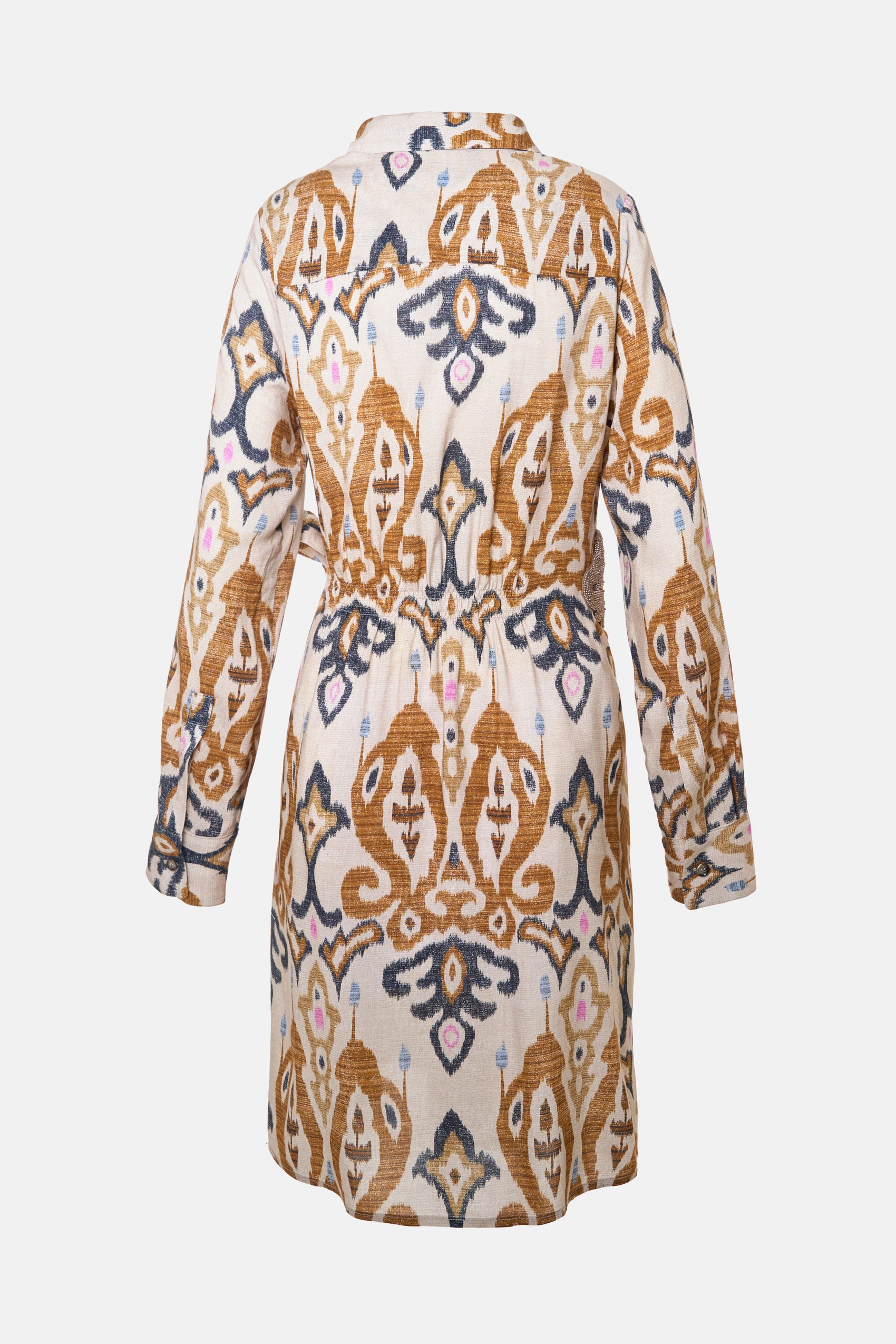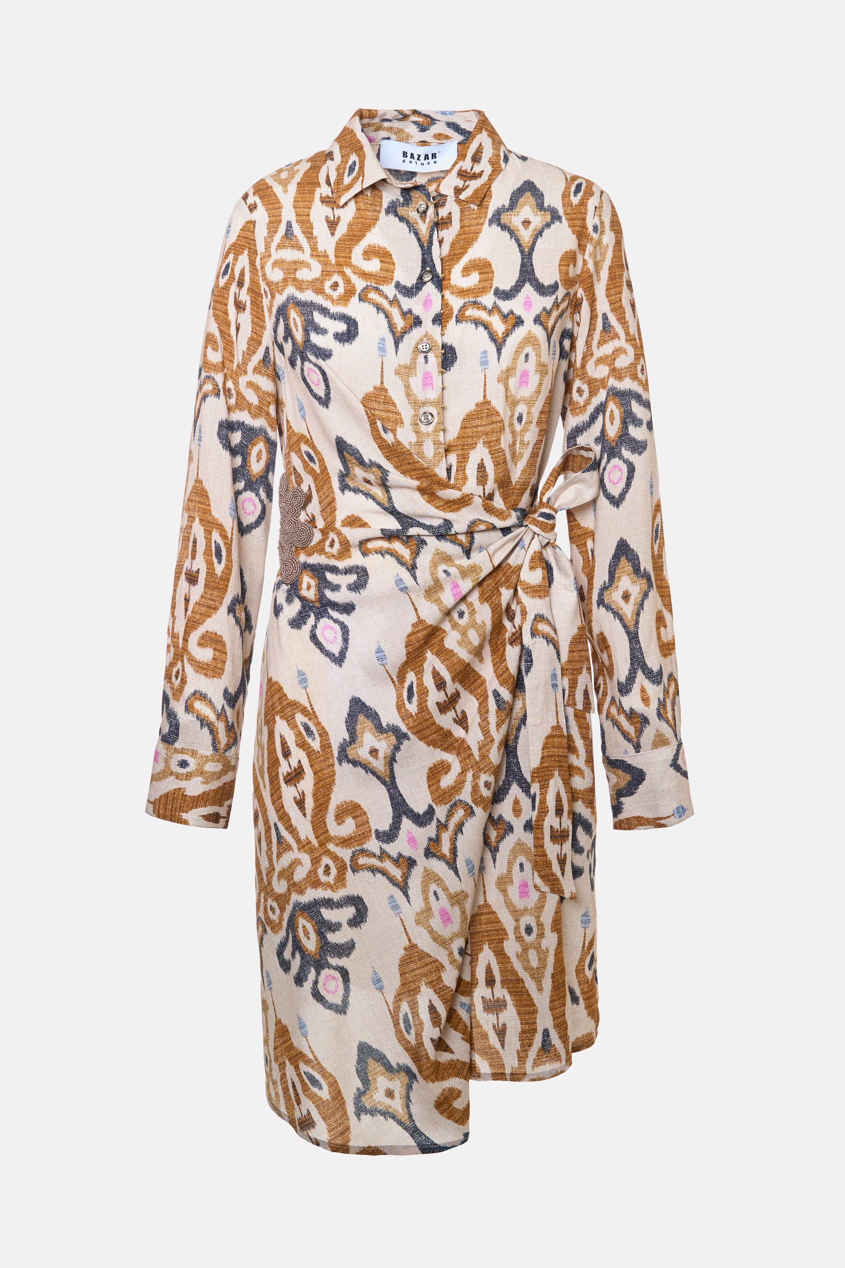 Aquest vestit camisero de Bazar Deluxe destaca pel seu original estampat ètnic en tons càlids. Dissenyat amb coll clàssic, tanca de botons i cinturó nuat, ofereix un ajustament afavoridor i còmode.