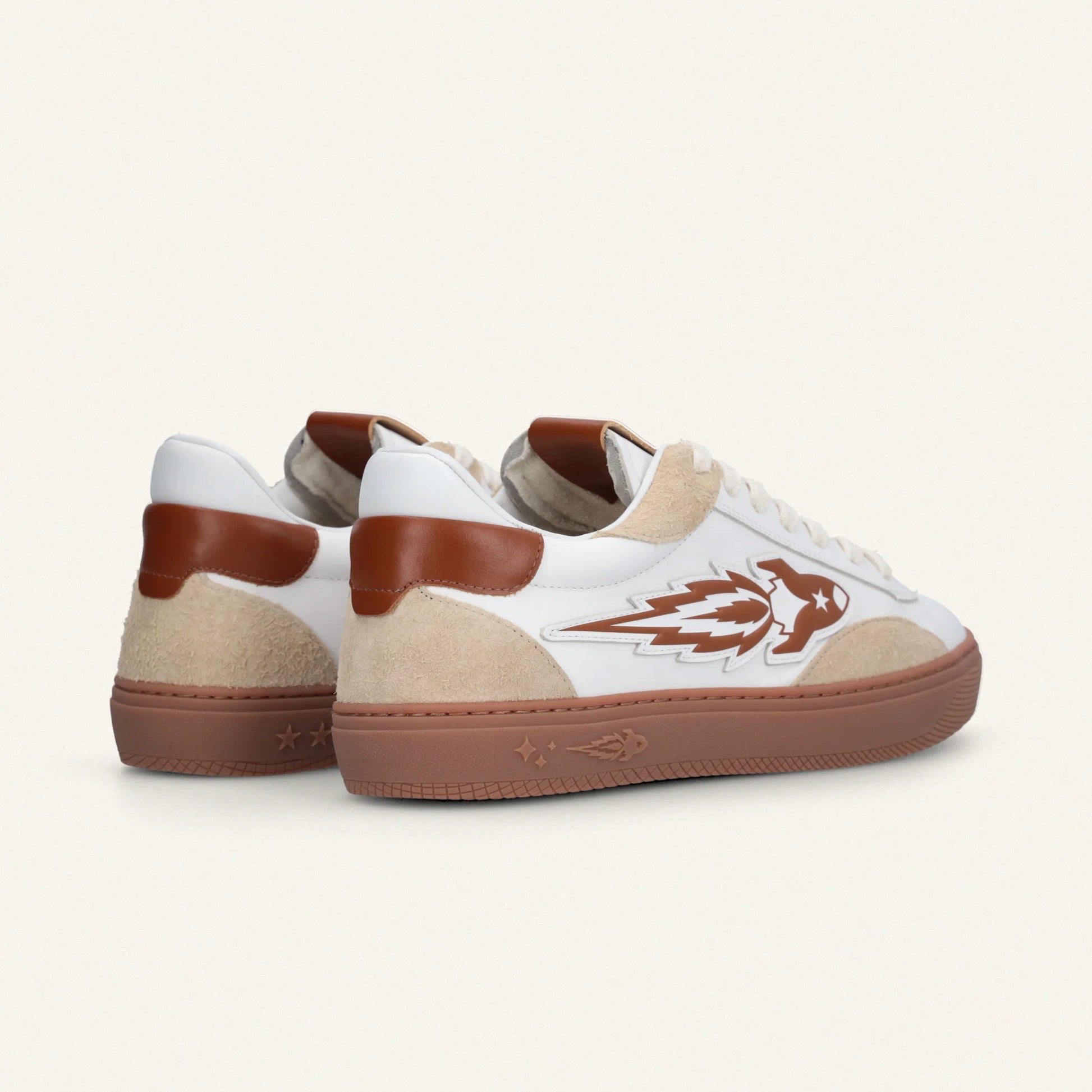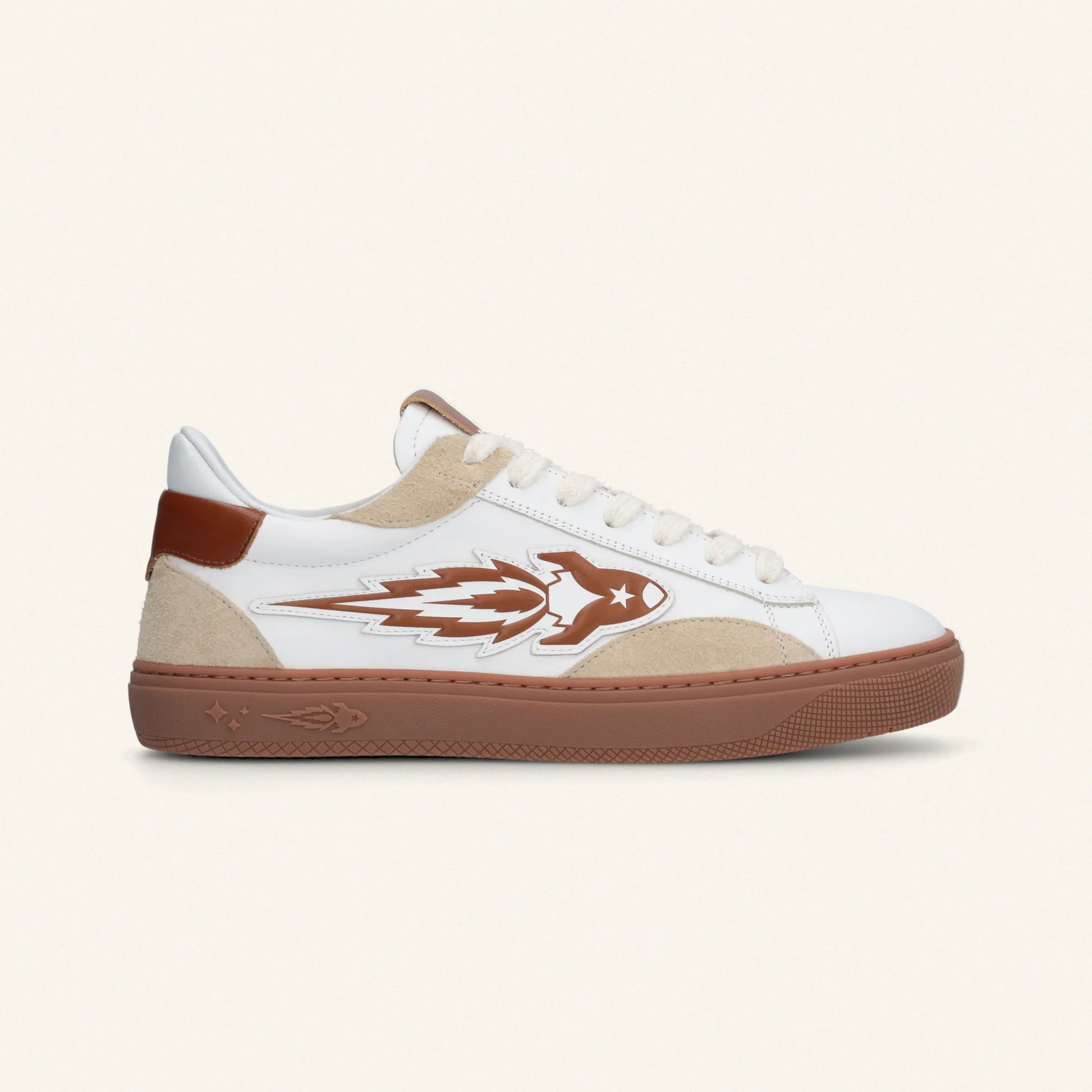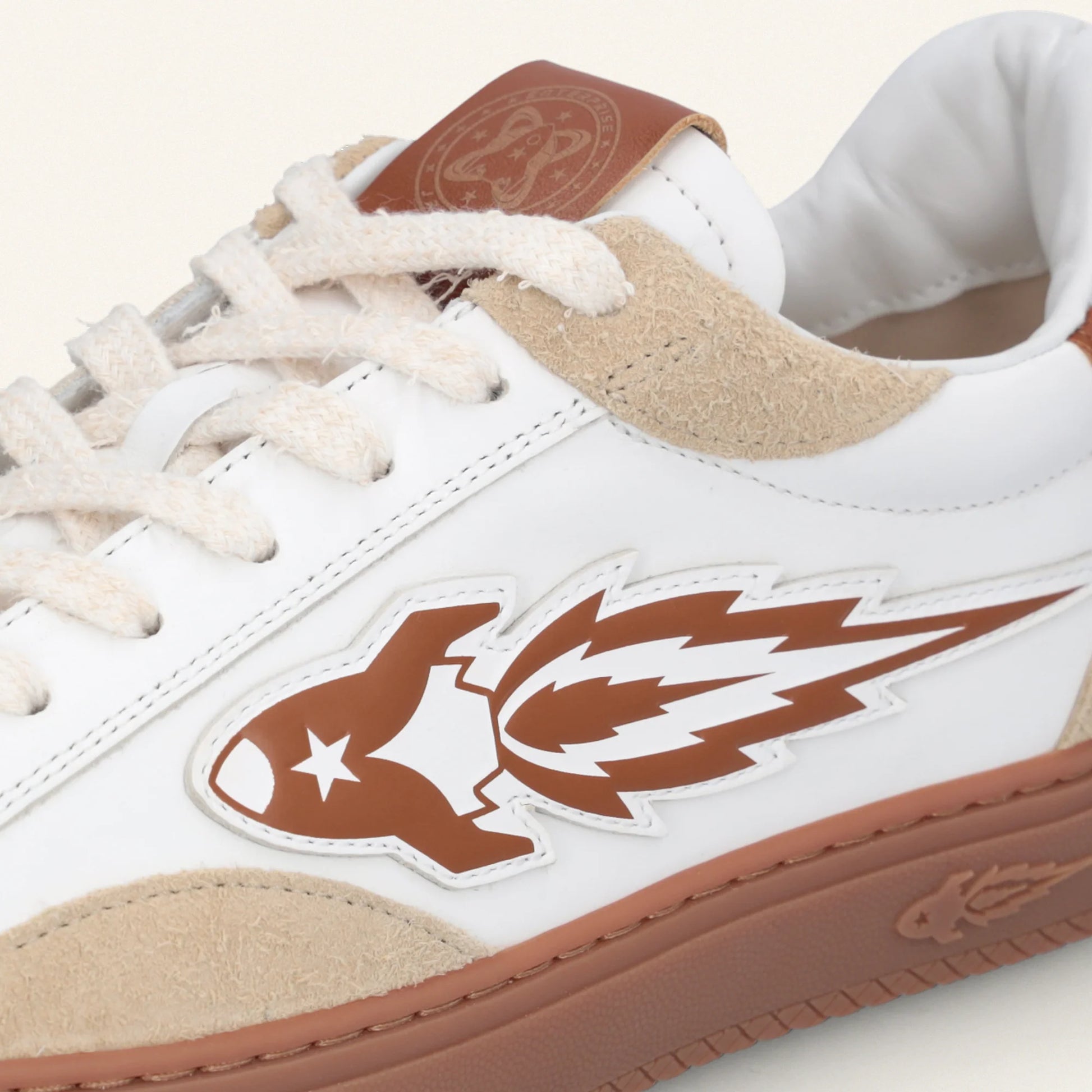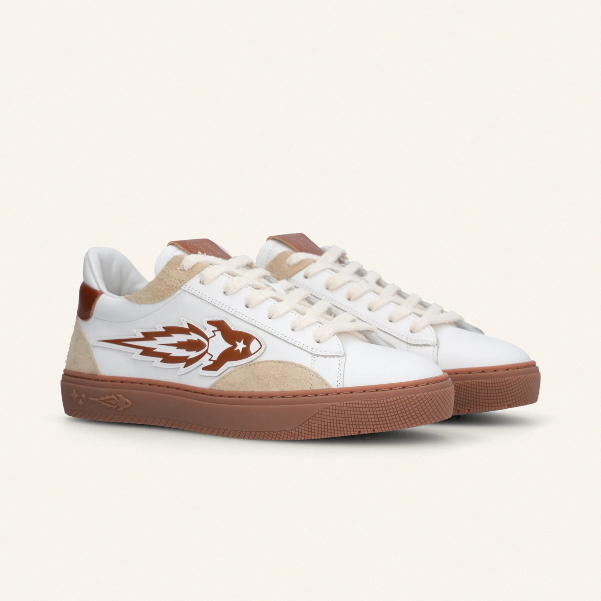 Fabricada amb pell de vedell blanca, està decorada amb l'inconfusible logotip EJ Rocket a la part superior.