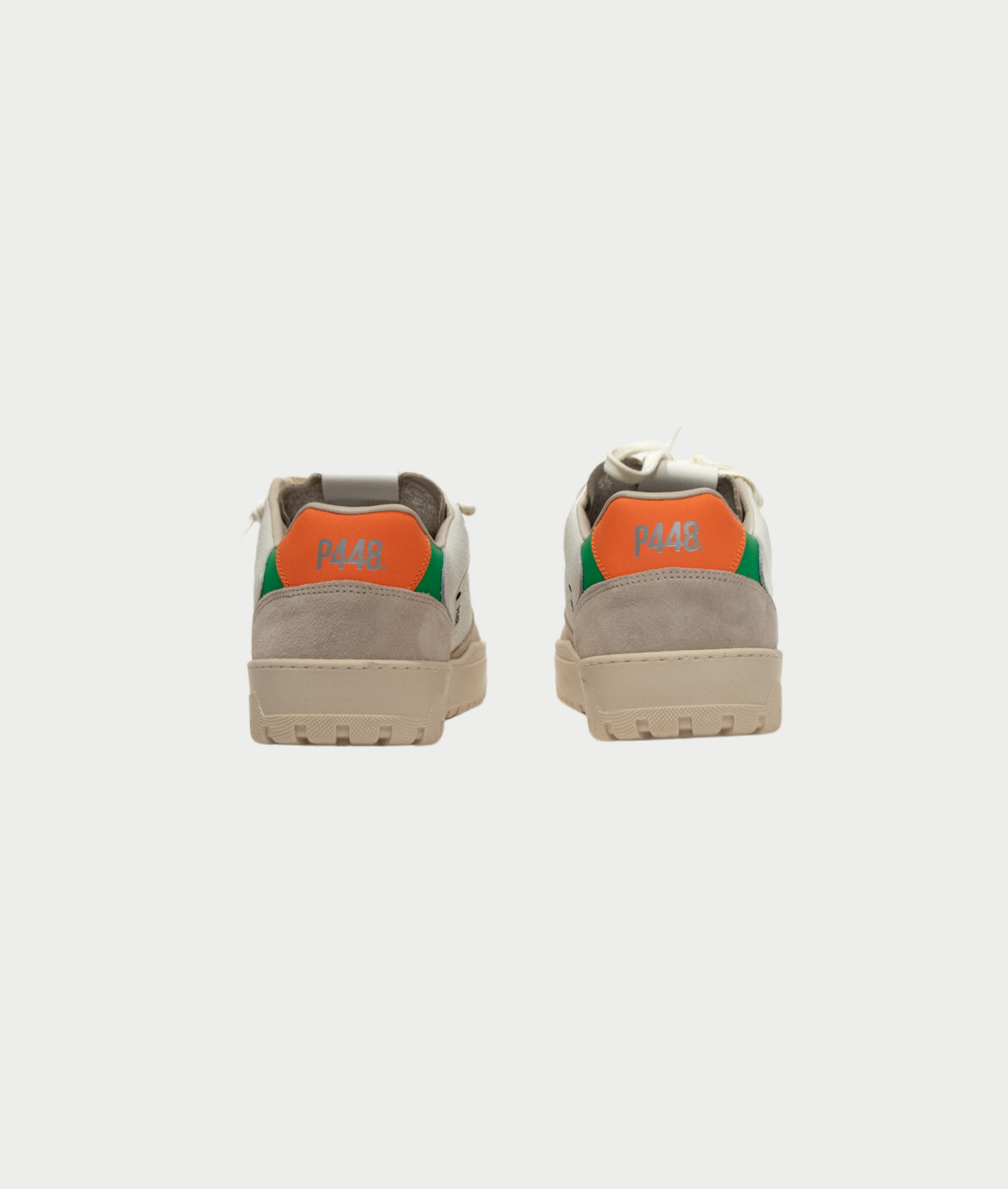 Aquestes Mason blanques presenten un empeine i una puntera de pell grisa, complementades amb un detall en color taronja i verd a la part posterior.