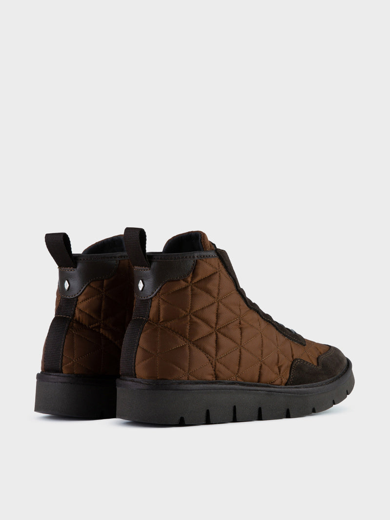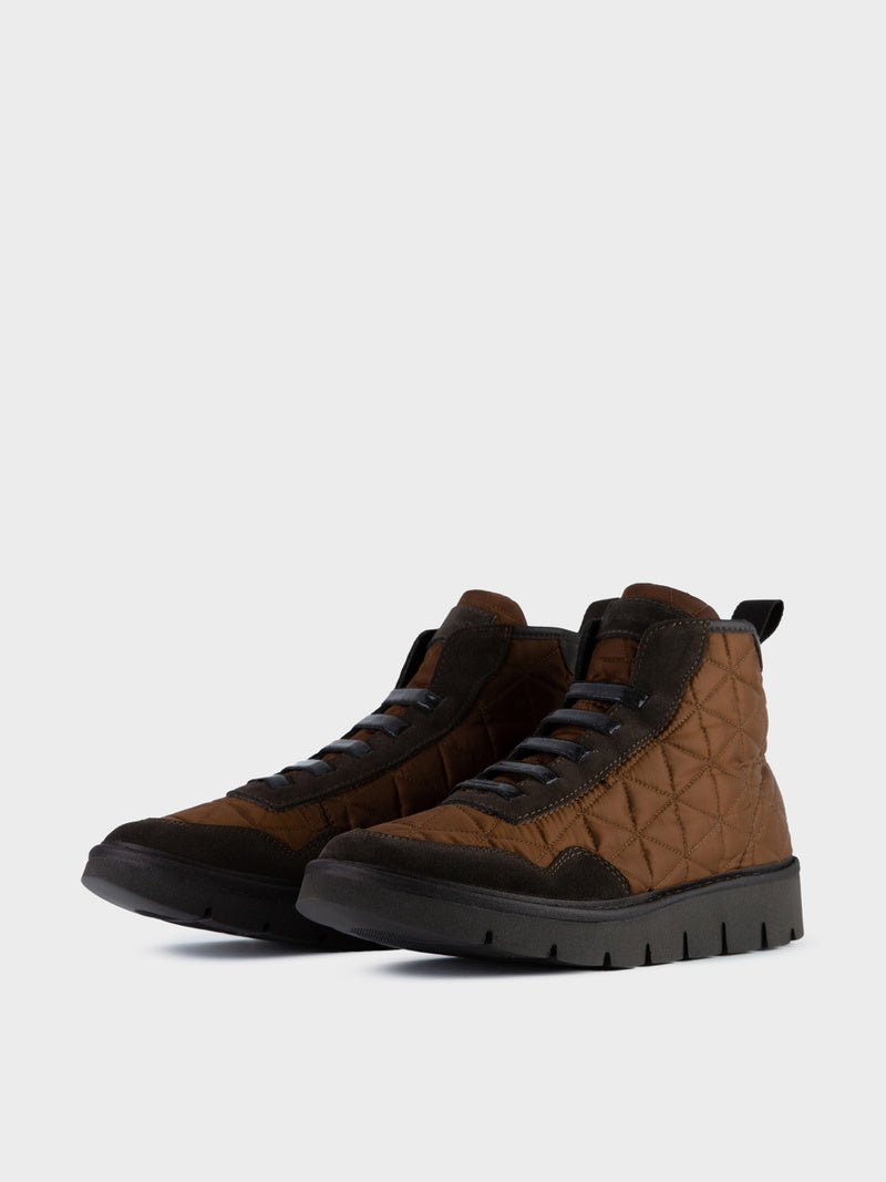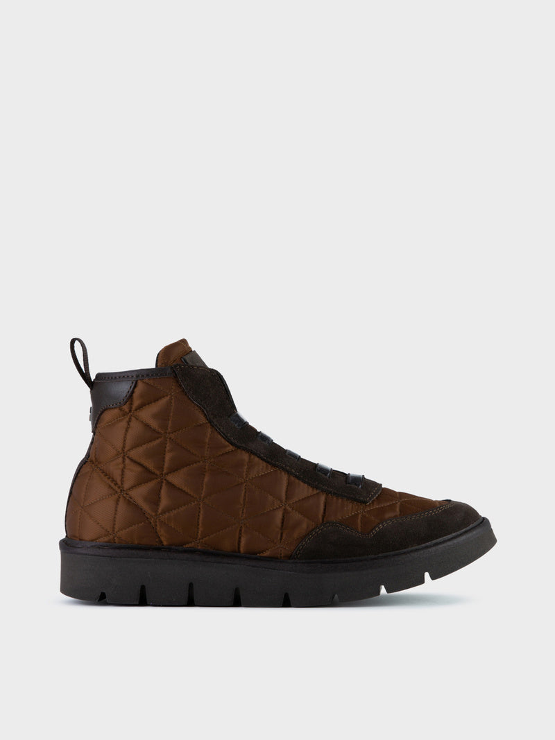 Sabates abotinades per a dona P05 amb pala d'inspiració running de niló repuntat marró, insercions d'ante i cordons elàstics efecte brillant.