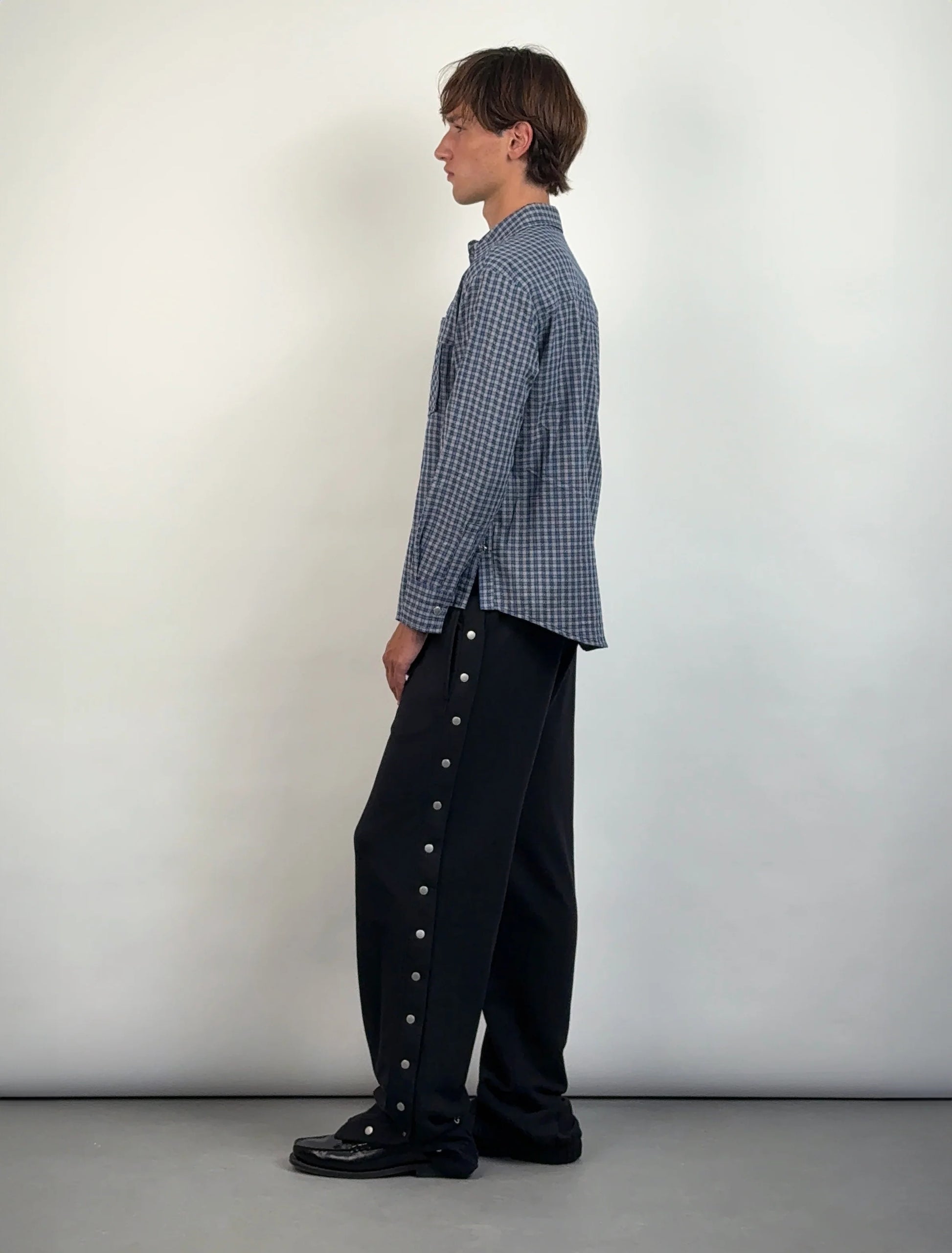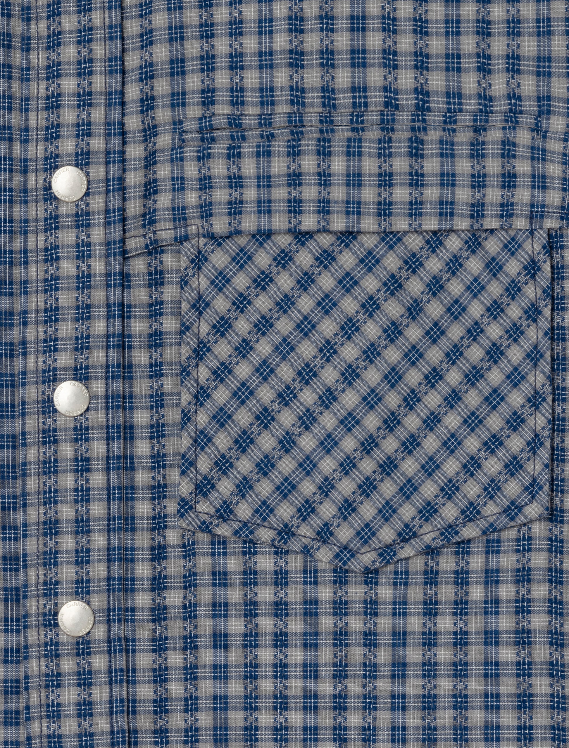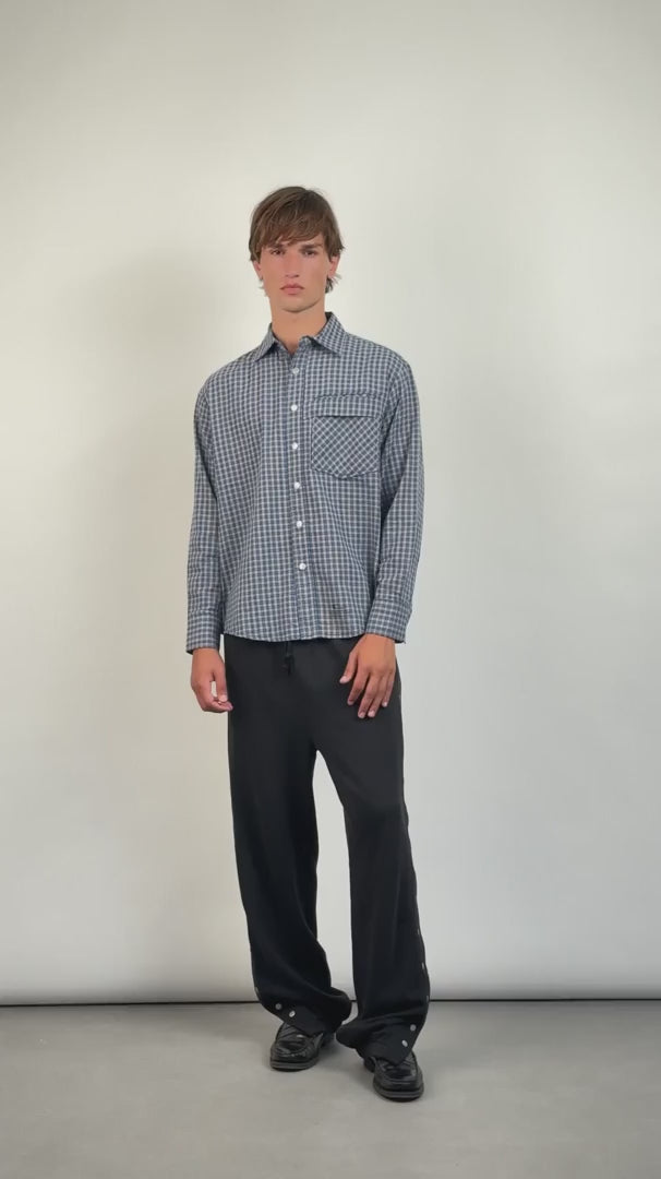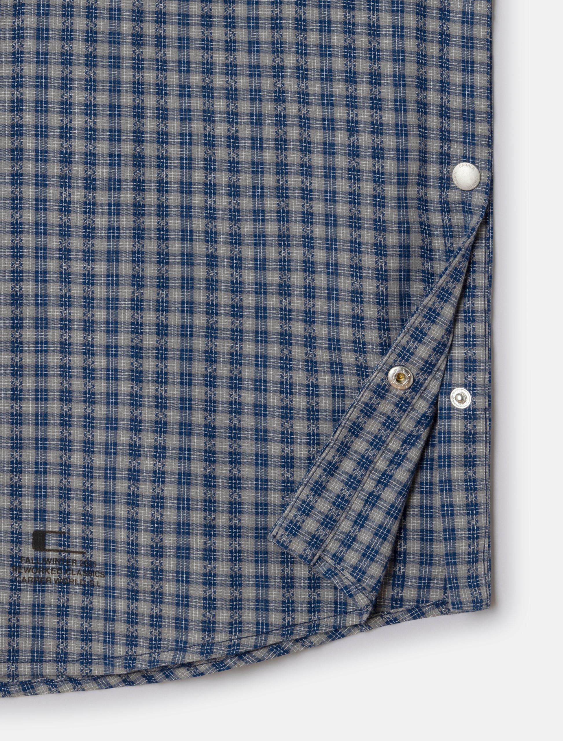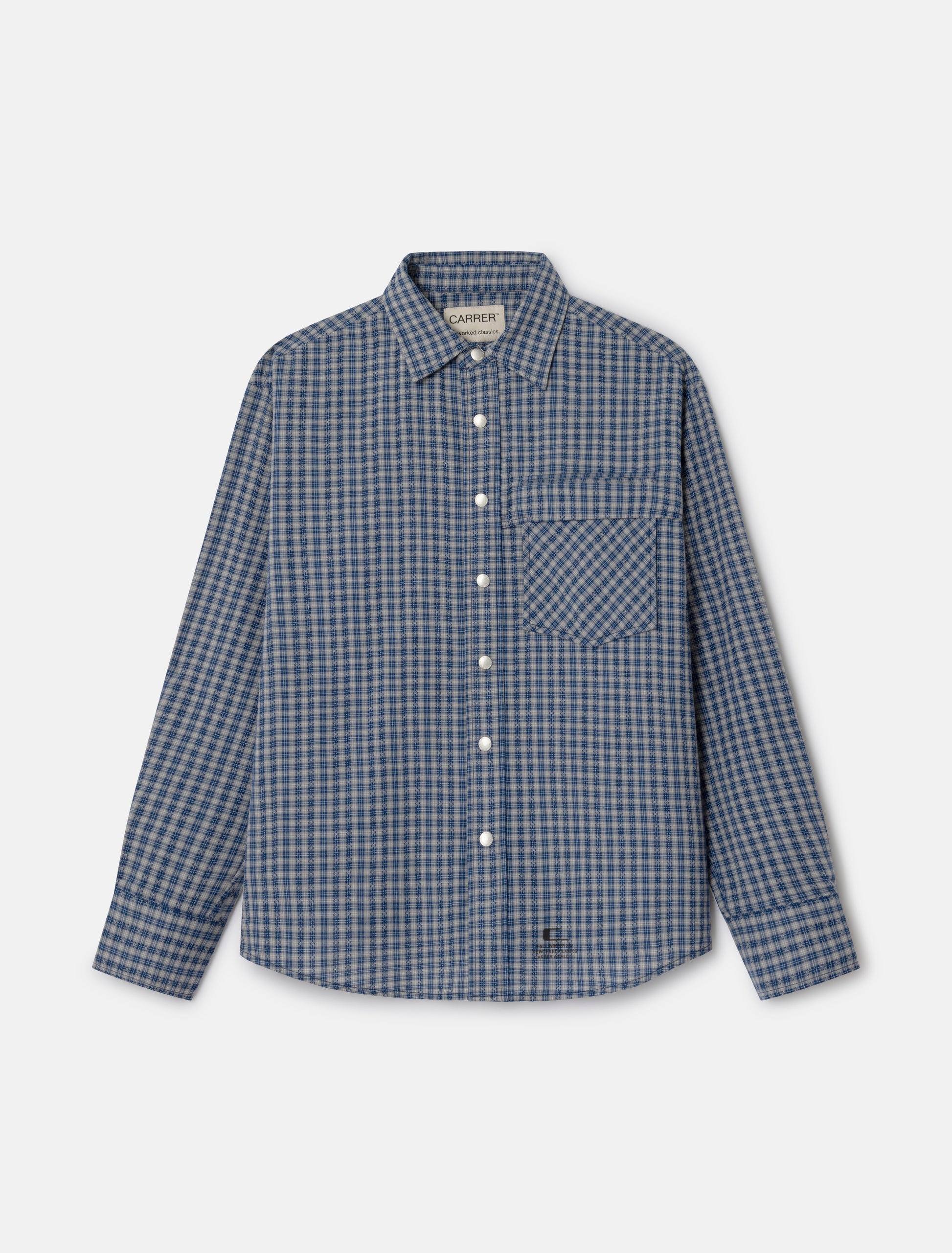Camisa de algodón a cuadros con botones a presión ocultos en la parte delantera. El bolsillo del pecho está cortado al bies y colocado hacia fuera como una capa cosida. Los botones a presión de las costuras laterales se pueden abrir o cerrar para cambiar el estilo, mientras que el sello CARRER desgastado remata la camisa en el dobladillo.