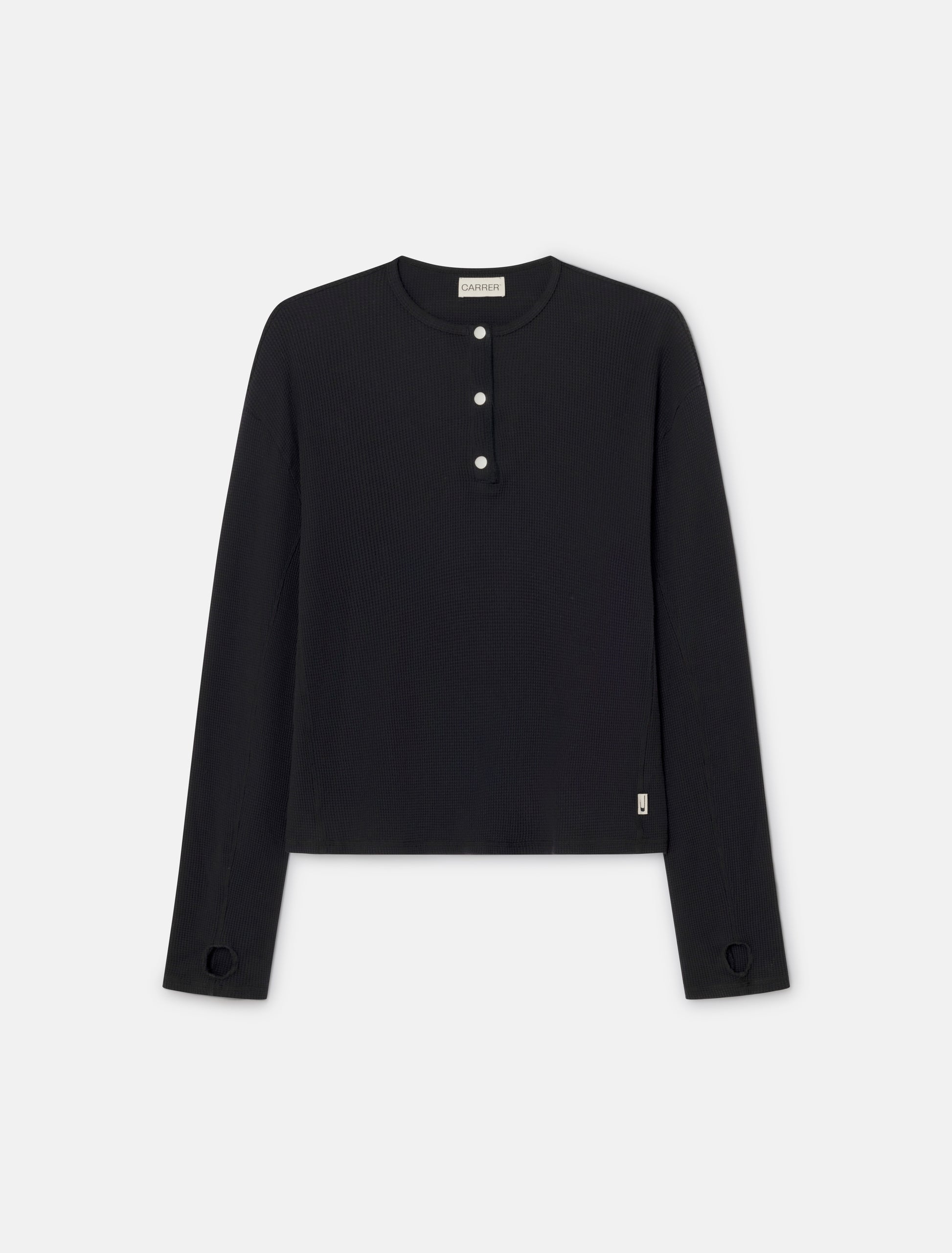 Actualizada con mangas alargadas con orificios para los dedos y botones a presión CARRER personalizados, combina referencias históricas con detalles contemporáneos.