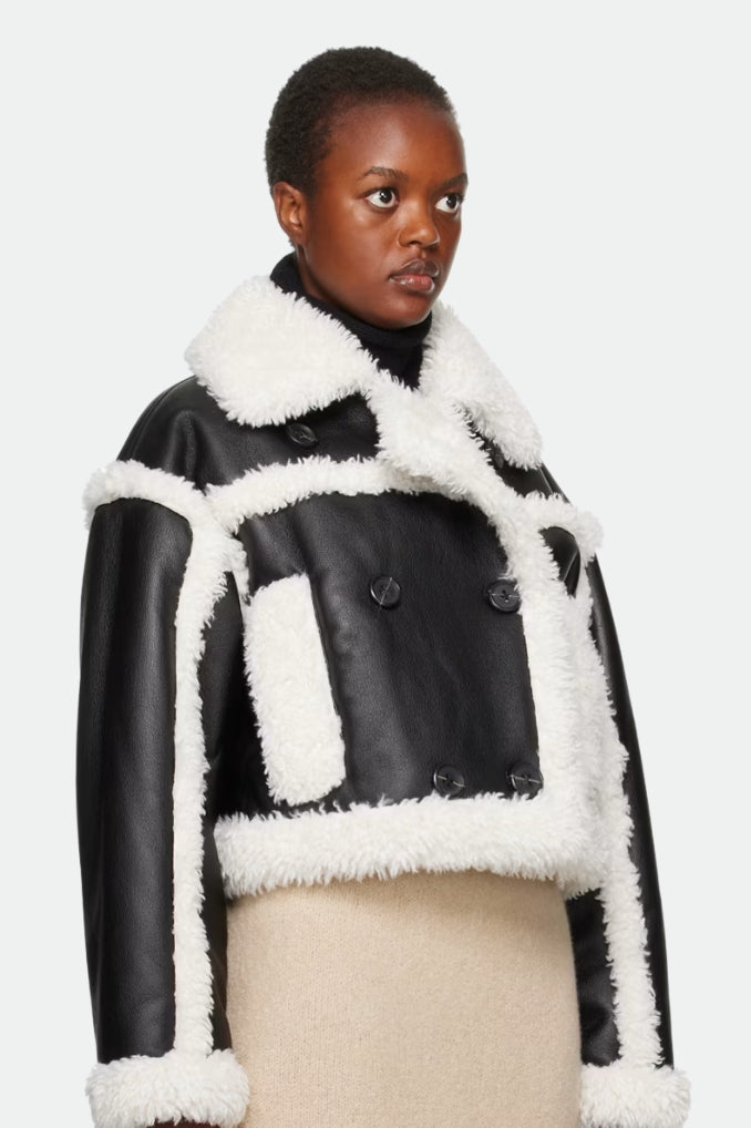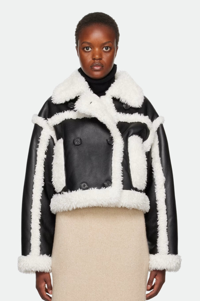 Kristy es una chaqueta corta de imitación de piel de oveja diseñada para un ajuste oversize. Esta prenda se ve realzada por los hombros caídos y el frente cruzado.