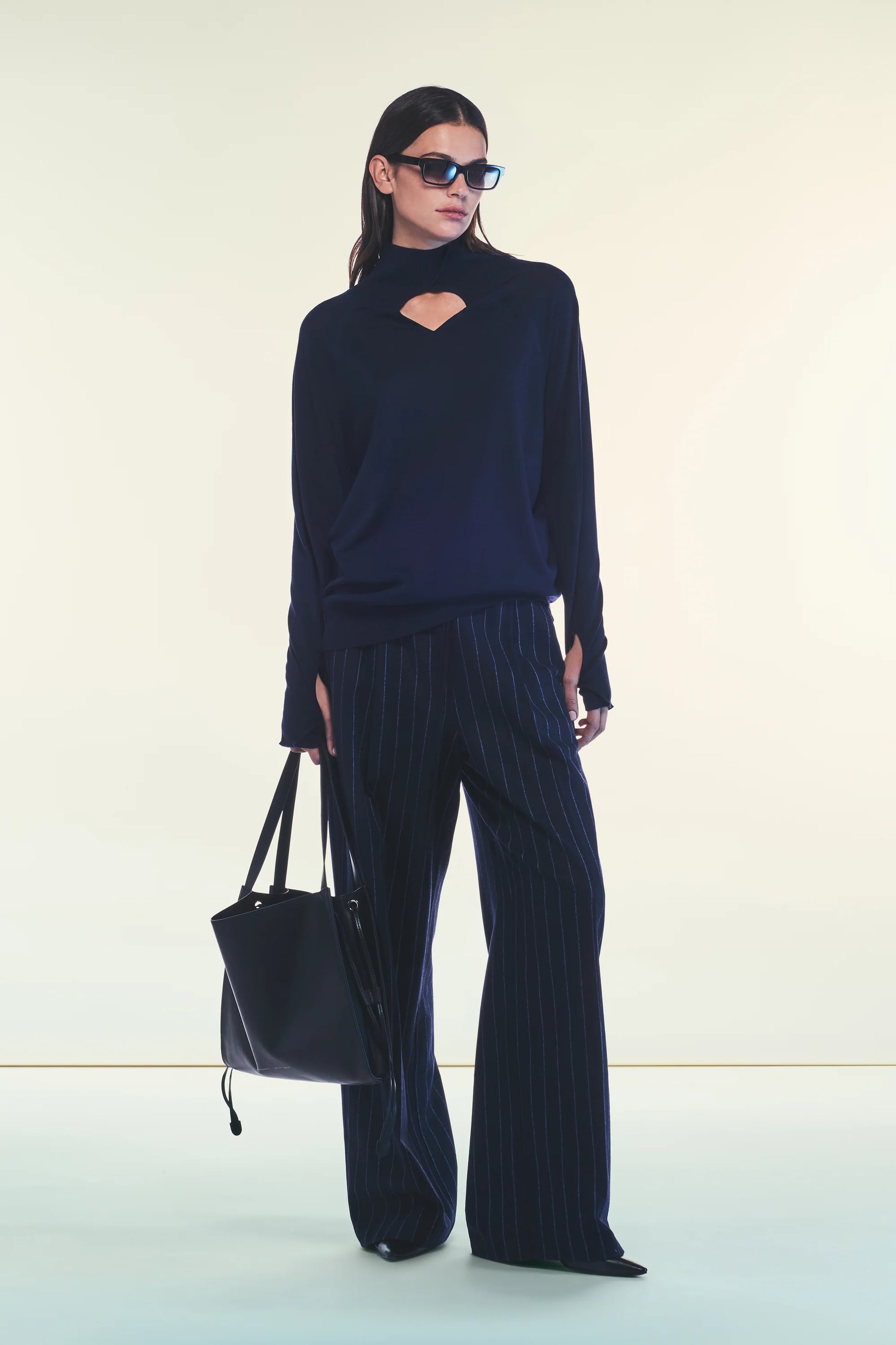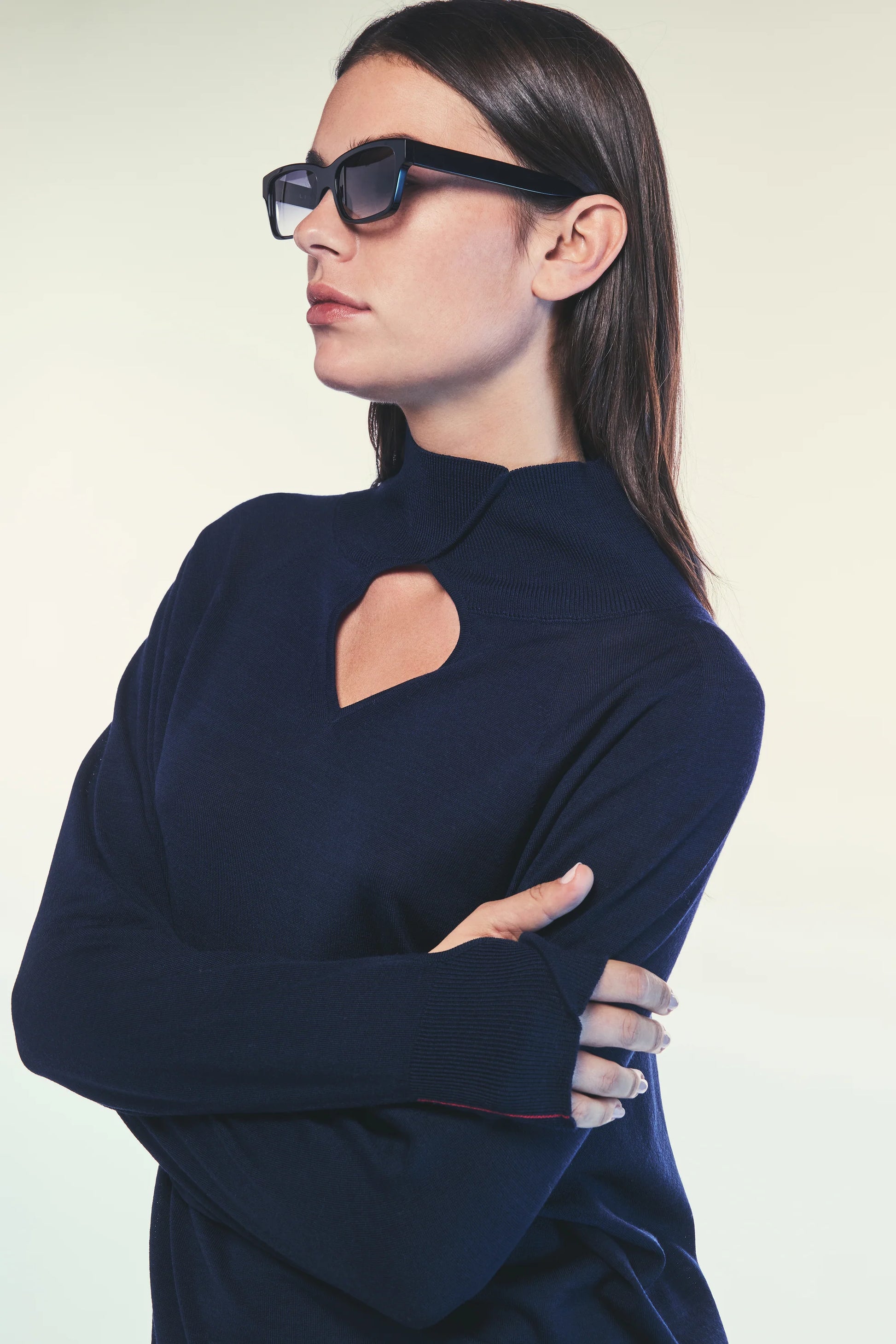 Jersey de manga larga de lana merino extrafina con detalle abierto en la parte delantera del cuello. Manga y cuello con doble elástico.