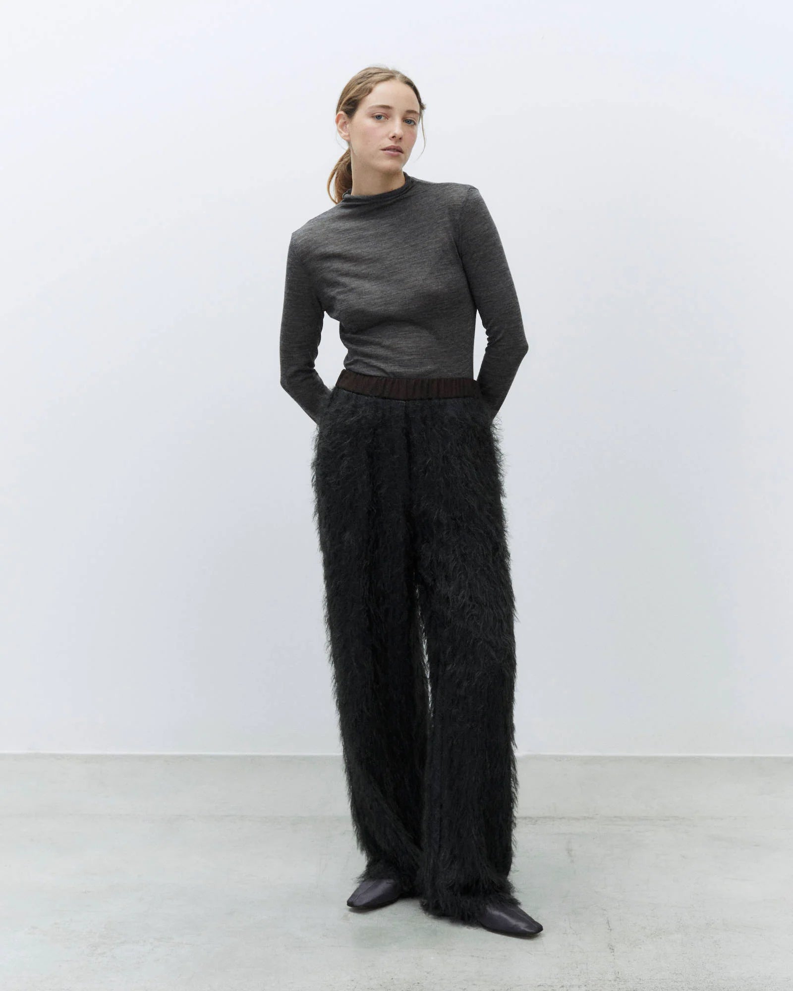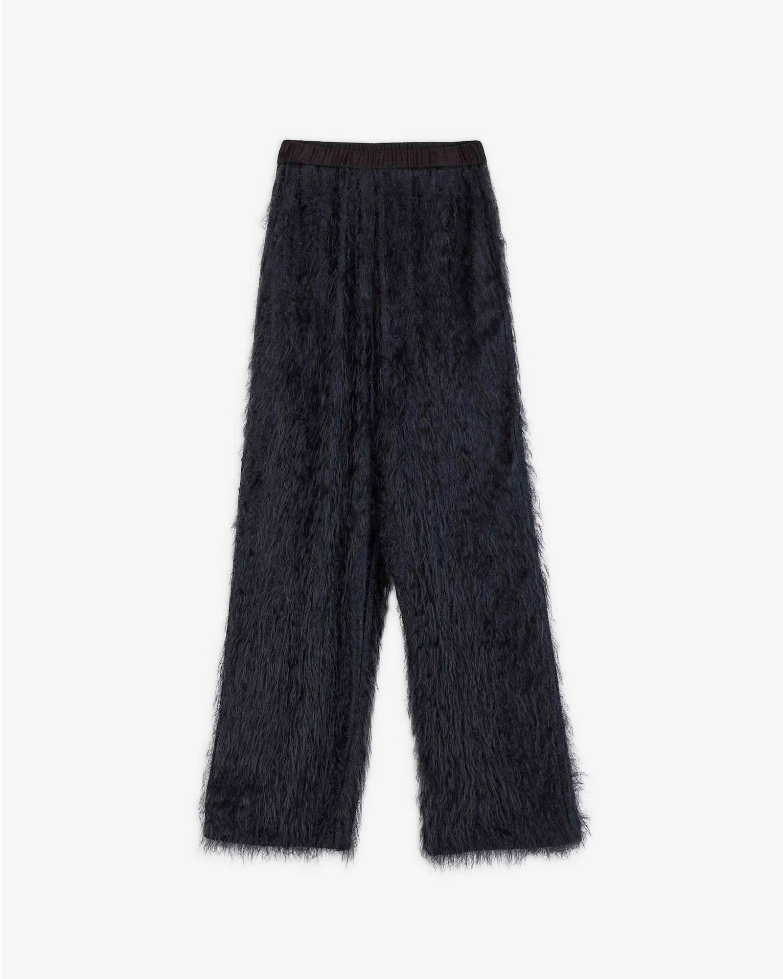 Pantalón con flecos de tejido 100 % viscosa. Pierna ancha. Cintura con cinturón elástico de franela a juego. Cierre frontal con cremallera. Bolsillos laterales.
