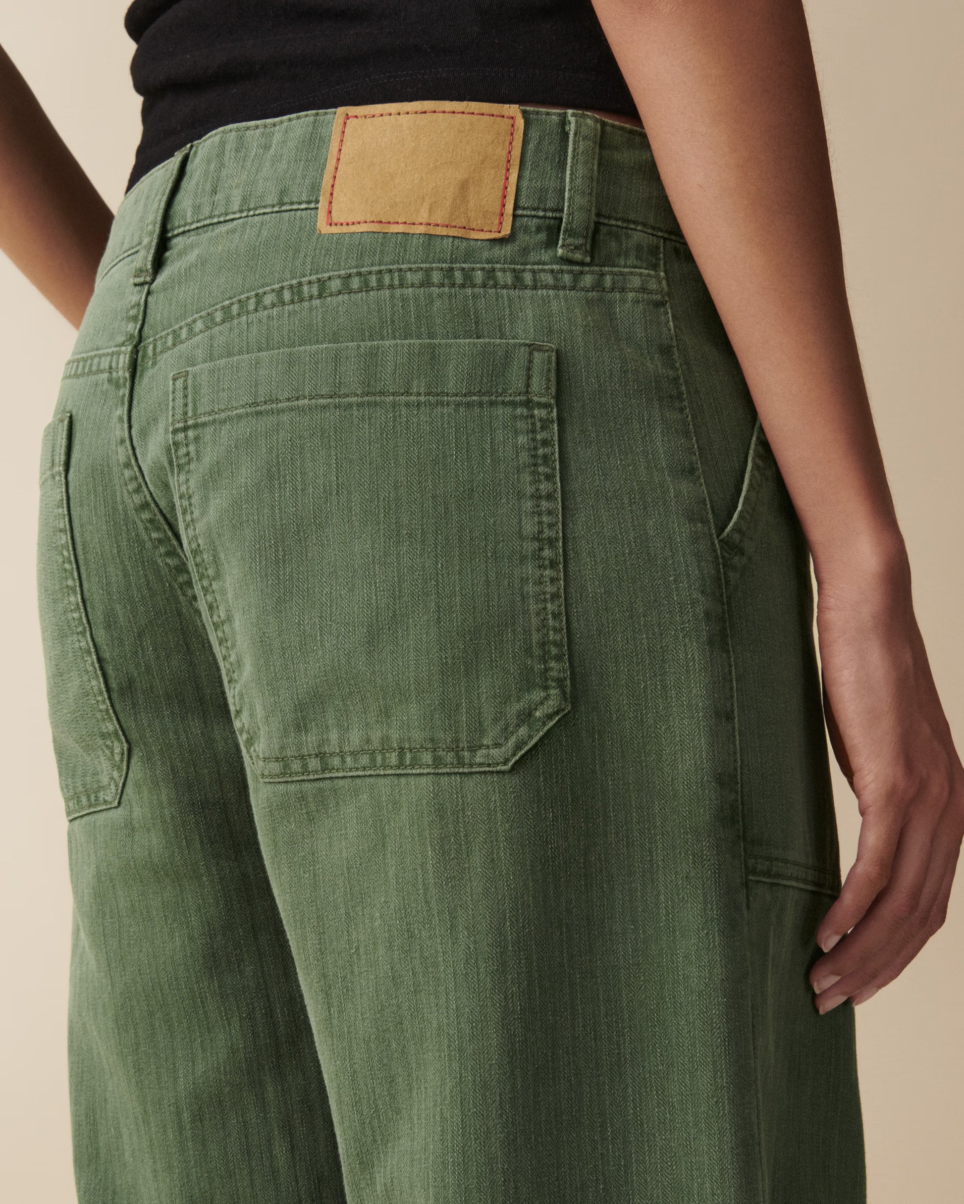 Guell es un pantalón acampanado inspirado en los carpinteros, con refinados detalles de ropa de trabajo. Presenta una cintura baja, pernera acampanada extra larga y holgada, y bolsillos de parche delante y detrás.