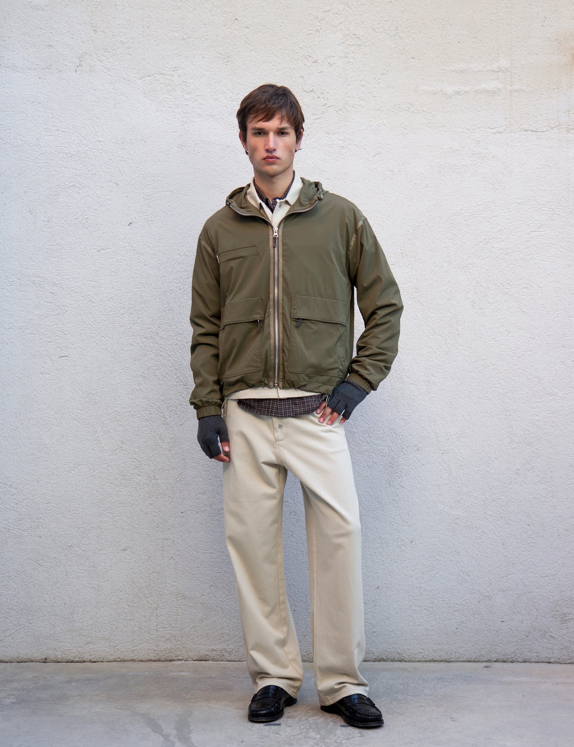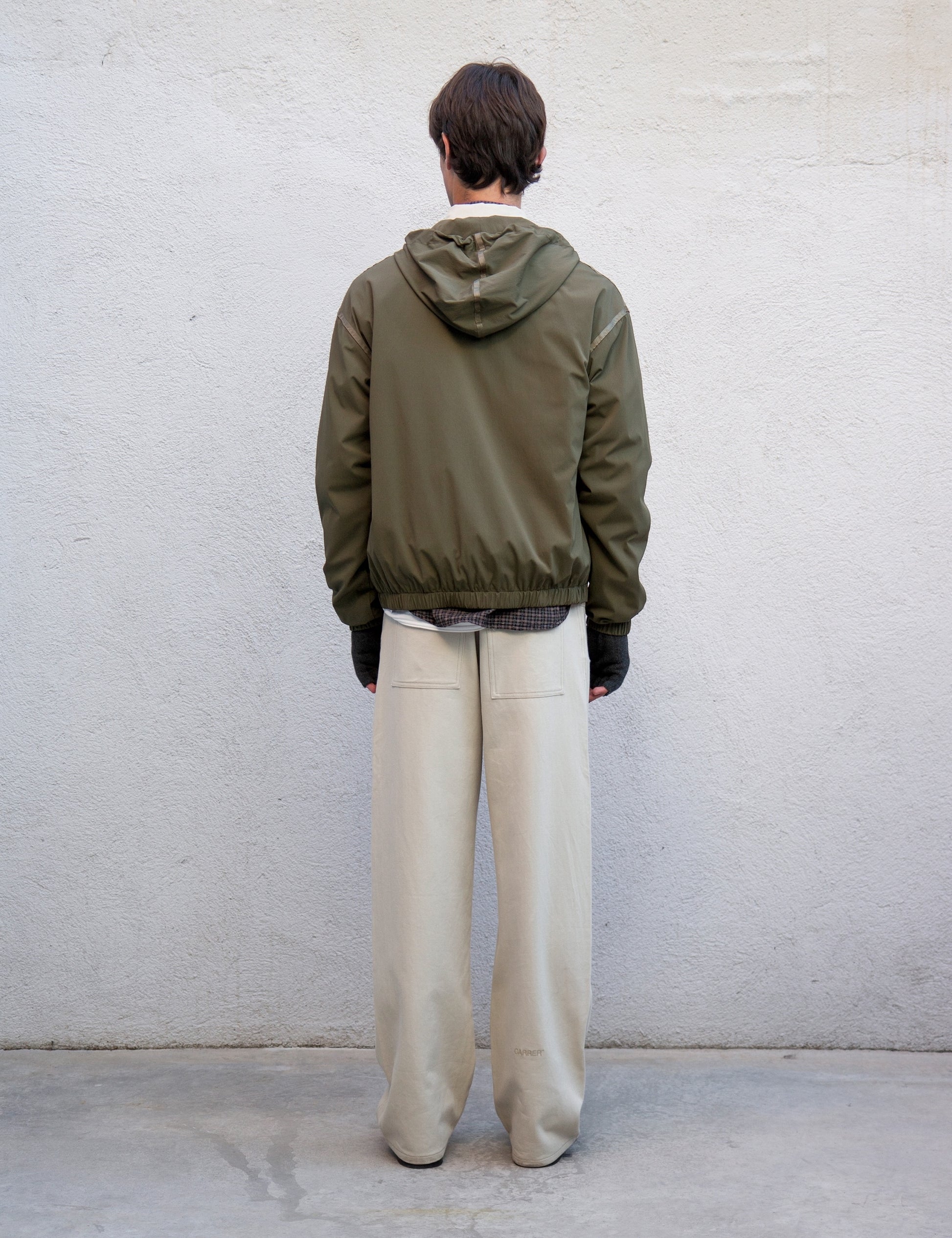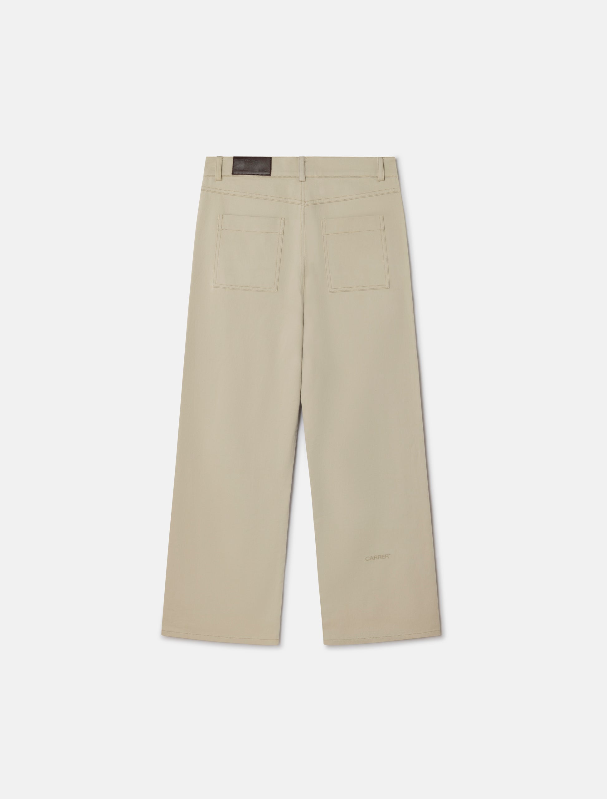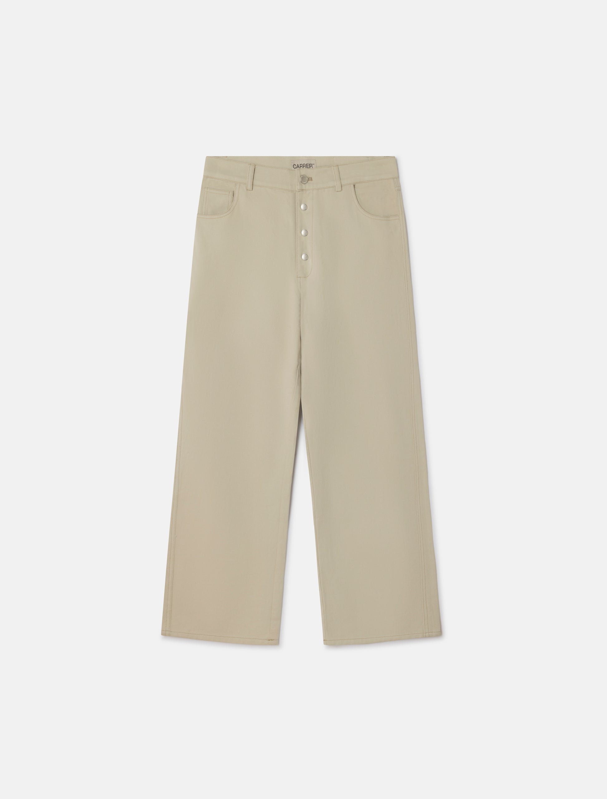 Una nueva silueta en nuestra colección de pantalones confeccionados en sarga gruesa. Apertura con botones a presión de inspiración vintage.