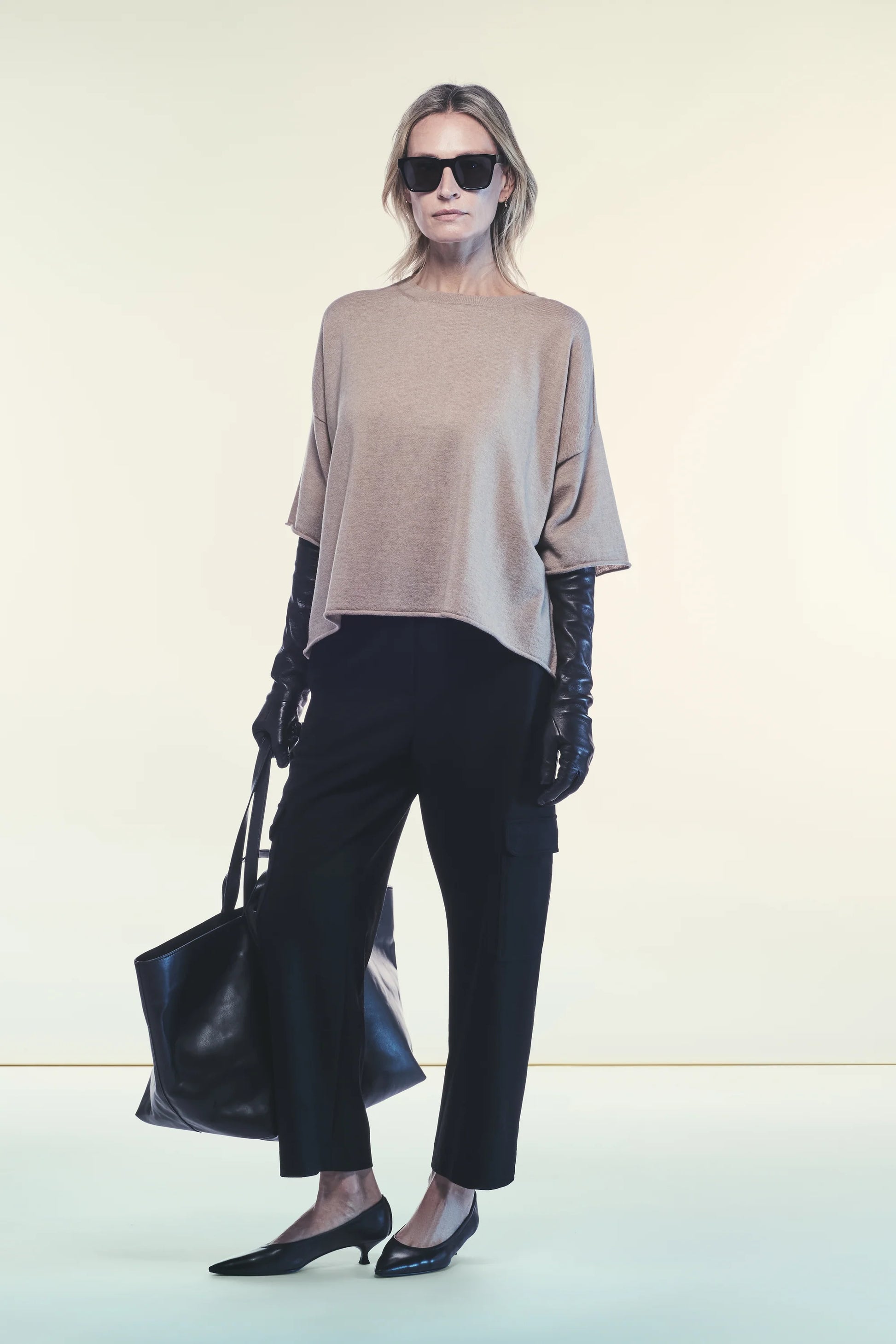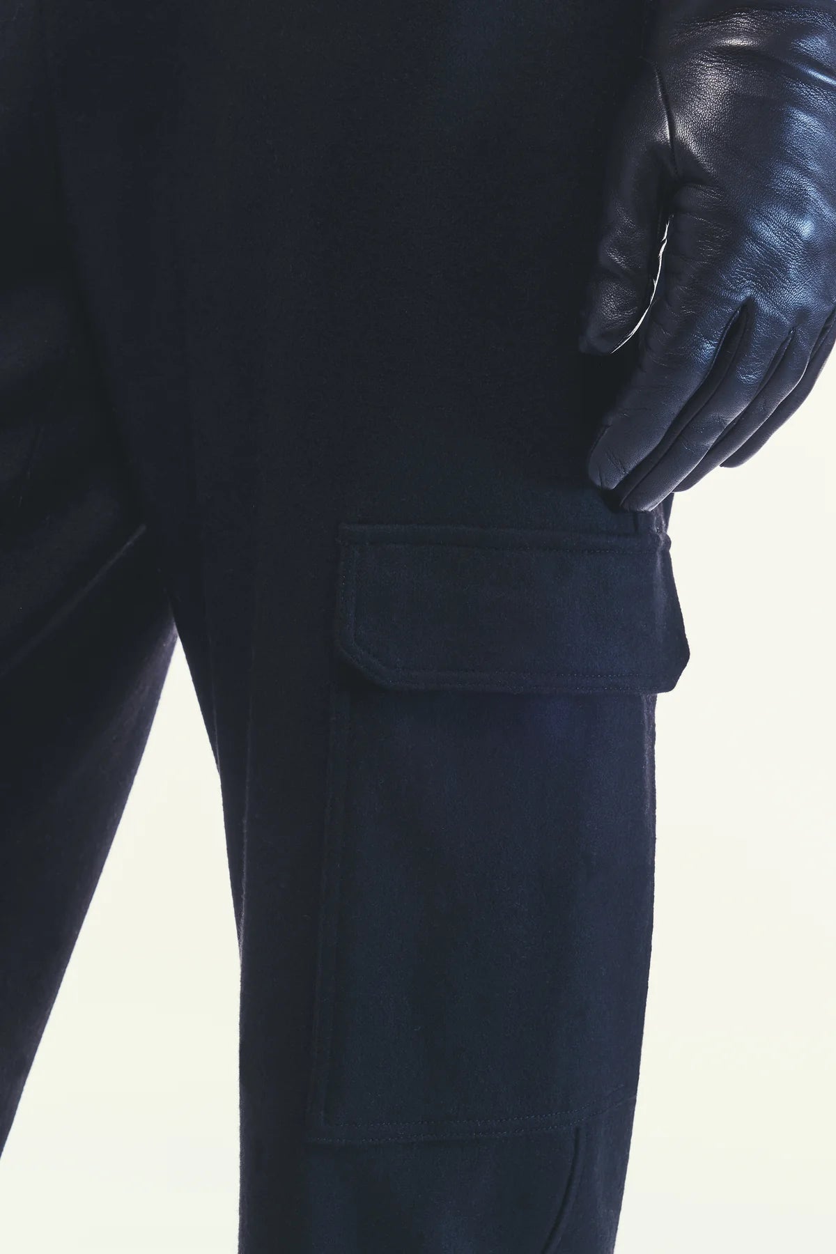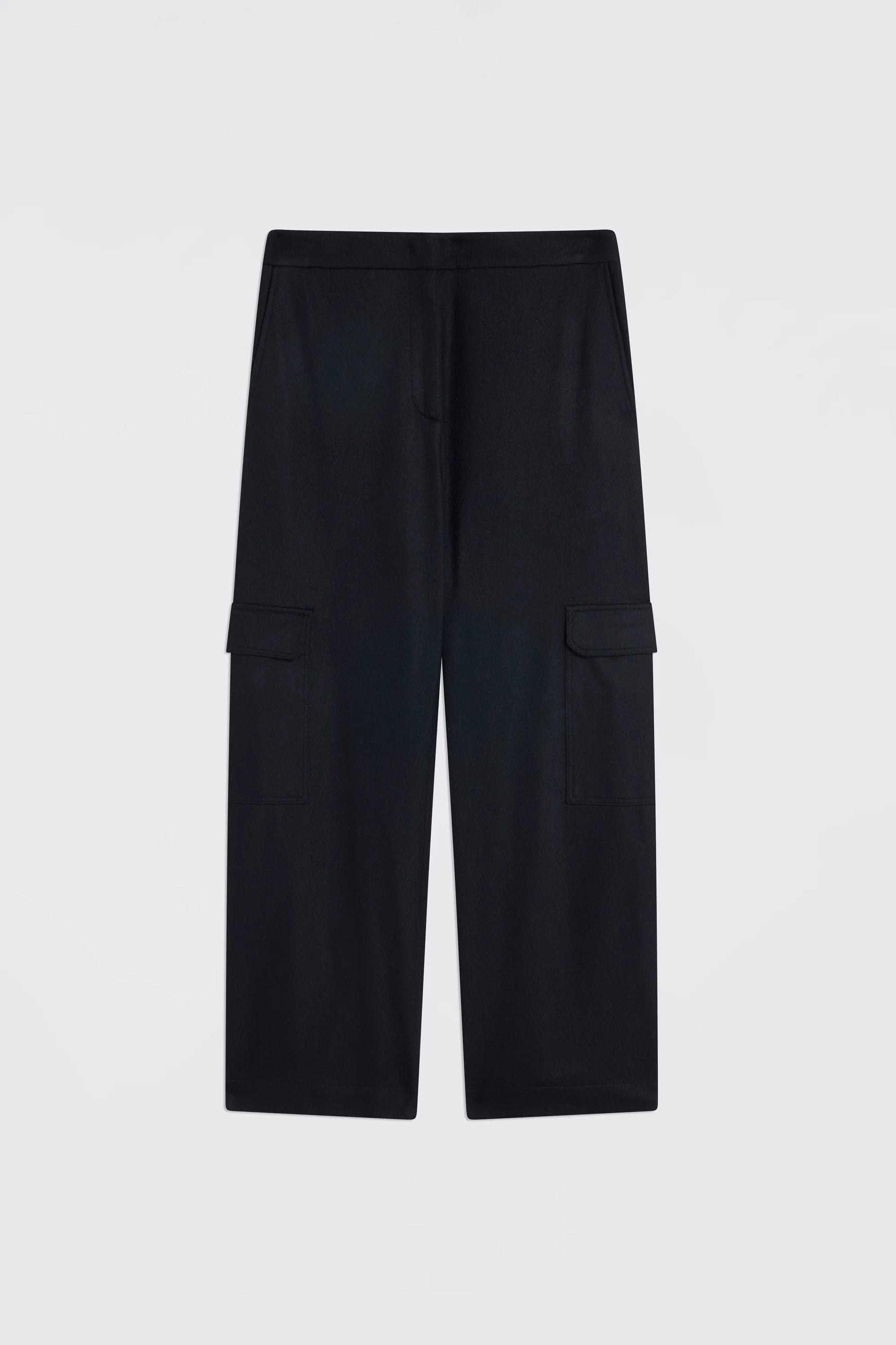 Pantalones cargo en tejido de cachemira negro claro. Corte recto, cintura alta, bolsillos cargo laterales con solapa y botón a presión. Cierre con cremallera y botón. Longitud hasta el tobillo.