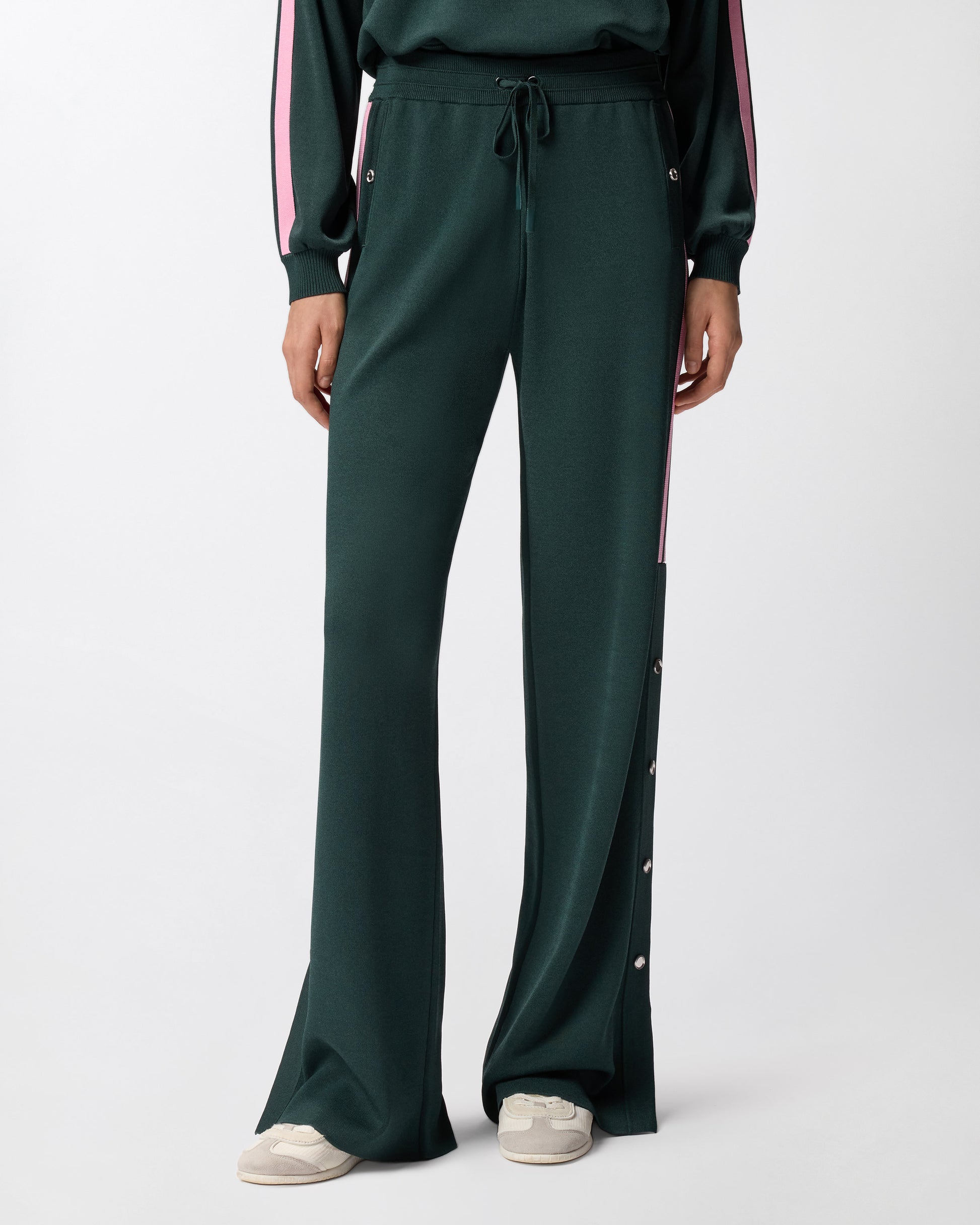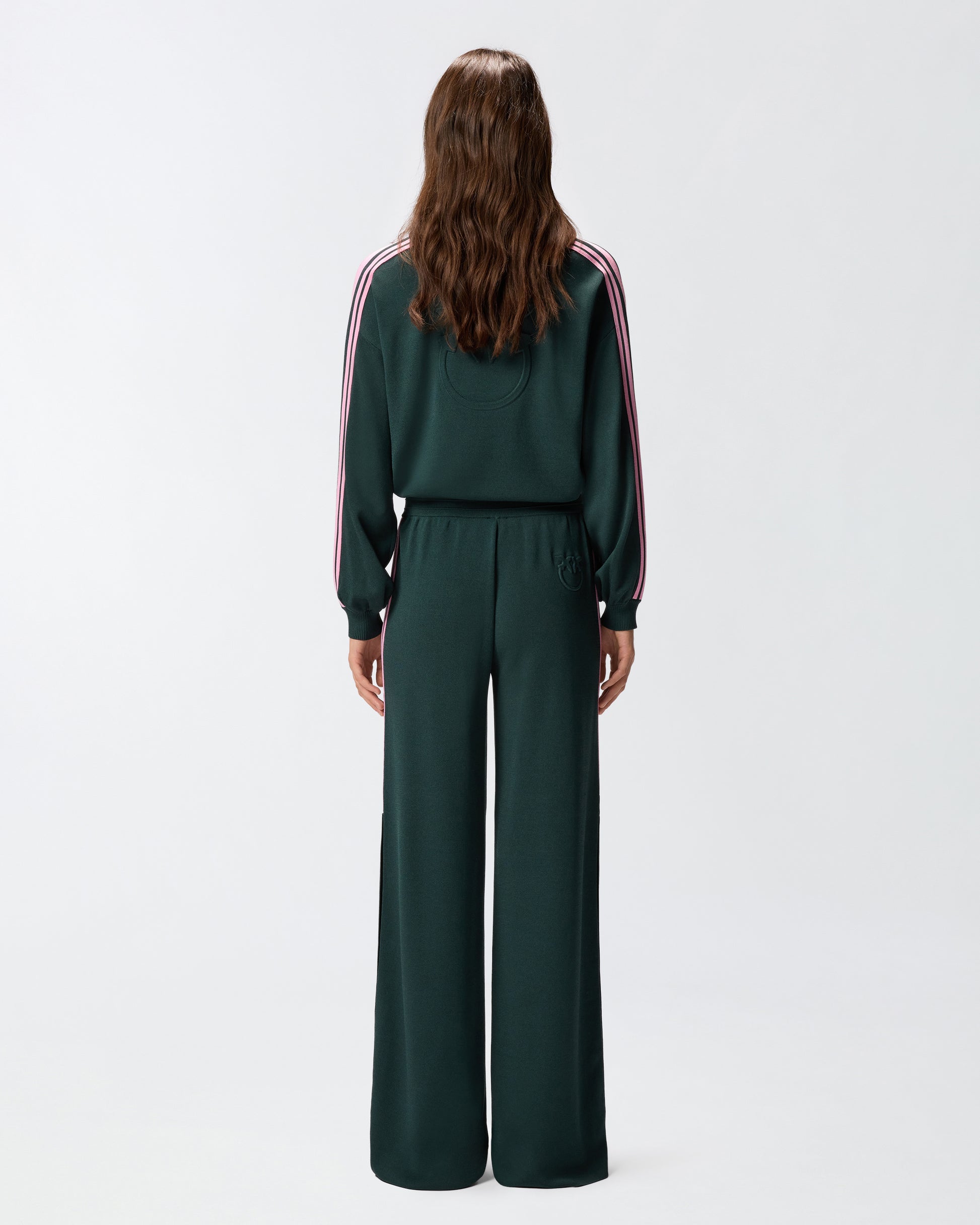 Pantalones deportivos estilo chándal de piqué efecto felpa técnica, con prácticos bolsillos laterales y perfilados por una banda lateral en contraste a lo largo de la pernera amplia.