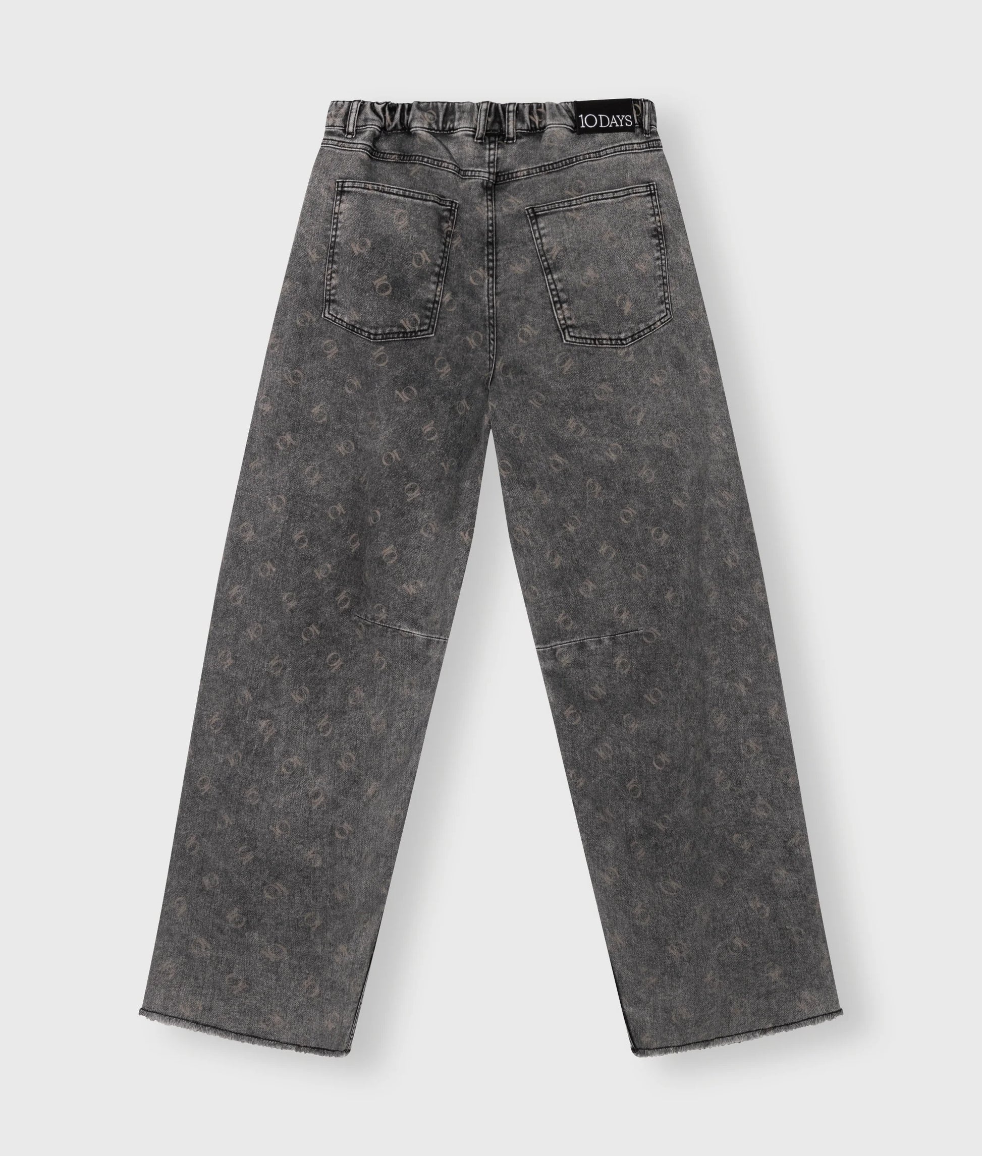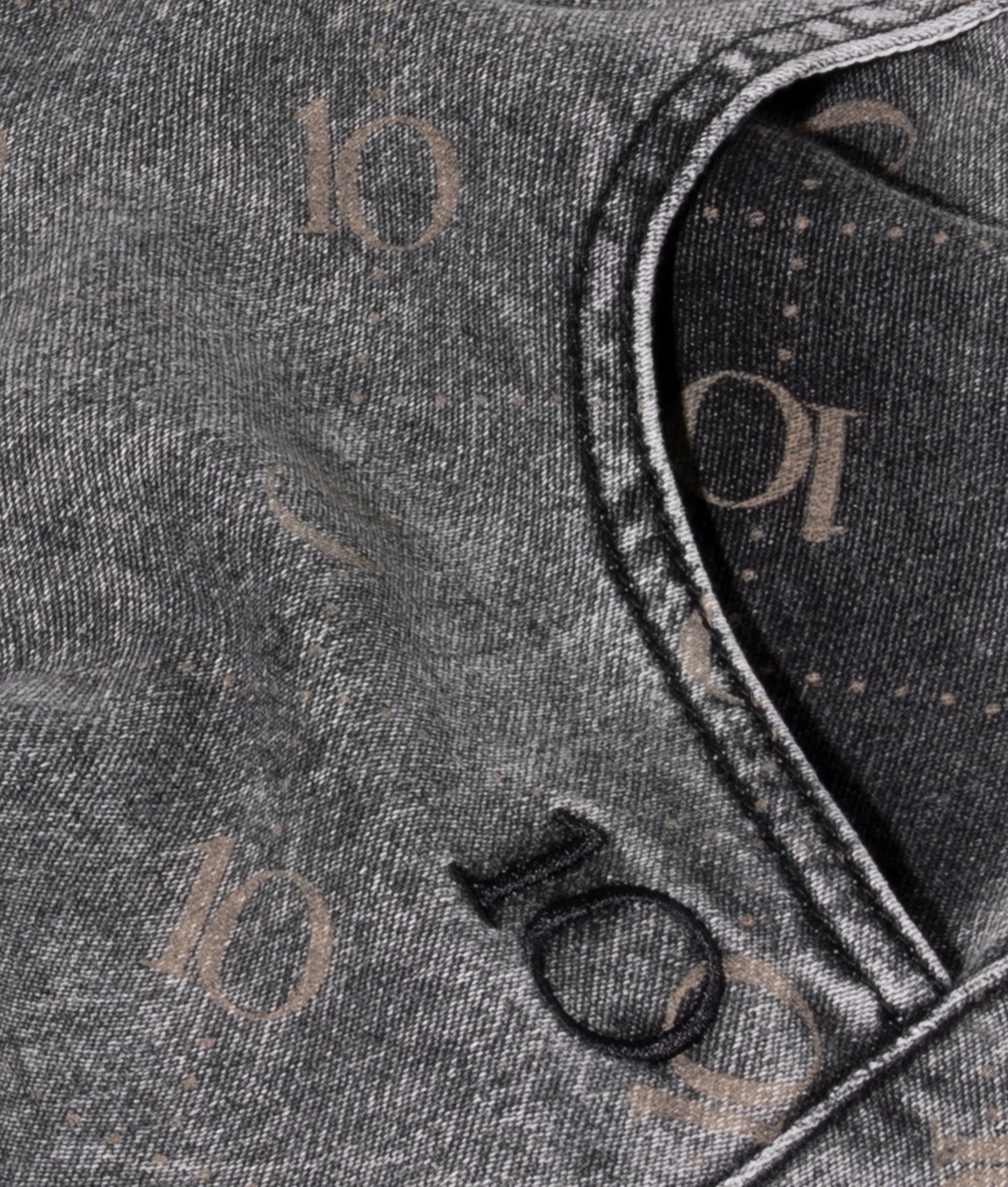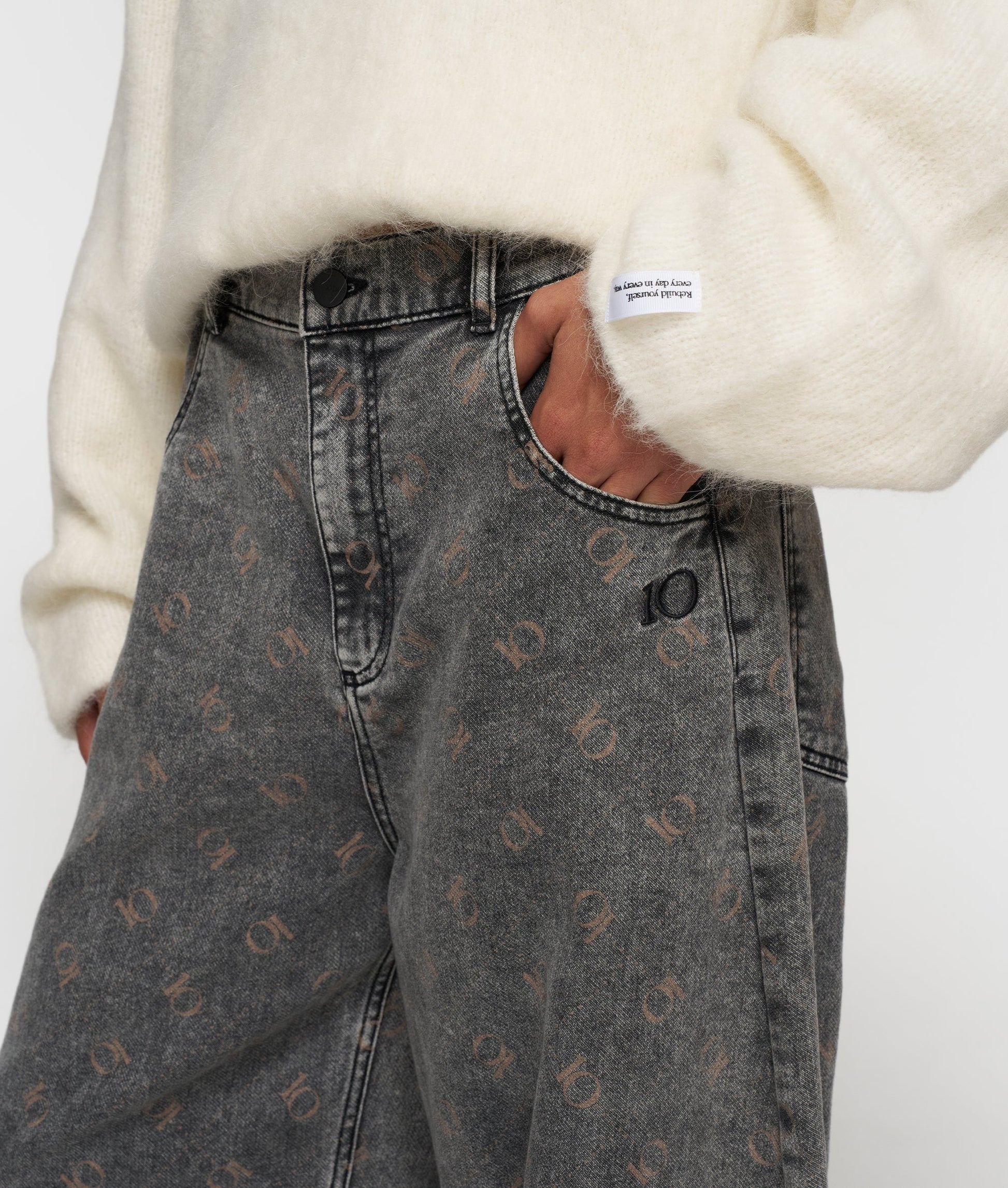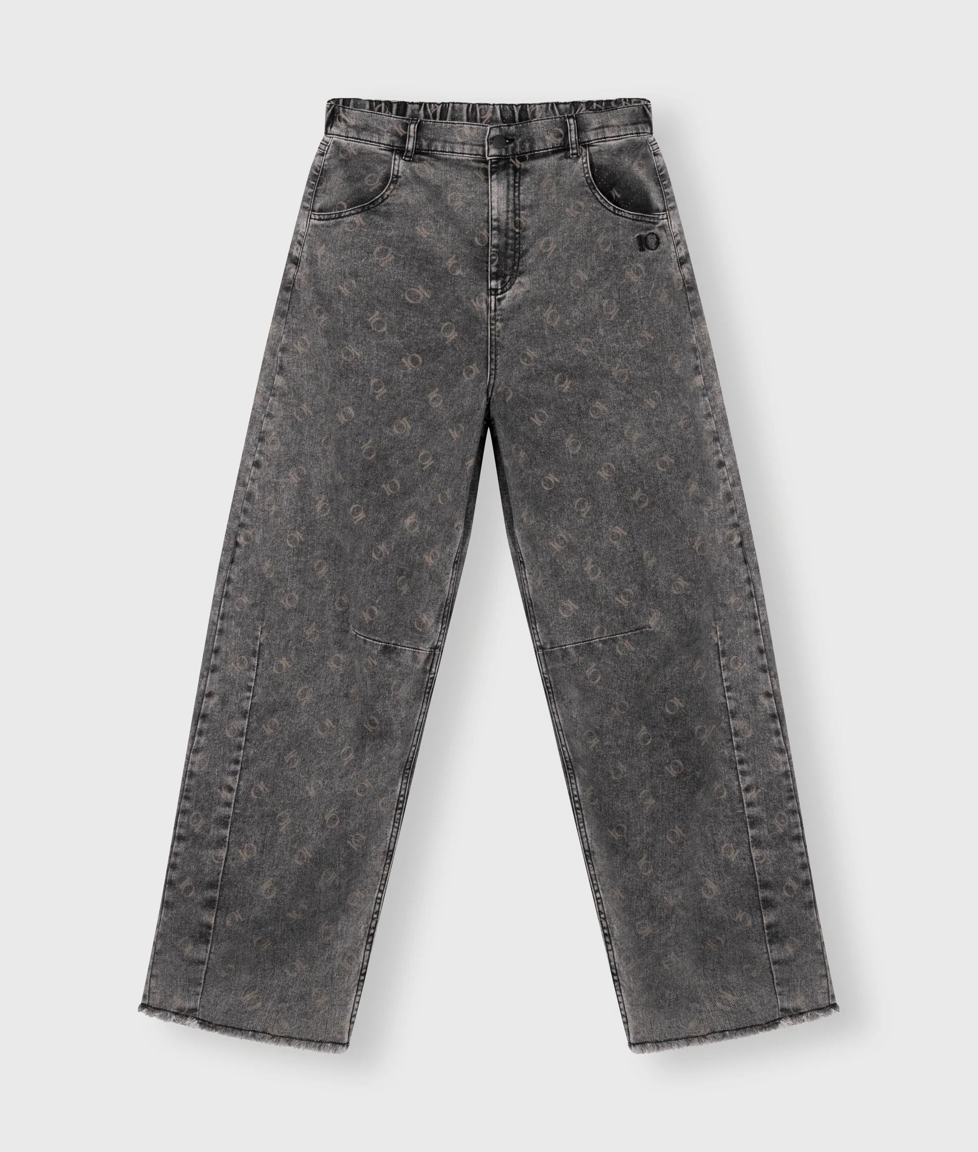 Pantalones western oversize de pierna ancha con estampado monograma, confeccionados en suave algodón. Cuentan con cintura elástica en la parte trasera y cierre con botón y cremallera, trabillas, bolsillos delanteros, bolsillos traseros de parche, un bordado con el monograma «10» debajo del bolsillo delantero izquierdo, costuras en las esquinas a lo largo de las piernas y dobladillo sin rematar.