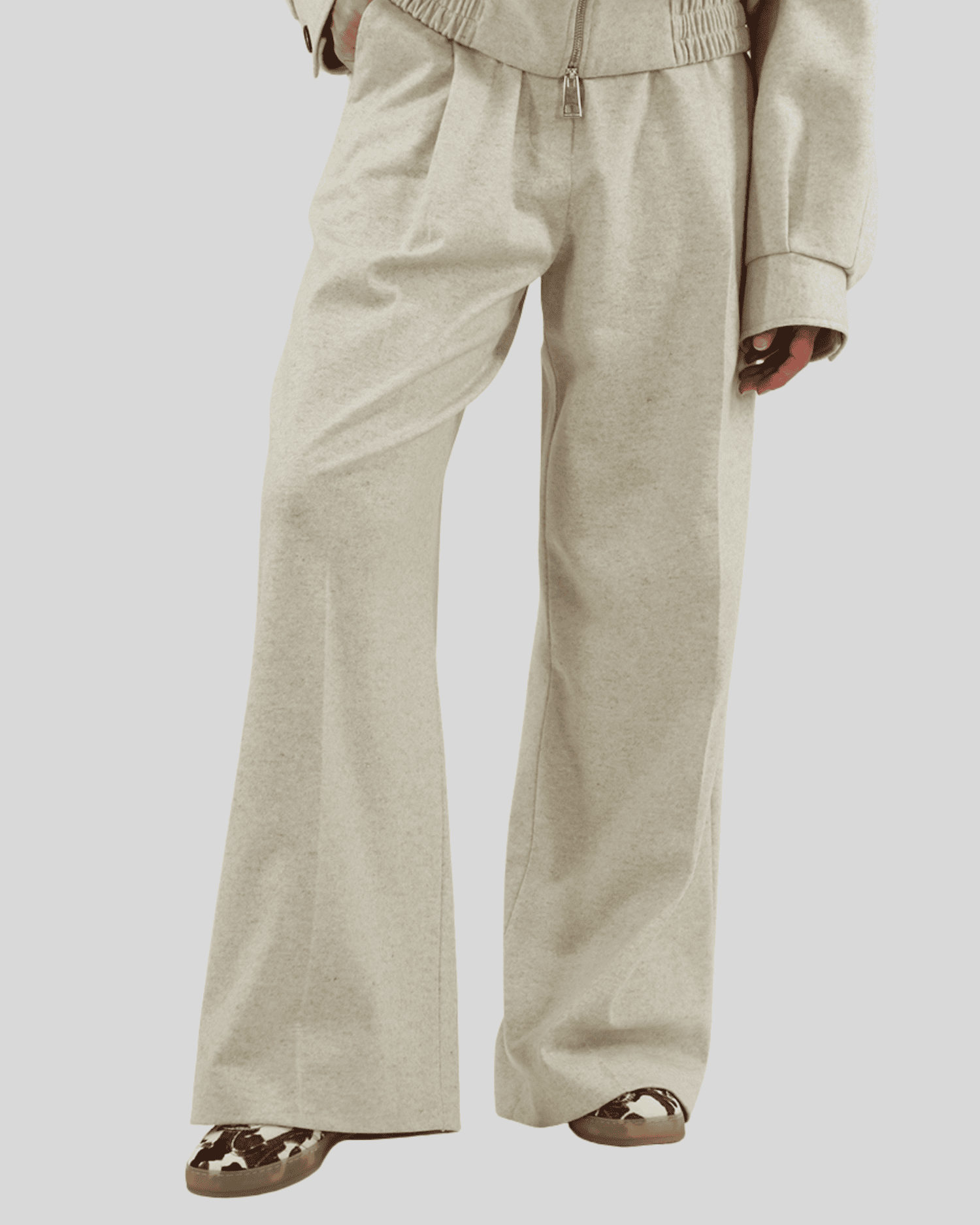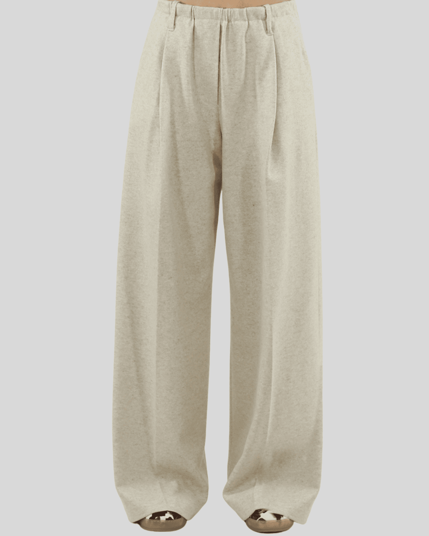 Pantalones fluidos fabricados en un tejido ligero de cachemira. Cintura alta y elástica, bolsillos laterales y pinzas en la cintura.