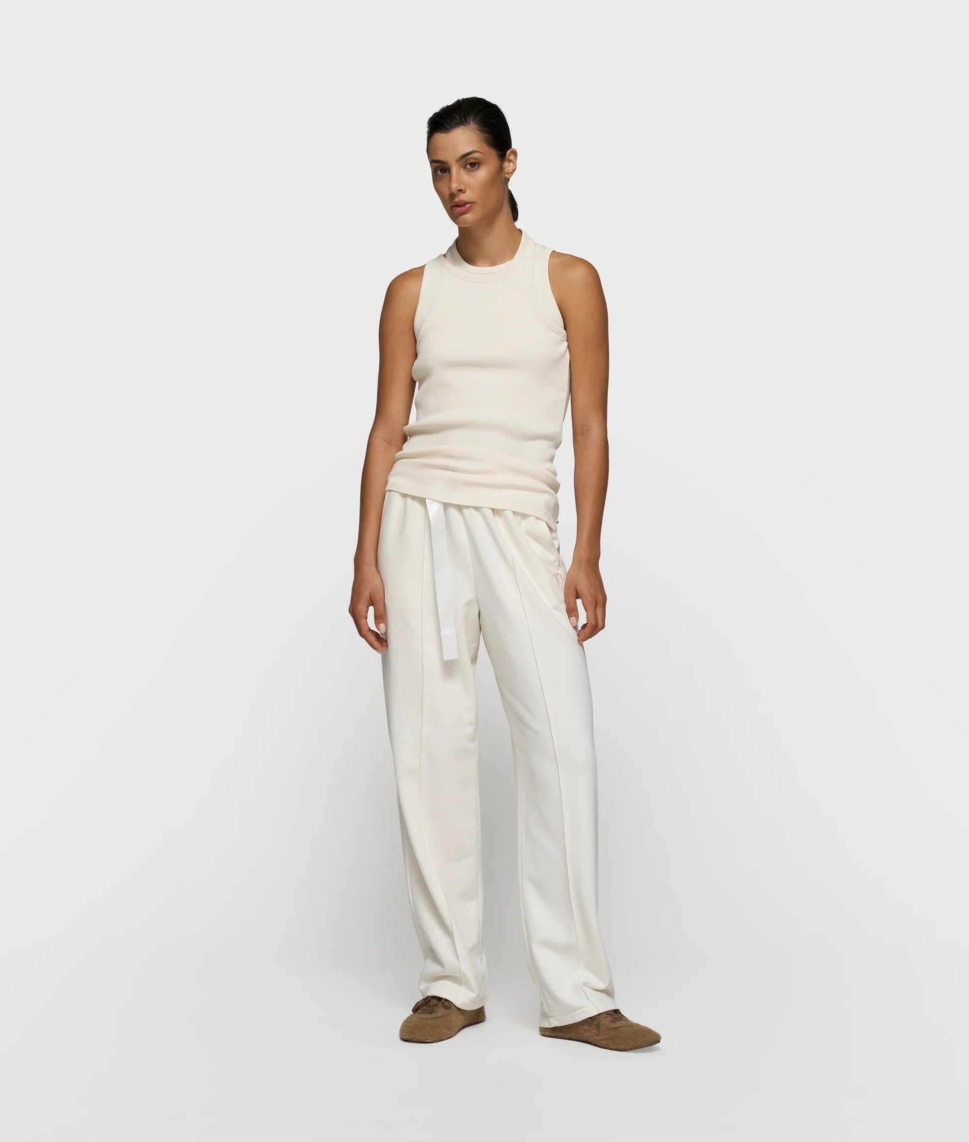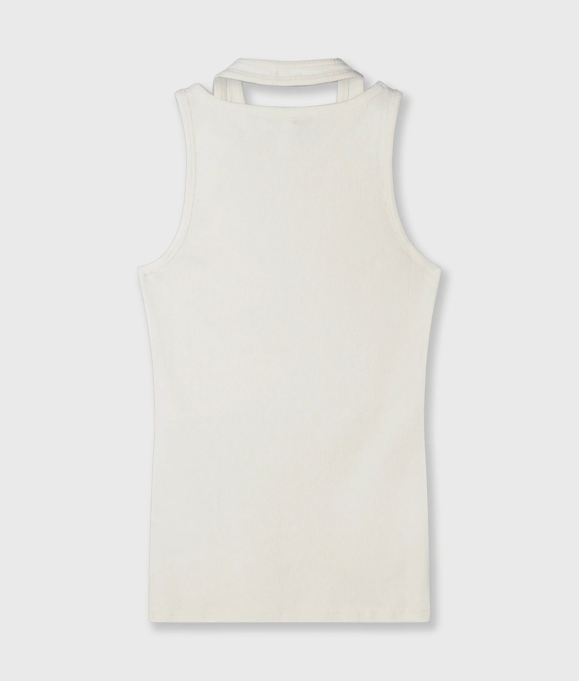Top asimétrico de corte ajustado, confeccionado en jersey de canalé de algodón orgánico con certificación GOTS. Presenta un cuello de doble canalé, una etiqueta con dos rayas en el dobladillo y un «10 rizado» en el pecho.